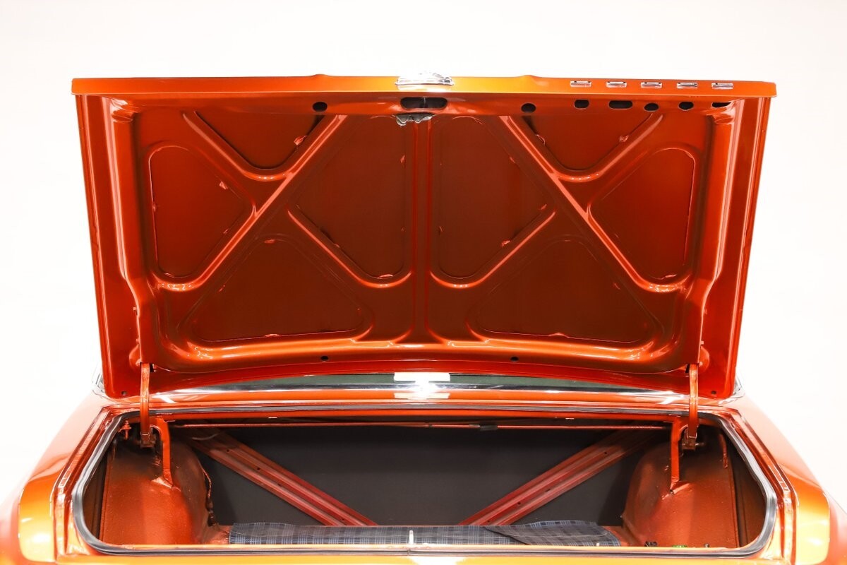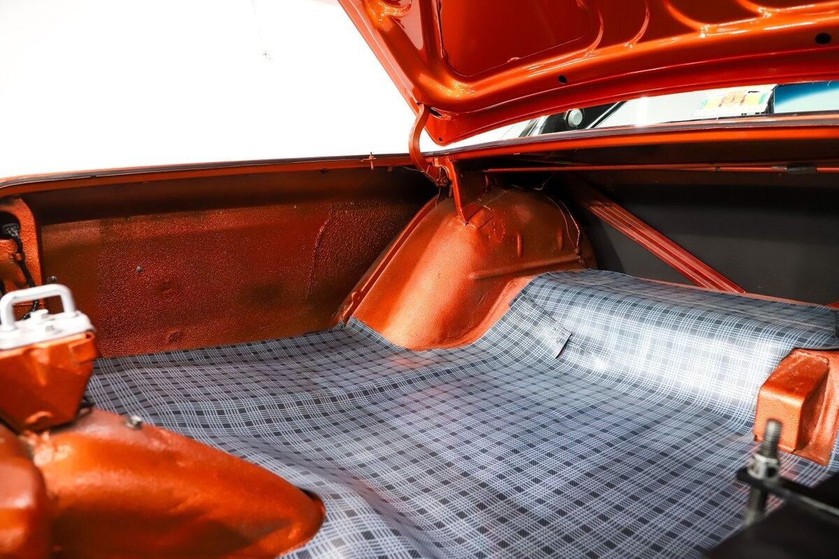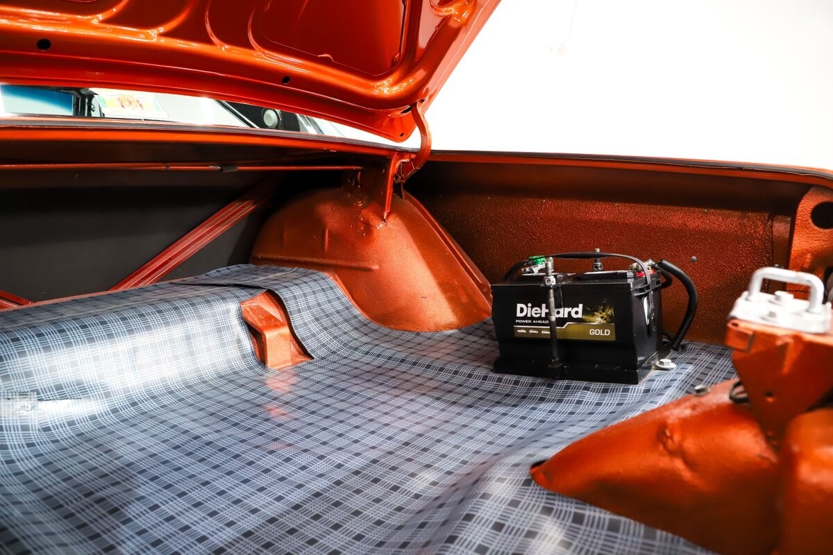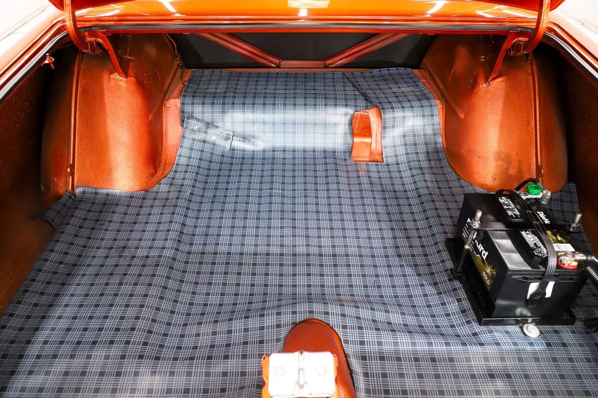 TRUNK COMPARTMENT: Rock solid metal. The entire trunk compartment is painted copper. The battery is relocated to the trunk and has a disconnect switch. The mat and weatherstrip are in excellent shape.