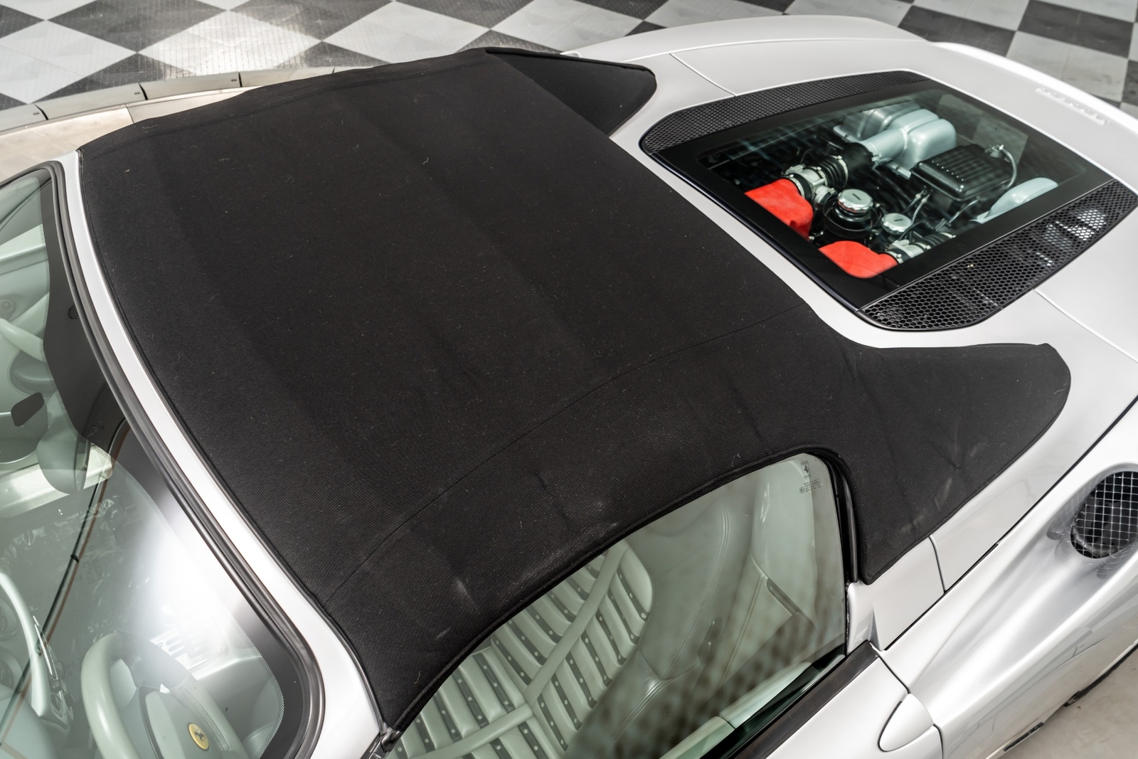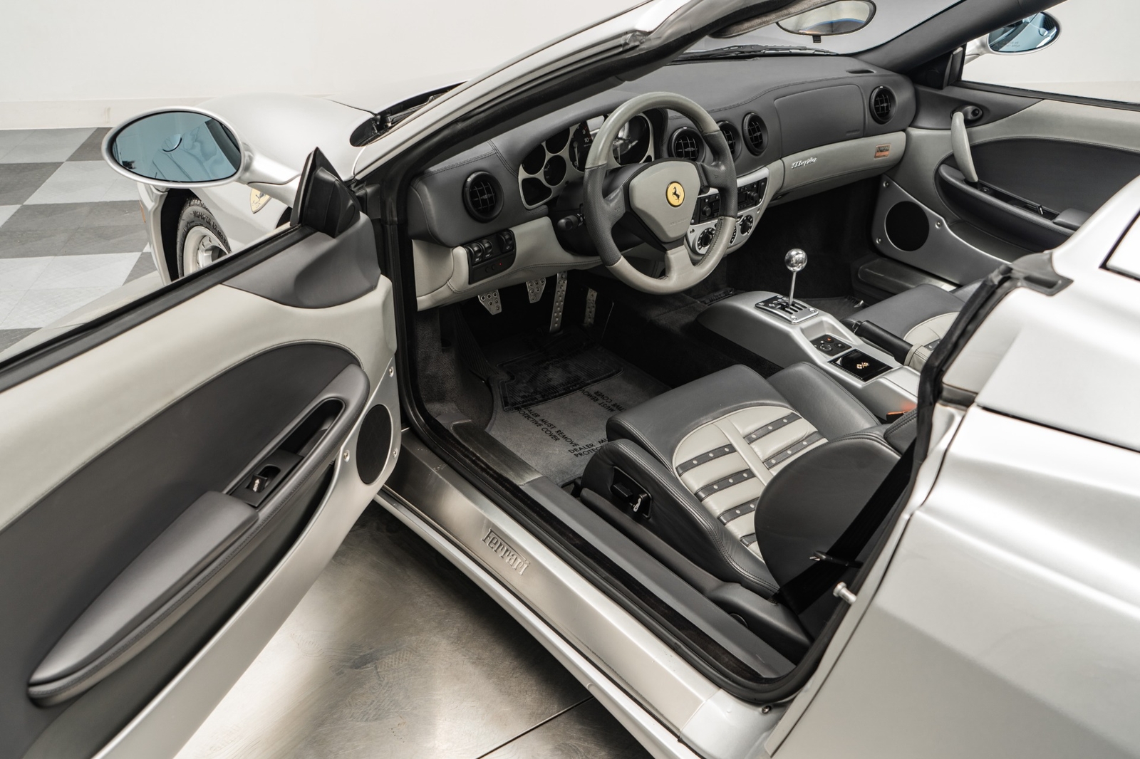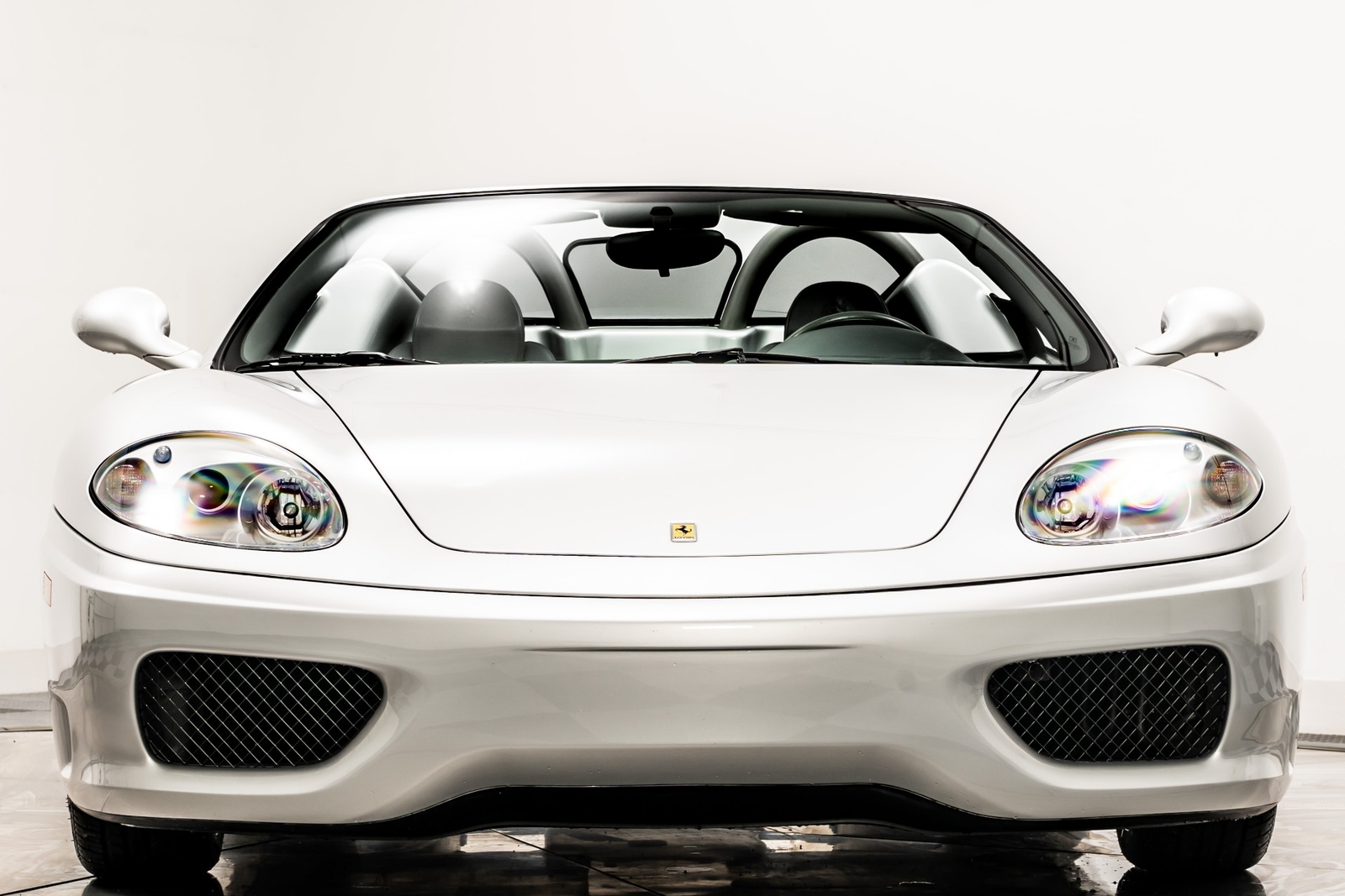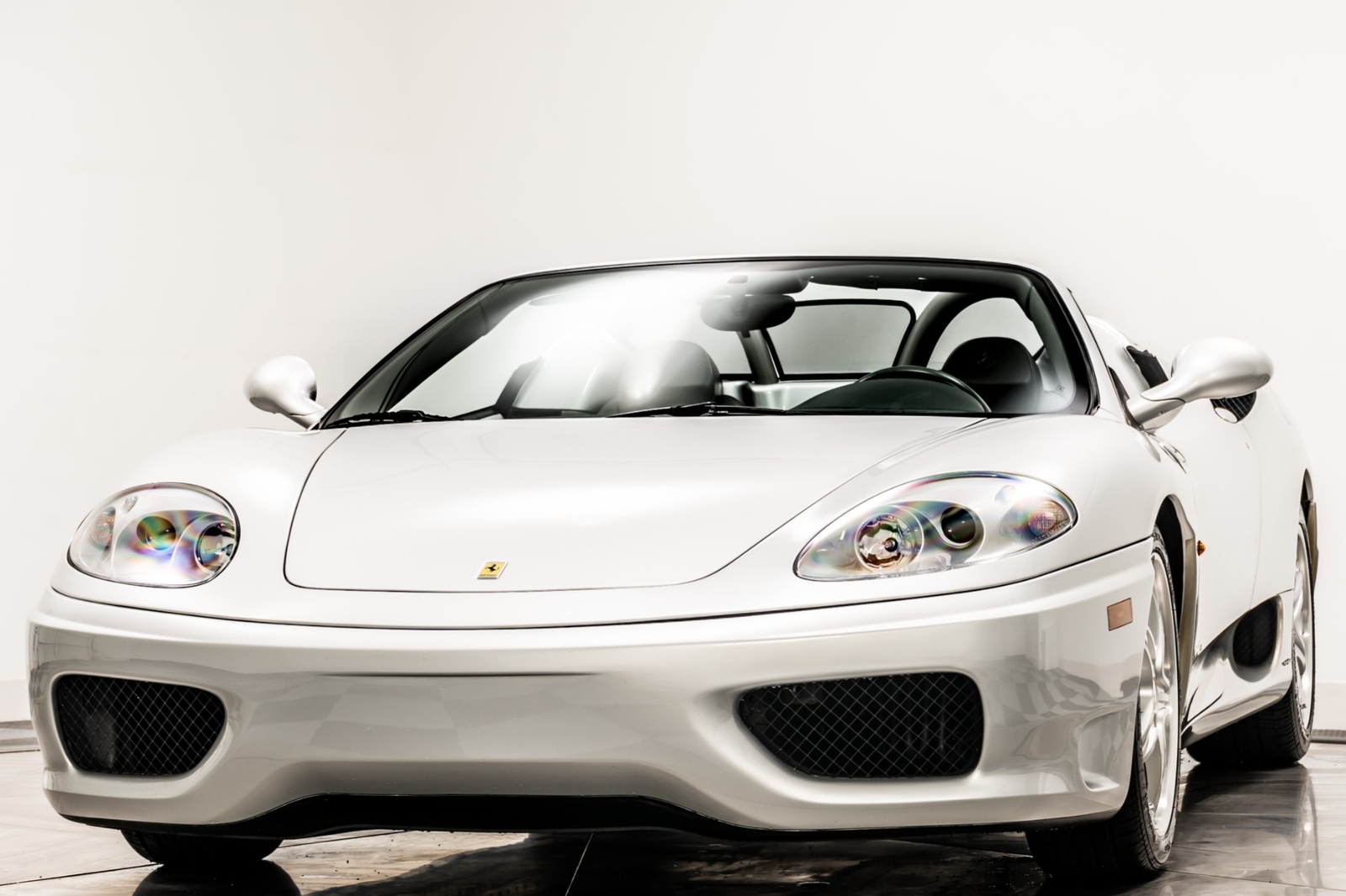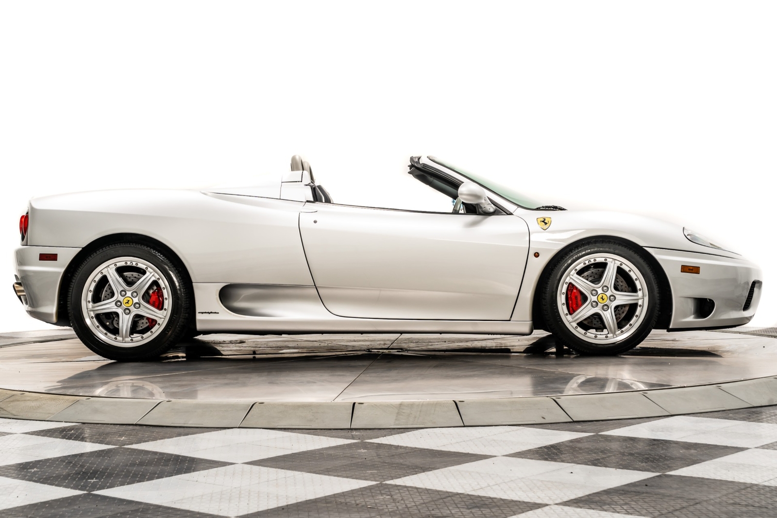 We have just added to our extensive exotic car inventory a beautiful 2003 Ferrari 360 Spider in Argento Nurburgring with Grigio Scuro leather interior and only 9,407 miles. This 360 is equipped with: 3.6 Liter 5 valve V8, RARE 6 speed manual transmission, dedication plate, red brake calipers, 18 inch modular wheels, Challenge style rear grille, Challenge style front grille inserts, high power HiFi, power seats with Daytona style seat upholstery, Daytona inserts in Grigio, upper dash in Grigio Scuro, lower dash in Grigio, two tone steering wheel, roll bar hoops in Grigio, leather rear wall and extended sills, black convertible top and much more. Also included are the tool kit, tire inflator, Charge-O-Mat charger, car cover and service records. A belt and fluid service performed the second week of March 2023 and new tires were installed last fall. We sold this car in the summer of 2007, and it was so nice we kept tabs on it. When it became available again we didn't hesitate to bring it back!
