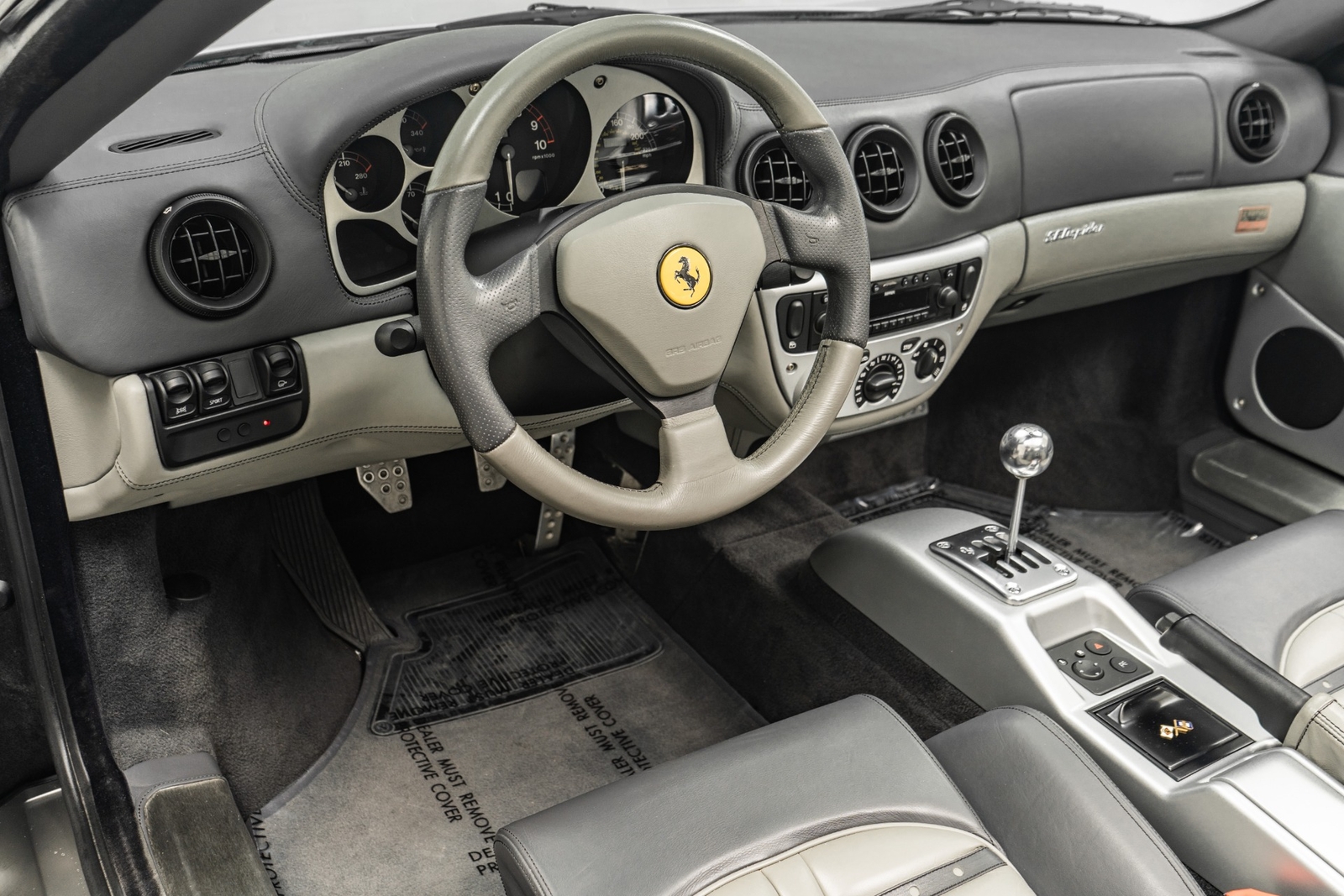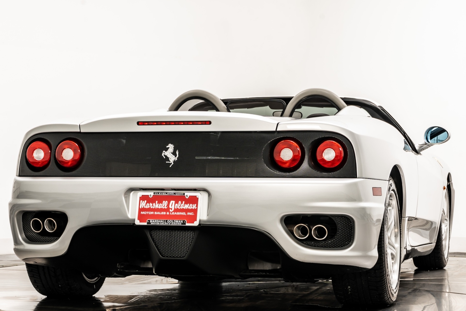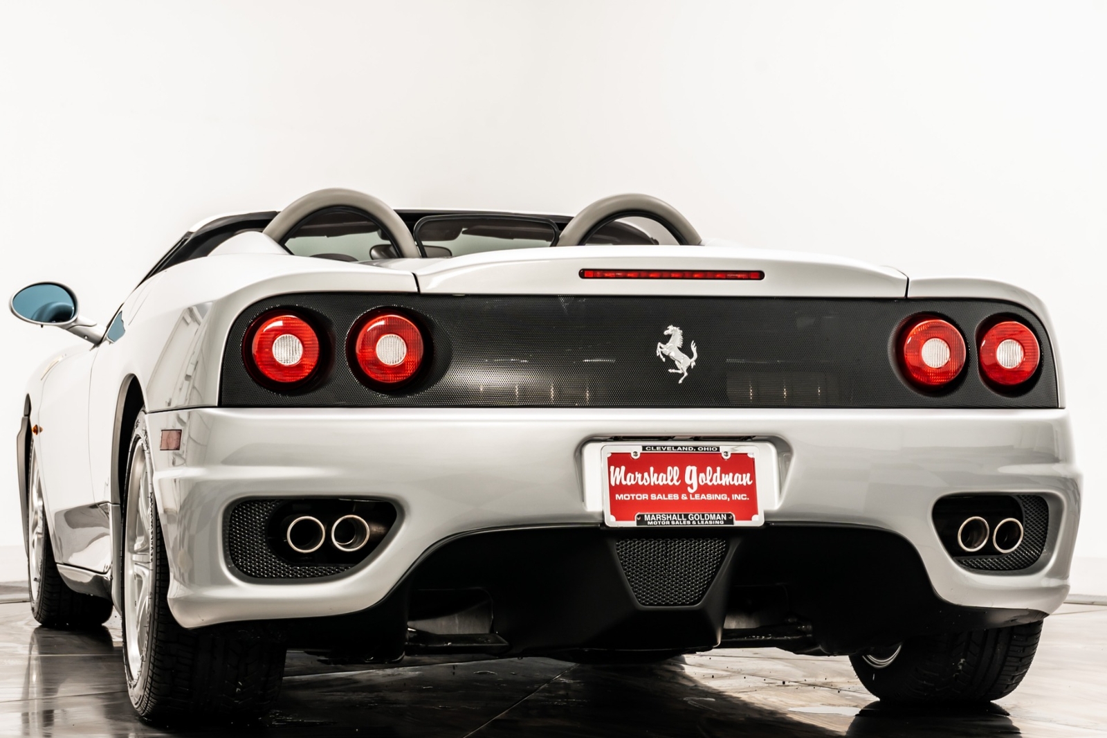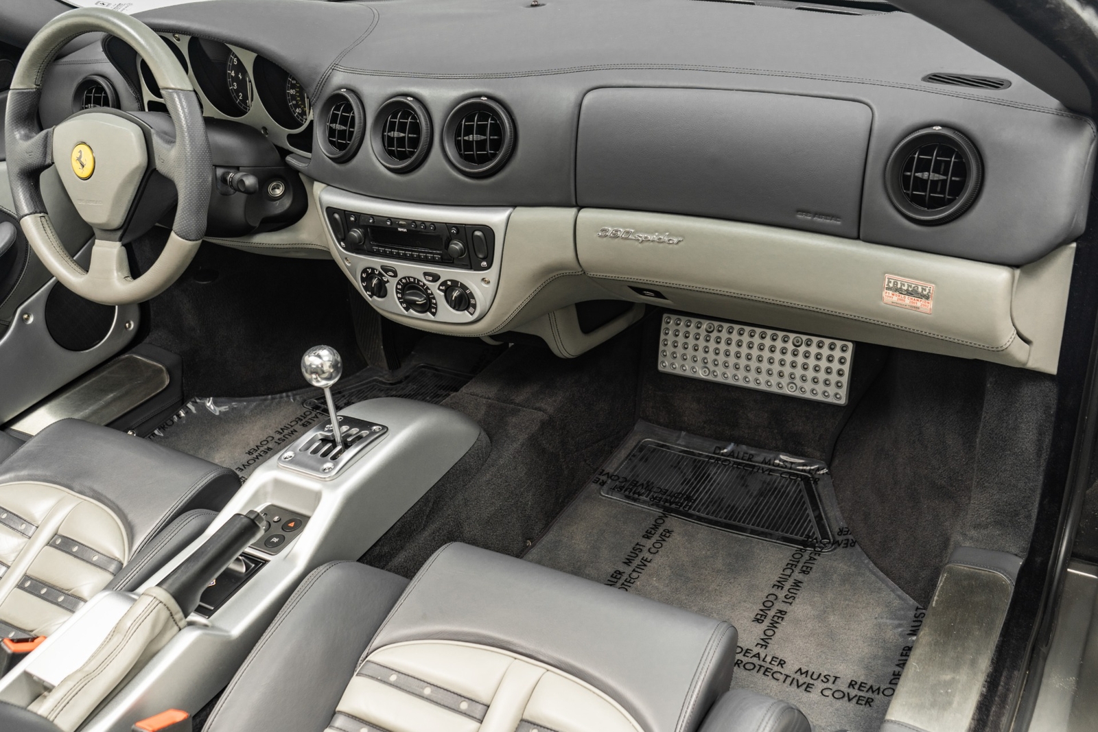 We have just added to our extensive exotic car inventory a beautiful 2003 Ferrari 360 Spider in Argento Nurburgring with Grigio Scuro leather interior and only 9,407 miles. This 360 is equipped with: 3.6 Liter 5 valve V8, RARE 6 speed manual transmission, dedication plate, red brake calipers, 18 inch modular wheels, Challenge style rear grille, Challenge style front grille inserts, high power HiFi, power seats with Daytona style seat upholstery, Daytona inserts in Grigio, upper dash in Grigio Scuro, lower dash in Grigio, two tone steering wheel, roll bar hoops in Grigio, leather rear wall and extended sills, black convertible top and much more. Also included are the tool kit, tire inflator, Charge-O-Mat charger, car cover and service records. A belt and fluid service performed the second week of March 2023 and new tires were installed last fall. We sold this car in the summer of 2007, and it was so nice we kept tabs on it. When it became available again we didn't hesitate to bring it back!