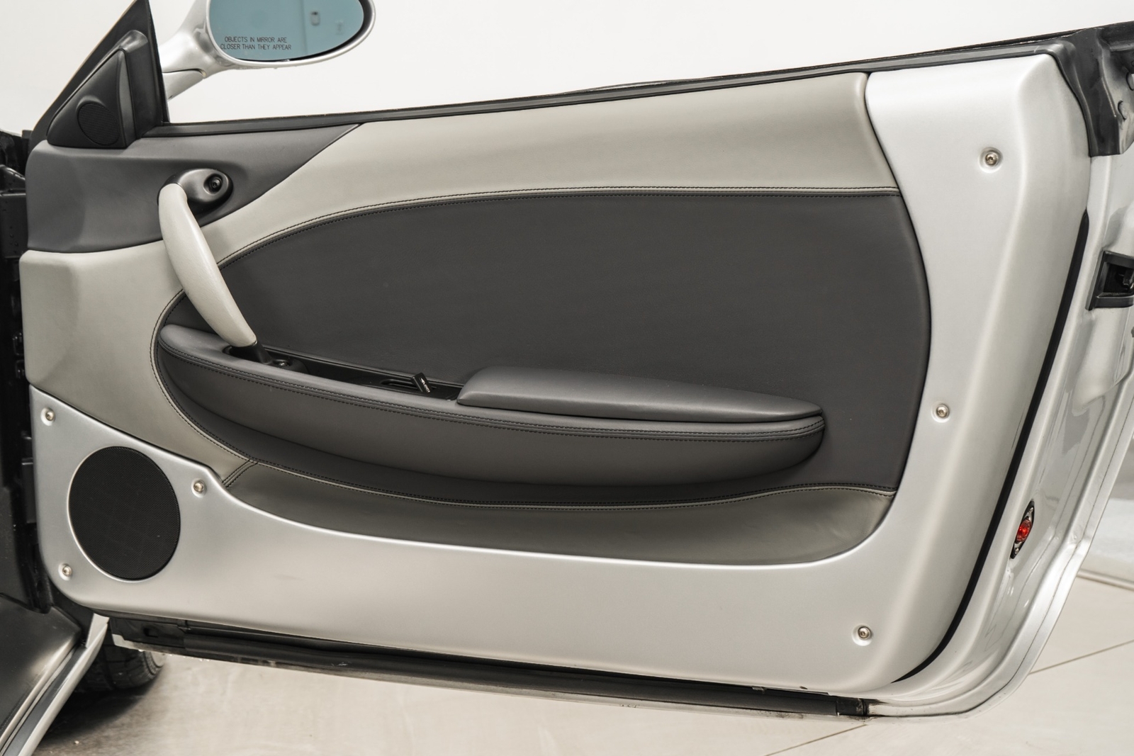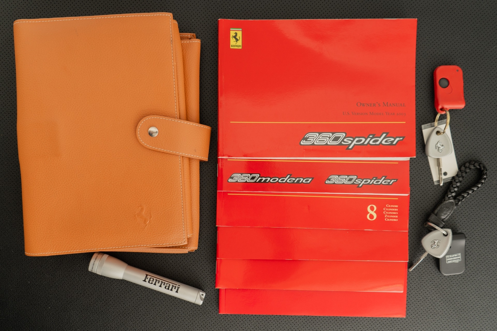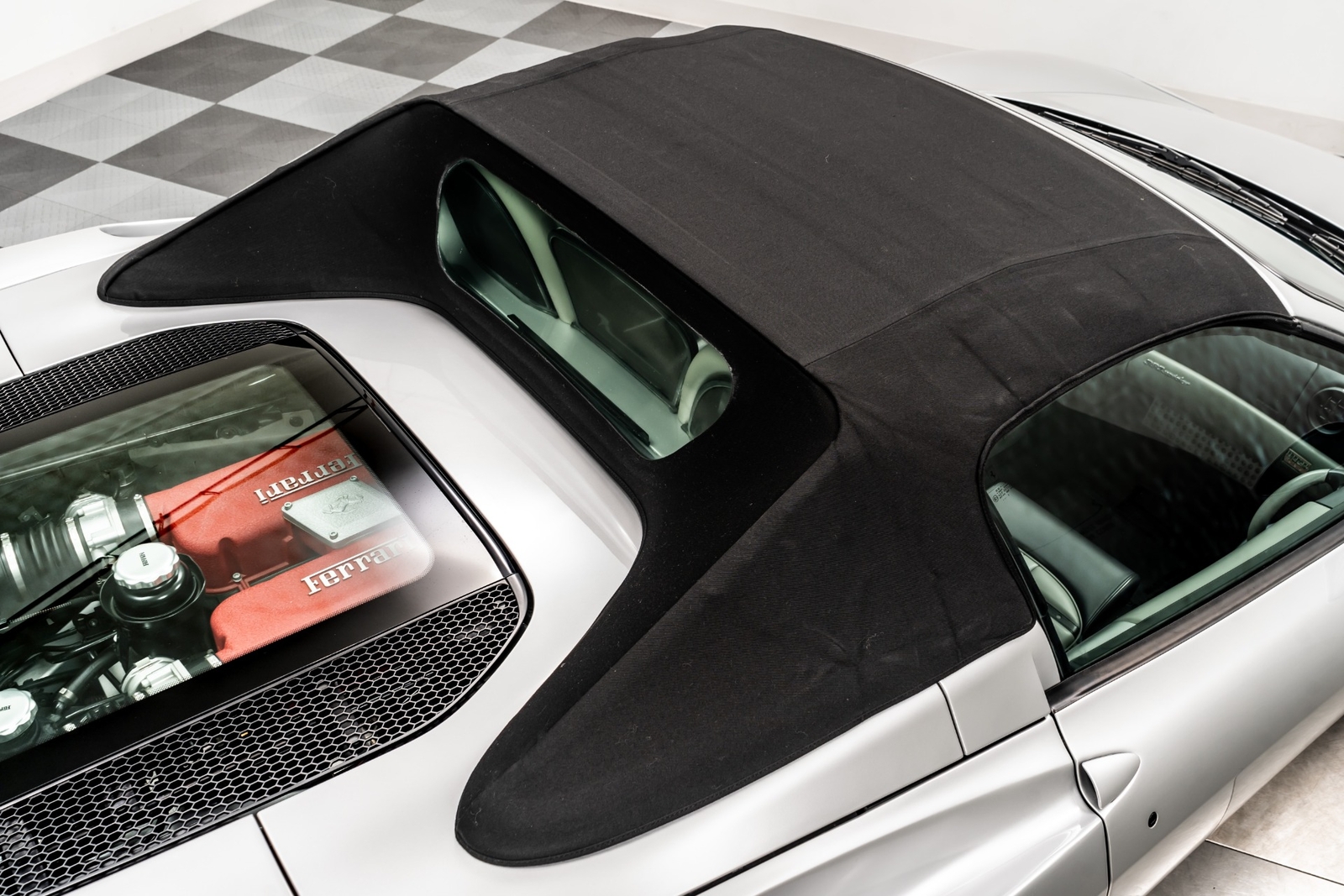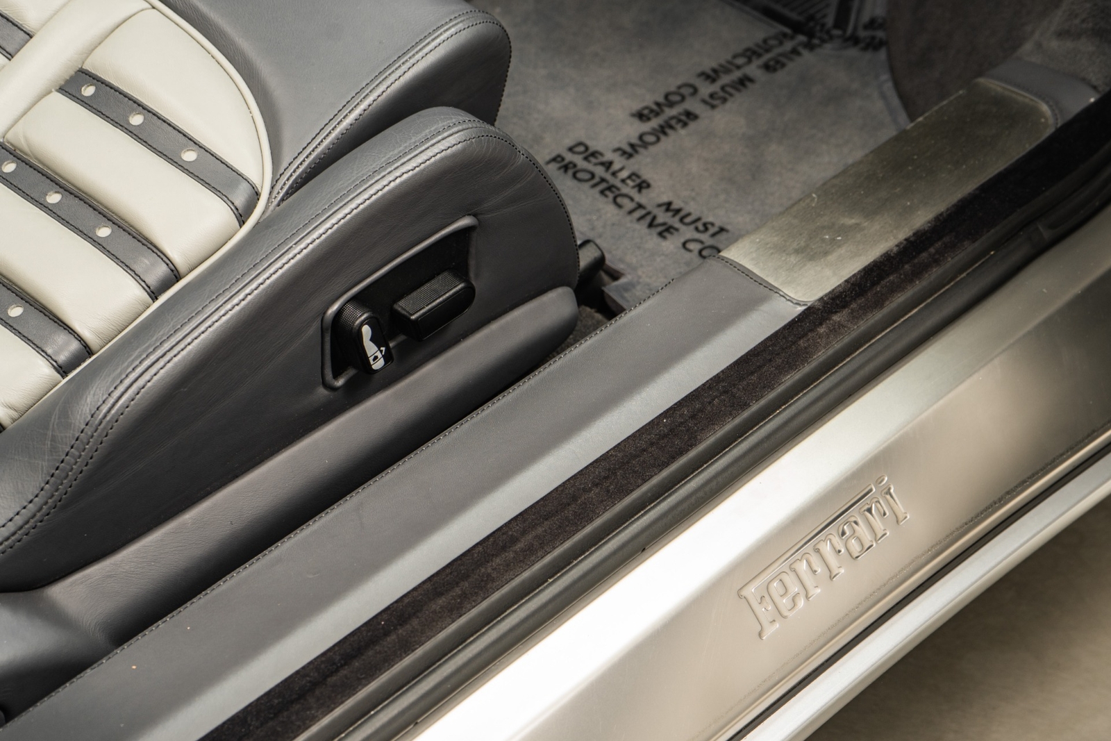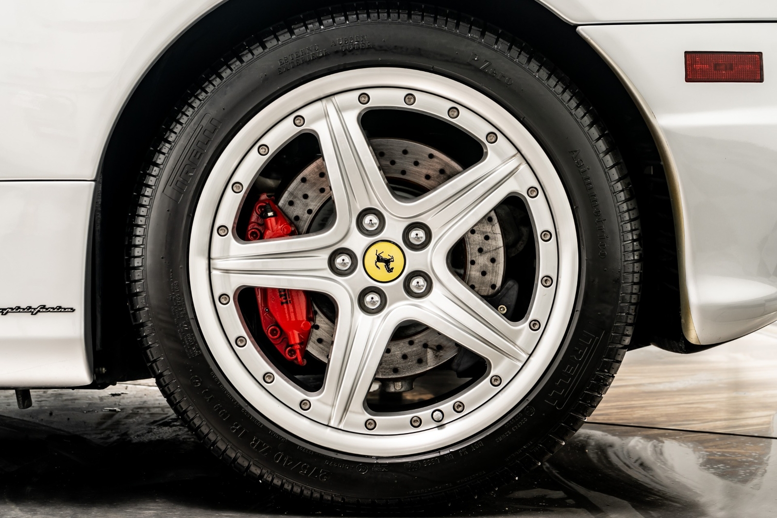 We have just added to our extensive exotic car inventory a beautiful 2003 Ferrari 360 Spider in Argento Nurburgring with Grigio Scuro leather interior and only 9,407 miles. This 360 is equipped with: 3.6 Liter 5 valve V8, RARE 6 speed manual transmission, dedication plate, red brake calipers, 18 inch modular wheels, Challenge style rear grille, Challenge style front grille inserts, high power HiFi, power seats with Daytona style seat upholstery, Daytona inserts in Grigio, upper dash in Grigio Scuro, lower dash in Grigio, two tone steering wheel, roll bar hoops in Grigio, leather rear wall and extended sills, black convertible top and much more. Also included are the tool kit, tire inflator, Charge-O-Mat charger, car cover and service records. A belt and fluid service performed the second week of March 2023 and new tires were installed last fall. We sold this car in the summer of 2007, and it was so nice we kept tabs on it. When it became available again we didn't hesitate to bring it back!
