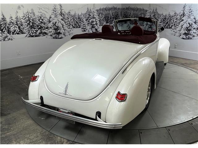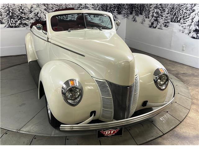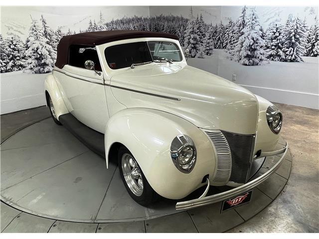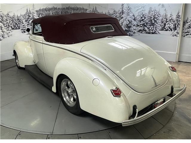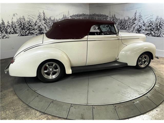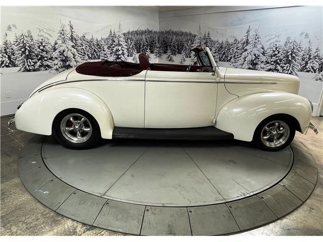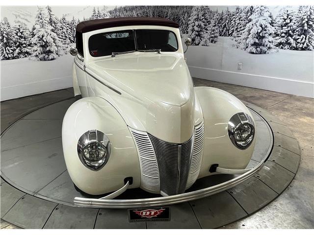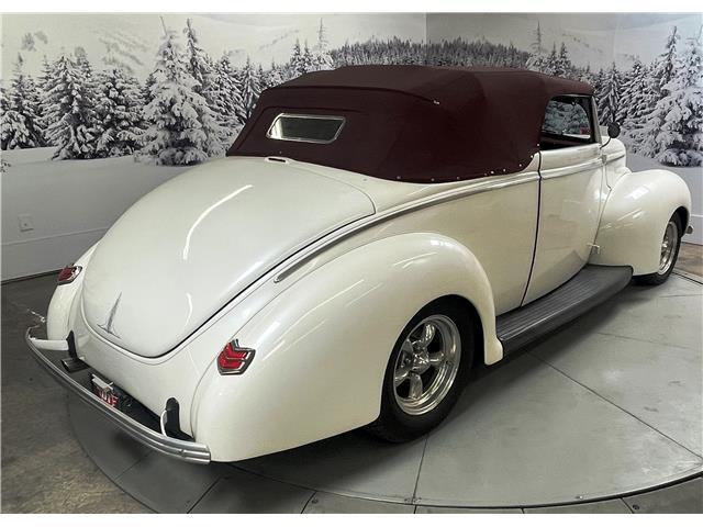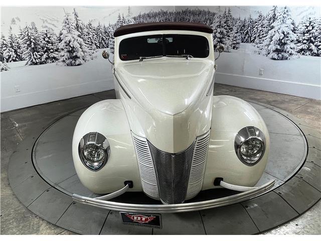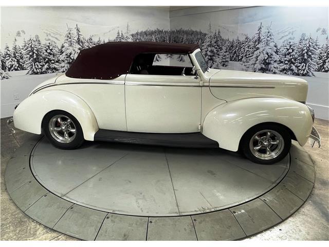 This is an all steel car with a custom 2 inch chop. It has a manual fold down cloth convertible by Hearts top and a matching boot. There is a custom leather interior and square weave carpet. Front bucket seats with power drive, Auto Meter Deco-Gauge cluster, aftermarket tilt column with banjo Billet steering wheel and power windows and tinted glass. This build has a Ron Francis wiring harness, Newport engineering windshield wipers, Vintage Air w/heat. Custom electric hood and trunk releases. All the exterior handles have been shaved so the car has a remote entry. The body has custom treatment from the chop to the shaved handles and the hood and caromed Brizo bumpers. The build was painted with three stage pearl white PPG paint. The car is powered with a small block crate 383 with a color coated TPI fuel injected system pushing a 700 R4 transmission, HPC coated headers, Griffin aluminum radiator. This 40 Ford rides on a mustang two front end w/power steering and power disc brakes with Hydra Boost. Riding on Aladdin adjustable coil over shocks on all four corners and sits on a four Link suspension attached to a 9 inch Ford rear end. Staggered American Torque Thrust II wheels, 15 inch front 16 inch rear.