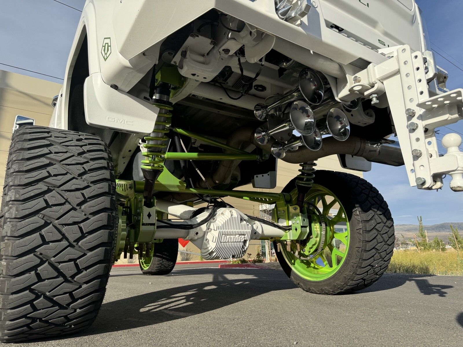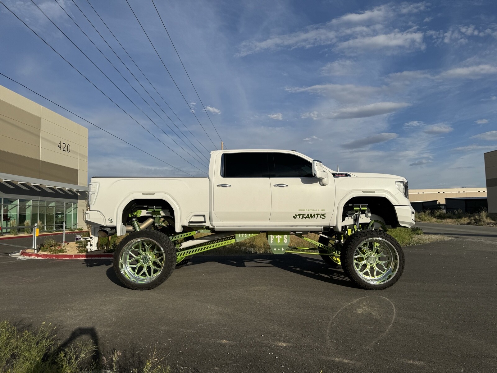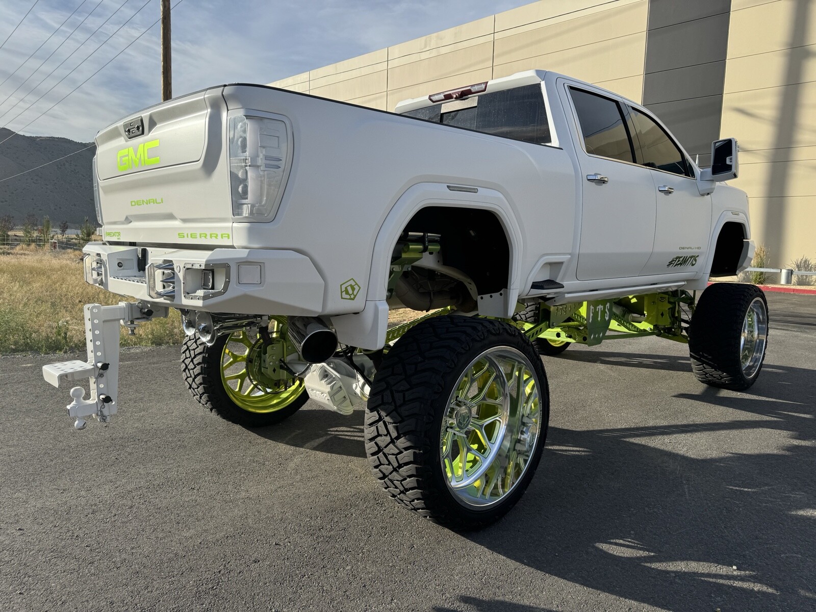 2020 GMC DENALI HD, 22 SEMA truck, 1 Owner, 26.5k miles, 6.6L L5P Duramax diesel, Allison 10 speed transmission, heads up display, Sunroof, window tint 20% and 5%, Avery Dennison Satin white wrap, white frame, 20 inch (FTS) lift kit (King of the bolt ons), box shape track bar upgrade, kryptonite tie rods, Flog steel demon bumpers w/pod upgrades front/back, 30x16 TIS Polished forged wheels, 4216.50 x30 predator new mutant XMT's, 2 inch billet spacers, KapKing floater billet caps, True Spike Lug nuts, 8 piston SSBC Barbarian Brakes, ceramic pads, banks diff cover, Banks catback exhaust, Hornblasters train horns (Admiral), Go recon color matched taillights, color matched headlights white marker switchback, rear view mirrors white lights/switchbacks, white cab lights, 16 Super bright white Rock lights, white wheels rings and pod lights, chrome light up white light grille (All Lighting Trendz), amp electric steps, bulletproof 16 inch drop hitch w/dual ball, have stabilizers never mounted, 4 JL audio w-7 eight inch woofers. Ported box under seat, 3k watt gladen amp, retrax sliding bed cover.