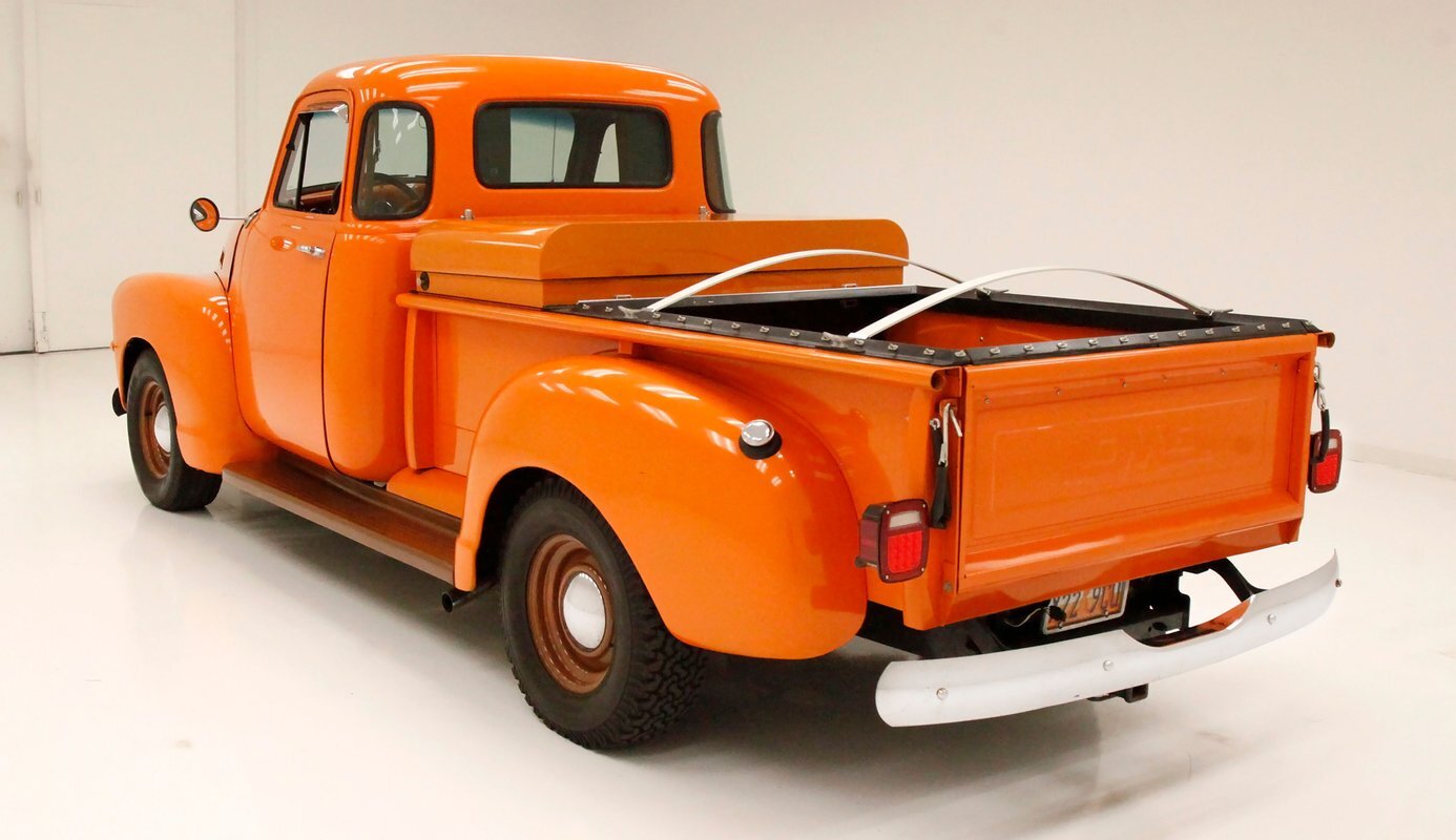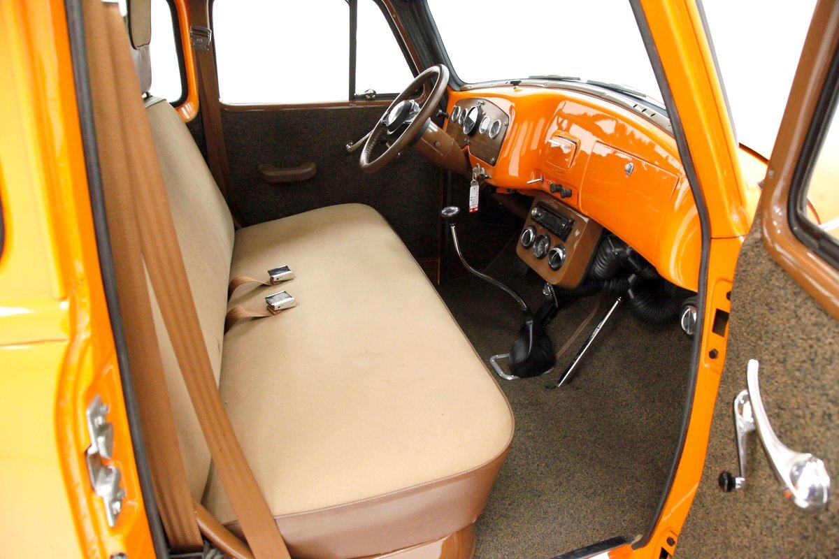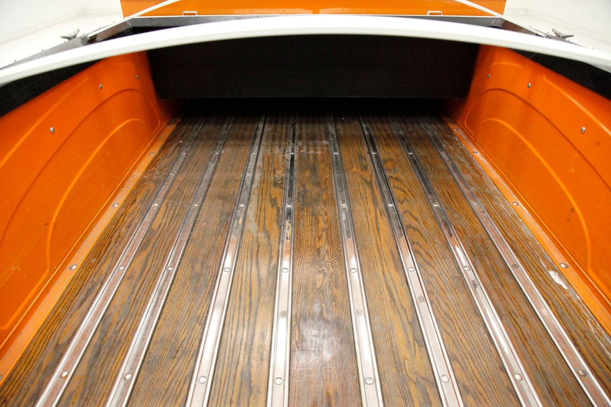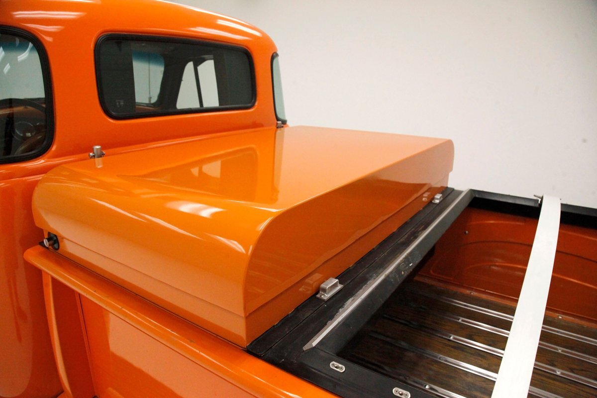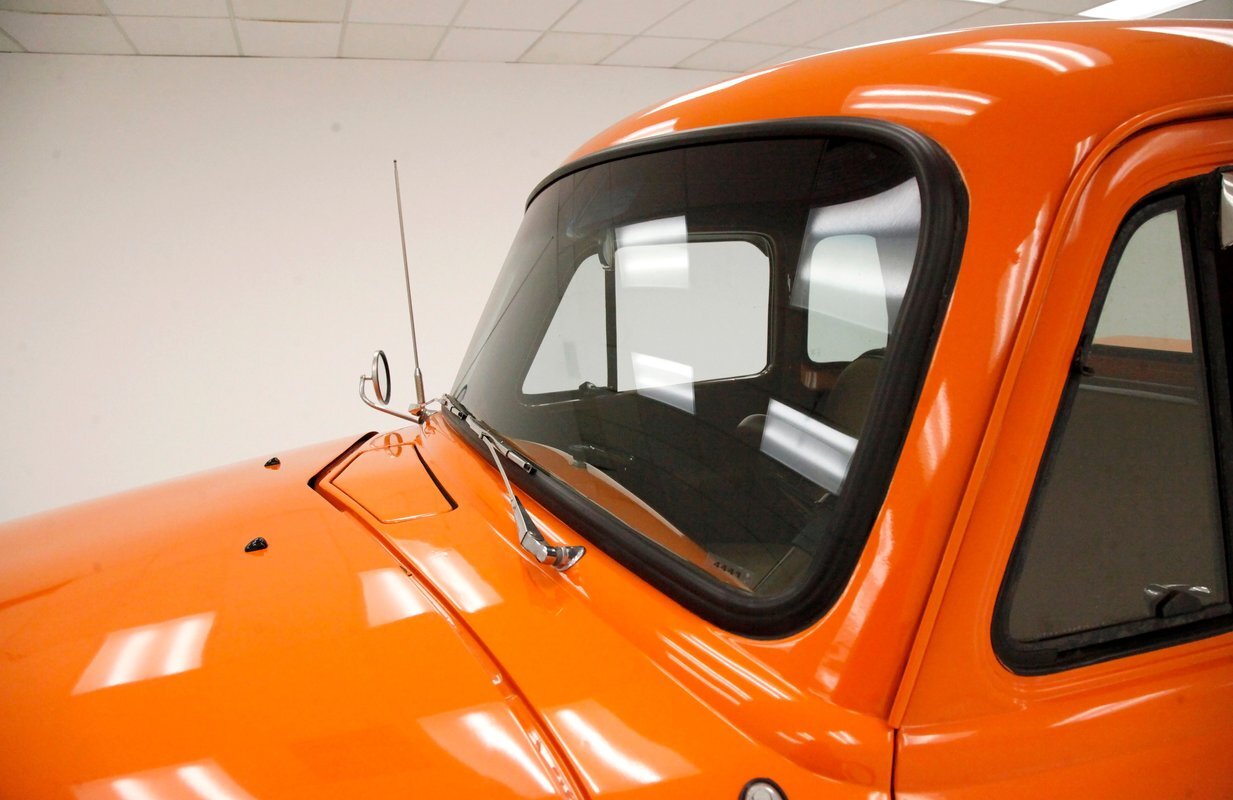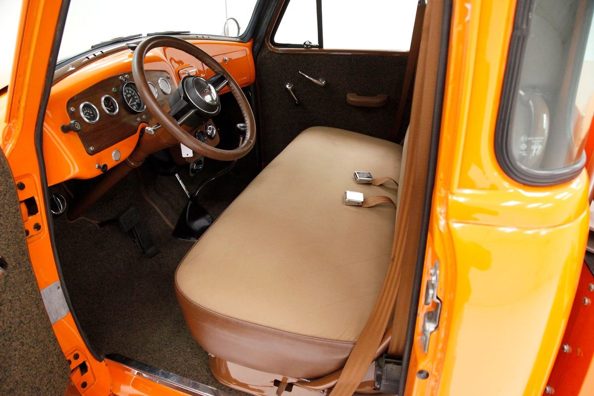 Starting out as the standard GMC pickup from 1954, all parts were taken off the frame, meticulously restored then put back on. All the body has been dipped in bright and shiny orange with the only deviation being the chrome peppered throughout the body. The large chrome iconic GMC badge is perched atop of the chrome horizontal barred grille and is making us very aware of the original manufacturer, and it is all truck. The bulbous hood rests between the soon to be gone pontoon style fenders and has a snappy custom touch with louvers cut into the sides where GMC badging once did reside. Black trimmings highlight the crystal clear cab glass and more chrome for the mirrors on the front side of the cab just before the door panels, and we see wonderfully curved B pillar windows inserted between the door glass and then rear glass. On the back, curved steel fenders wrap around the rear tires and finished in more orange. Mounted on the frame is now a beautifully crafted new oak bed, with metal separators, and black trimmings surrounding the bed top along with bows to support the tonneau. A large orange storage box occupies the front of the bed and the curvy chrome rear bumper hangs below the tailgate. Burnt orange steel wheels with mirror like moon caps are on all 4 corners, just to show off even more with their mix of Michelin front radials and BF Goodrich rear radials all in 15-inch format.