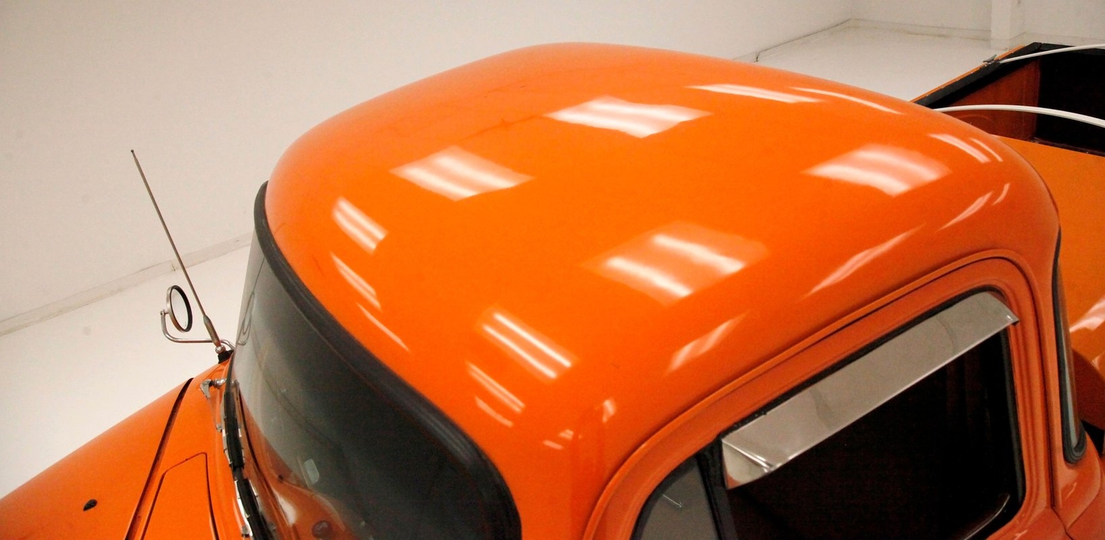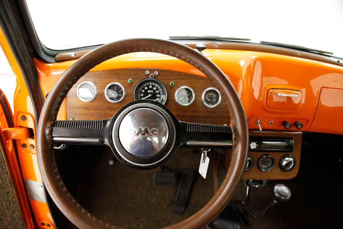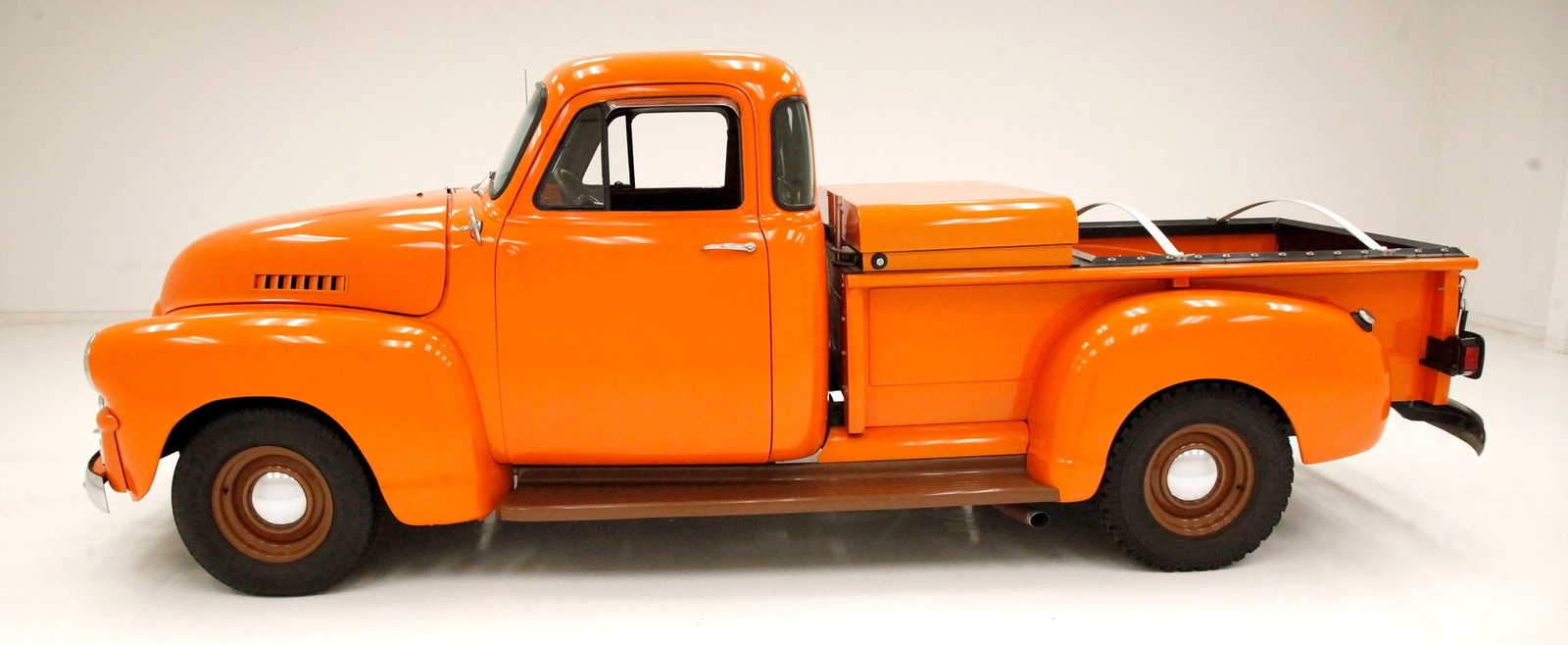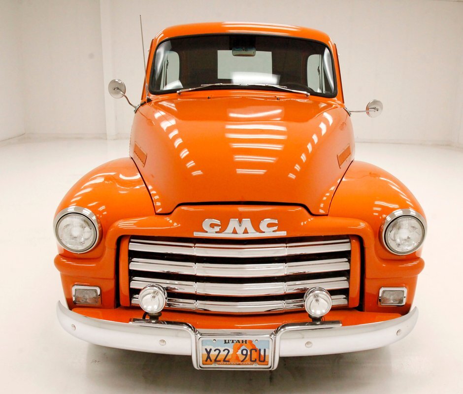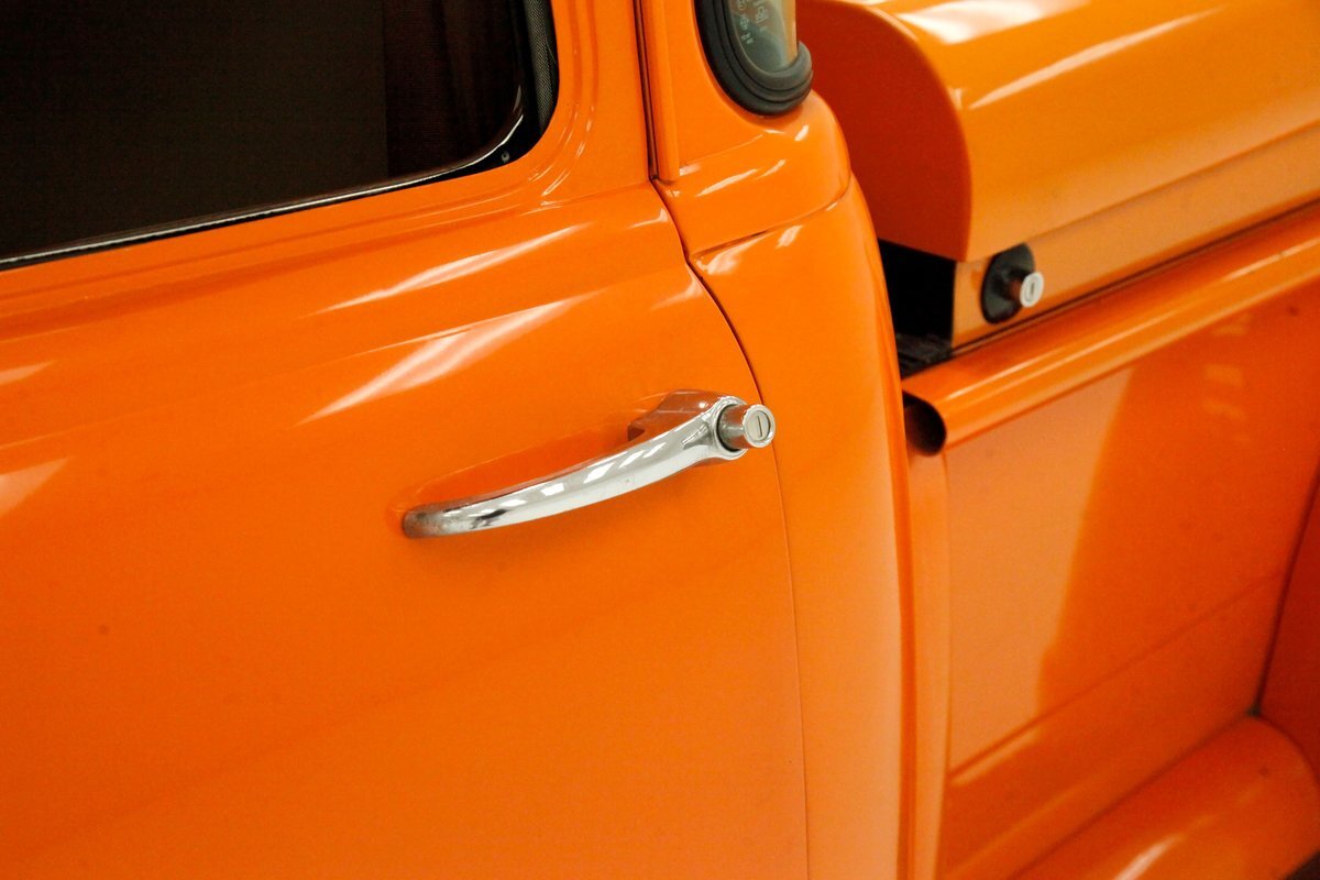 Starting out as the standard GMC pickup from 1954, all parts were taken off the frame, meticulously restored then put back on. All the body has been dipped in bright and shiny orange with the only deviation being the chrome peppered throughout the body. The large chrome iconic GMC badge is perched atop of the chrome horizontal barred grille and is making us very aware of the original manufacturer, and it is all truck. The bulbous hood rests between the soon to be gone pontoon style fenders and has a snappy custom touch with louvers cut into the sides where GMC badging once did reside. Black trimmings highlight the crystal clear cab glass and more chrome for the mirrors on the front side of the cab just before the door panels, and we see wonderfully curved B pillar windows inserted between the door glass and then rear glass. On the back, curved steel fenders wrap around the rear tires and finished in more orange. Mounted on the frame is now a beautifully crafted new oak bed, with metal separators, and black trimmings surrounding the bed top along with bows to support the tonneau. A large orange storage box occupies the front of the bed and the curvy chrome rear bumper hangs below the tailgate. Burnt orange steel wheels with mirror like moon caps are on all 4 corners, just to show off even more with their mix of Michelin front radials and BF Goodrich rear radials all in 15-inch format.