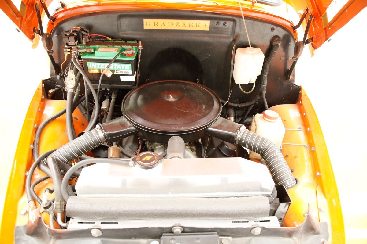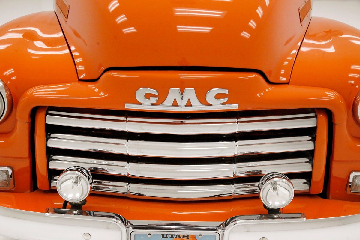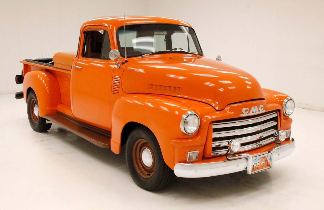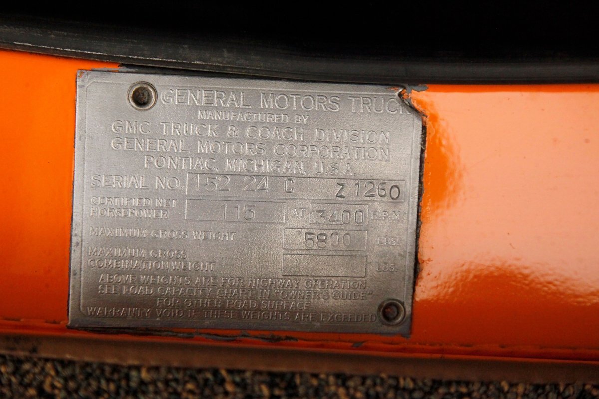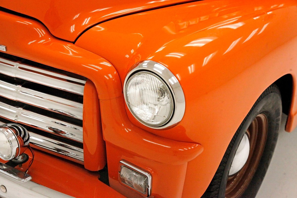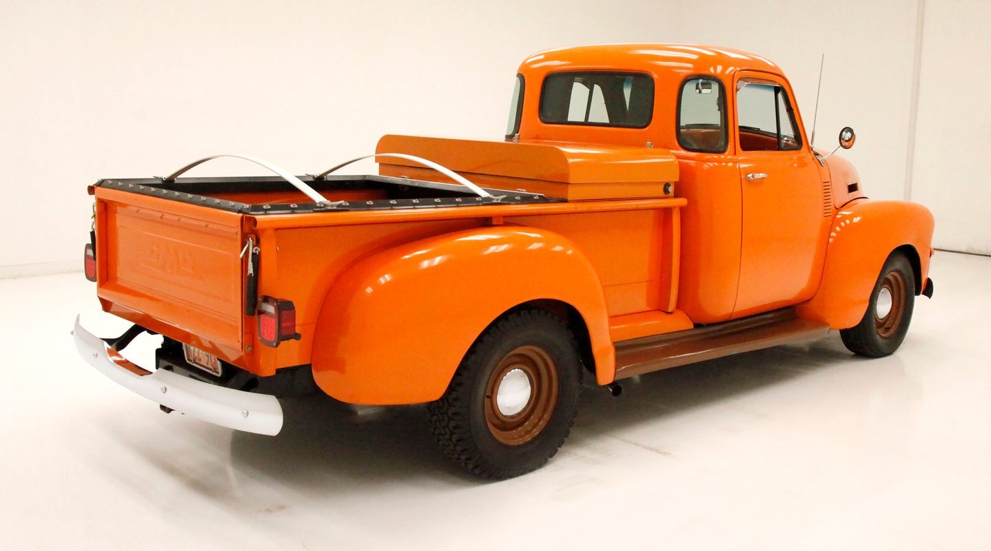 Starting out as the standard GMC pickup from 1954, all parts were taken off the frame, meticulously restored then put back on. All the body has been dipped in bright and shiny orange with the only deviation being the chrome peppered throughout the body. The large chrome iconic GMC badge is perched atop of the chrome horizontal barred grille and is making us very aware of the original manufacturer, and it is all truck. The bulbous hood rests between the soon to be gone pontoon style fenders and has a snappy custom touch with louvers cut into the sides where GMC badging once did reside. Black trimmings highlight the crystal clear cab glass and more chrome for the mirrors on the front side of the cab just before the door panels, and we see wonderfully curved B pillar windows inserted between the door glass and then rear glass. On the back, curved steel fenders wrap around the rear tires and finished in more orange. Mounted on the frame is now a beautifully crafted new oak bed, with metal separators, and black trimmings surrounding the bed top along with bows to support the tonneau. A large orange storage box occupies the front of the bed and the curvy chrome rear bumper hangs below the tailgate. Burnt orange steel wheels with mirror like moon caps are on all 4 corners, just to show off even more with their mix of Michelin front radials and BF Goodrich rear radials all in 15-inch format.
