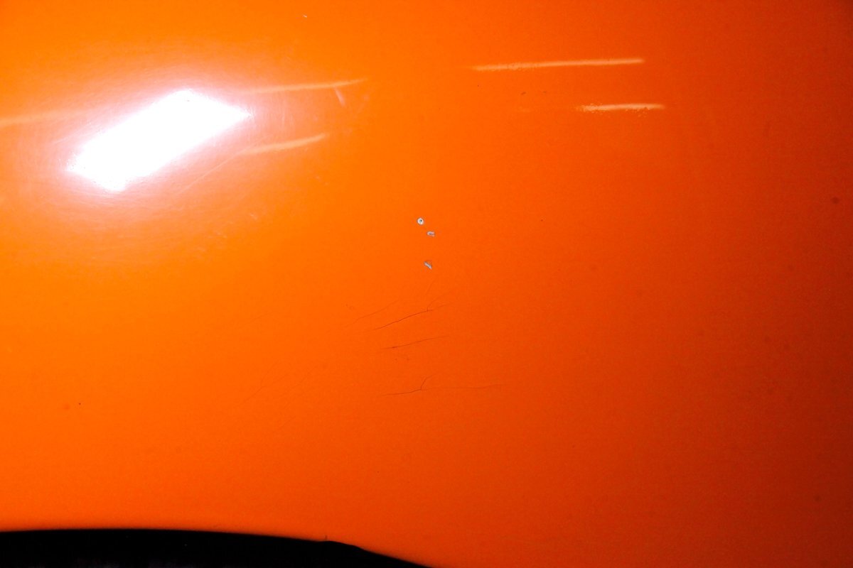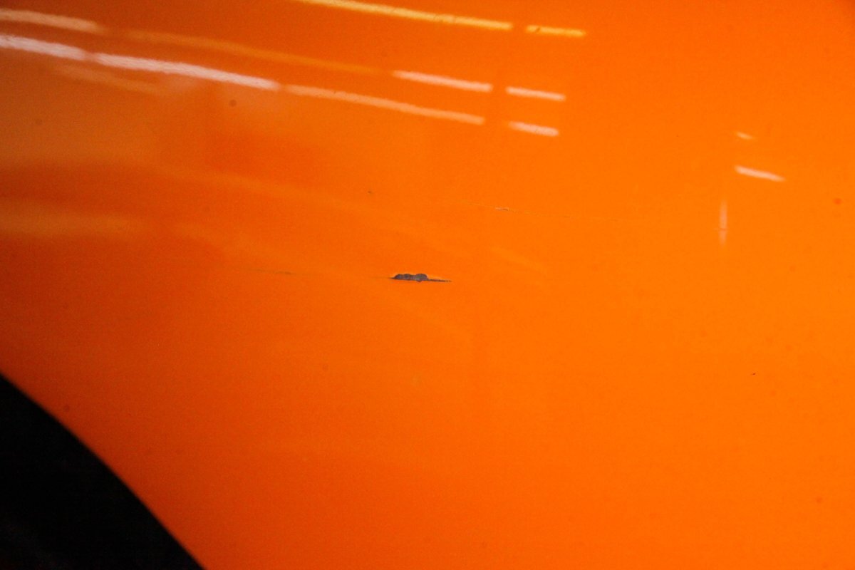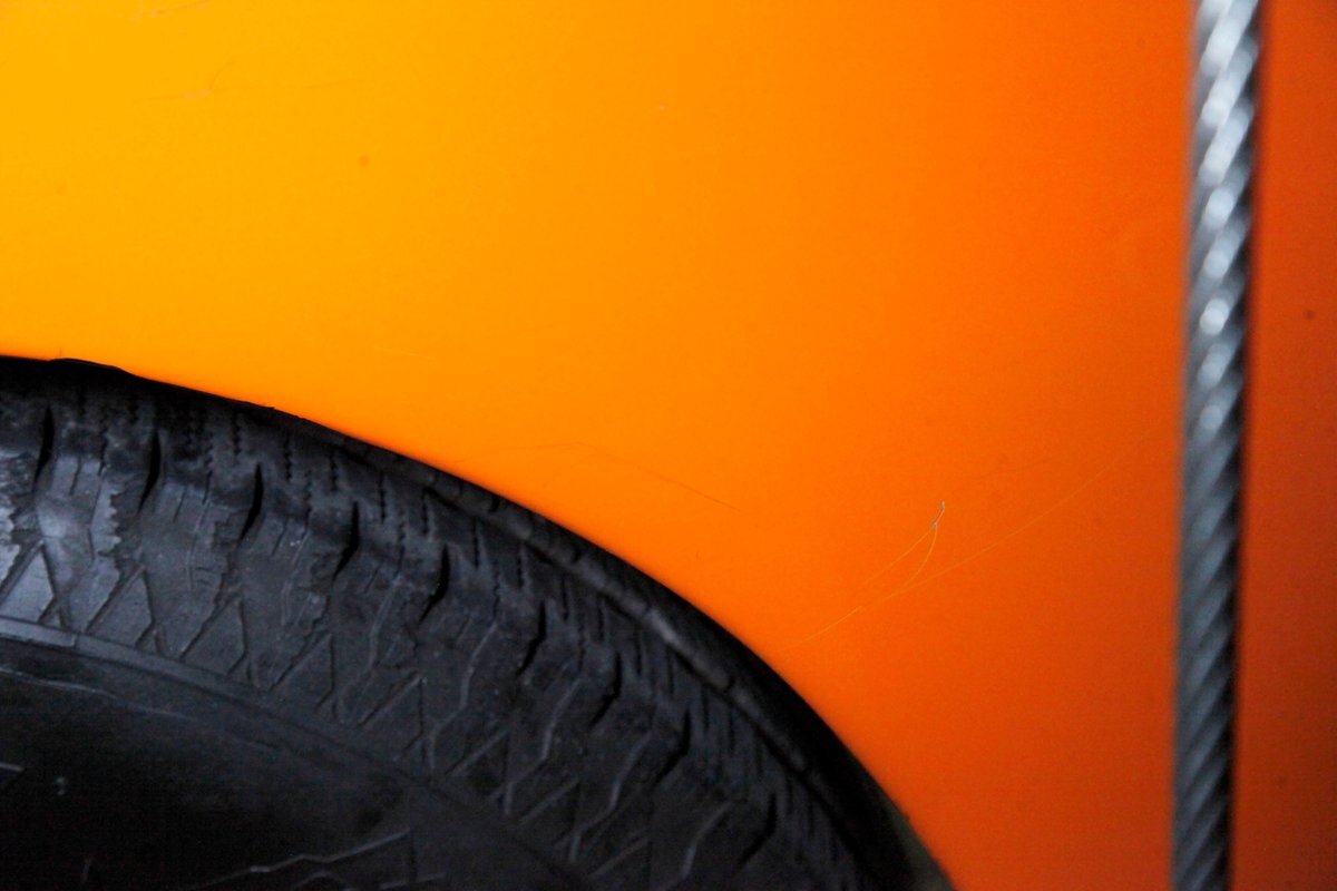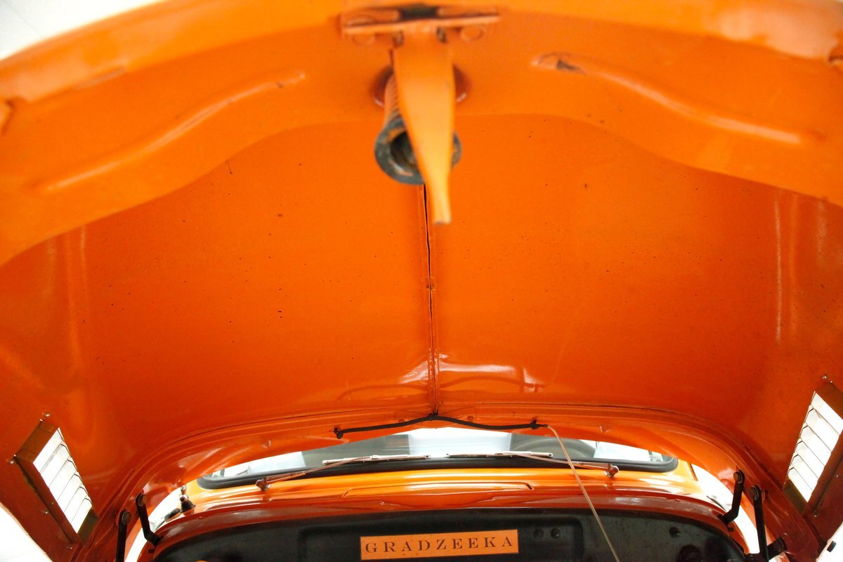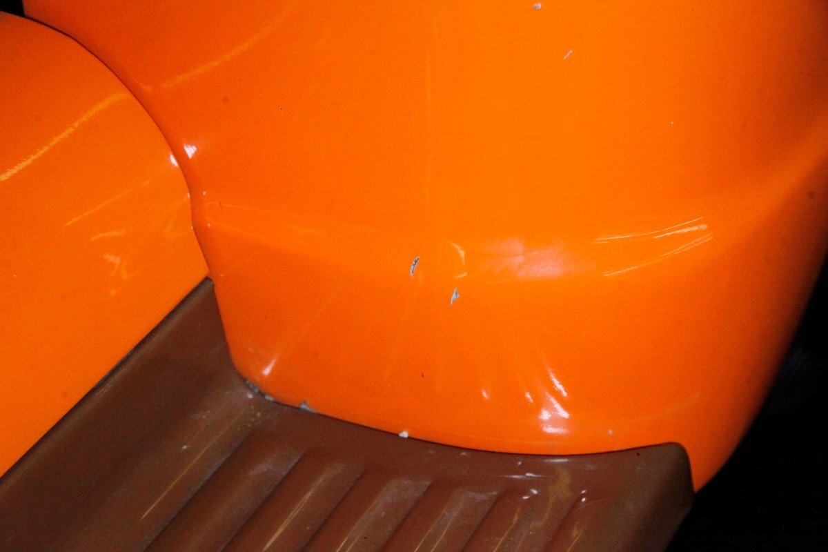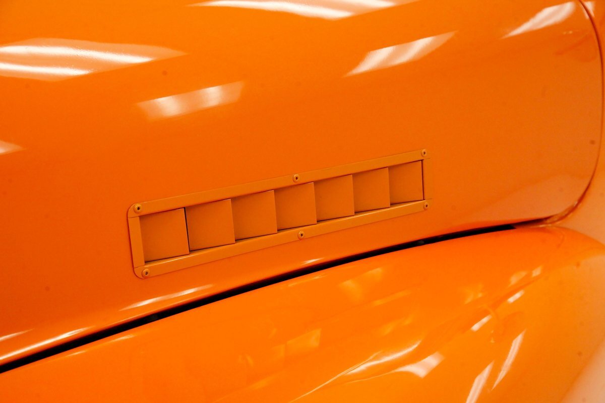 Starting out as the standard GMC pickup from 1954, all parts were taken off the frame, meticulously restored then put back on. All the body has been dipped in bright and shiny orange with the only deviation being the chrome peppered throughout the body. The large chrome iconic GMC badge is perched atop of the chrome horizontal barred grille and is making us very aware of the original manufacturer, and it is all truck. The bulbous hood rests between the soon to be gone pontoon style fenders and has a snappy custom touch with louvers cut into the sides where GMC badging once did reside. Black trimmings highlight the crystal clear cab glass and more chrome for the mirrors on the front side of the cab just before the door panels, and we see wonderfully curved B pillar windows inserted between the door glass and then rear glass. On the back, curved steel fenders wrap around the rear tires and finished in more orange. Mounted on the frame is now a beautifully crafted new oak bed, with metal separators, and black trimmings surrounding the bed top along with bows to support the tonneau. A large orange storage box occupies the front of the bed and the curvy chrome rear bumper hangs below the tailgate. Burnt orange steel wheels with mirror like moon caps are on all 4 corners, just to show off even more with their mix of Michelin front radials and BF Goodrich rear radials all in 15-inch format.