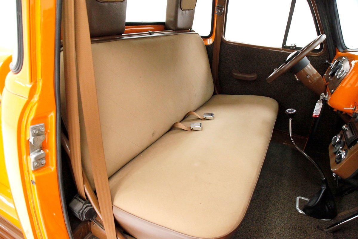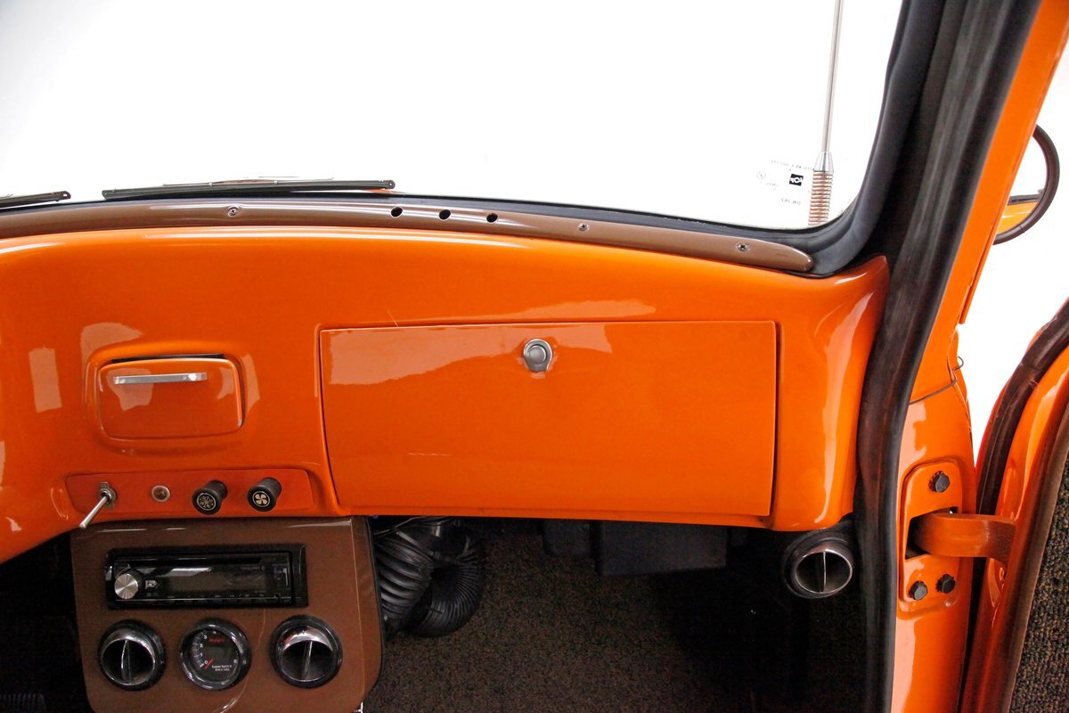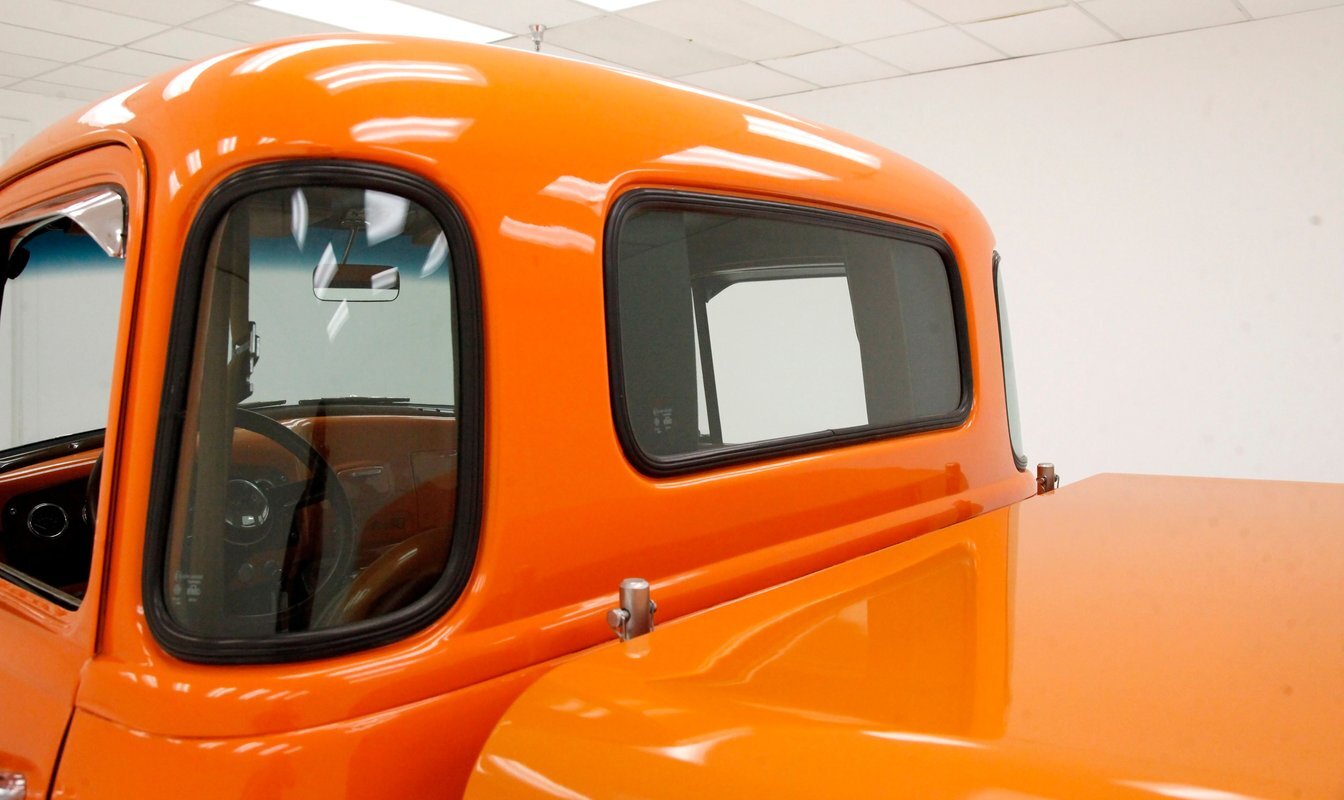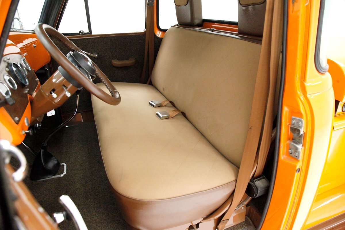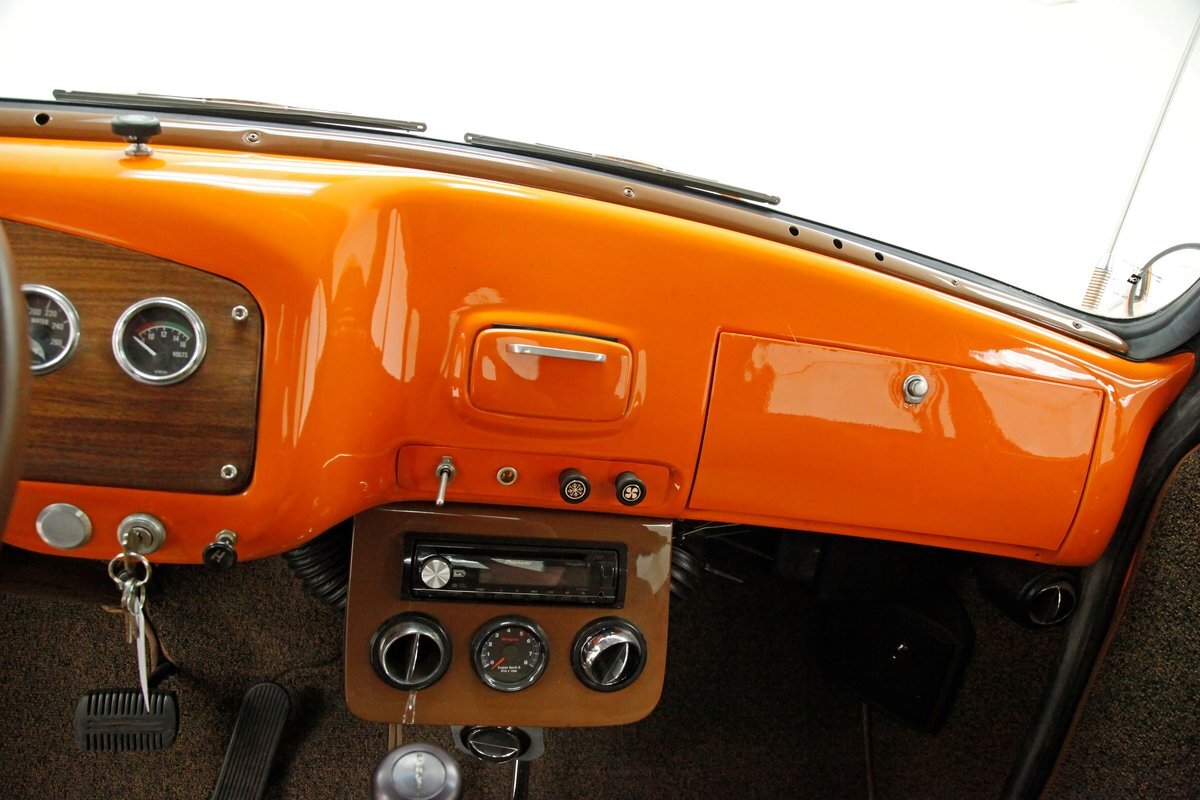 As any artisan who takes on a project as such would do, we open the doors and already we are over the top with marbled orange and black carpeted panels accenting the cranks and door pulls. Cranks and handles are excellent, and surrounding metal edging is painted tan on the sills and orange on the bottoms. As we take our wandering eyes into the passenger compartment, we are greeted with an overstuffed tan and saddle bench seat which fill the interior space from door to door. Custom dark saddle headrests have been added and now it all looks just beautiful. Continuing to the front, the original steel dash setup has been retained, but now presents in orange with a wood burl insert for the mix of VDO and SW gauges in front of the driver. Vintage Air and heat has been added in the custom highly lacquered wood panel mounted to the bottom of the dash and shares space with an AM/FM/CD stereo and a Sun tachometer. Due to the 12-volt conversion, the windshield wipers are now electrified, with no more vacuum to rely on. A long stick shifter rises from the pristine Mercedes tan wool carpet and has a black top knob. Fronting the dash is a brown tilt column, and saddle leather rimmed steering wheel atop. A shout out to the headliner which is now brown vinyl and appears as a faux leather patterned piece of tight vinyl with the custom cowboy hat rack neatly installed. Keep it simple is the mantra for this truck and it works wonderfully throughout.