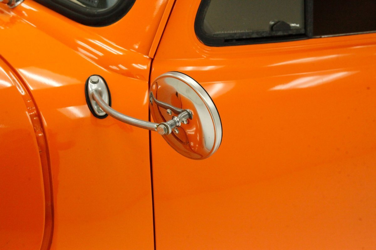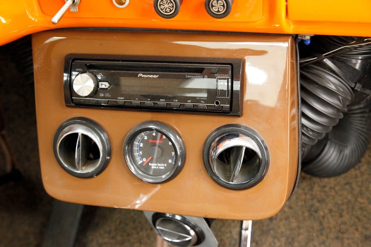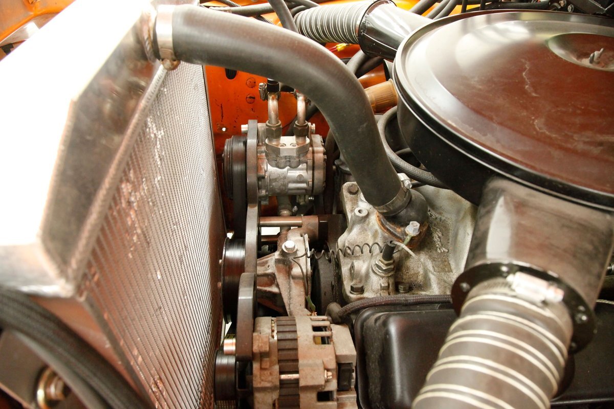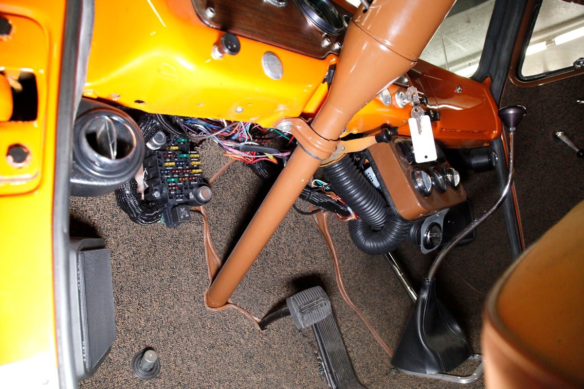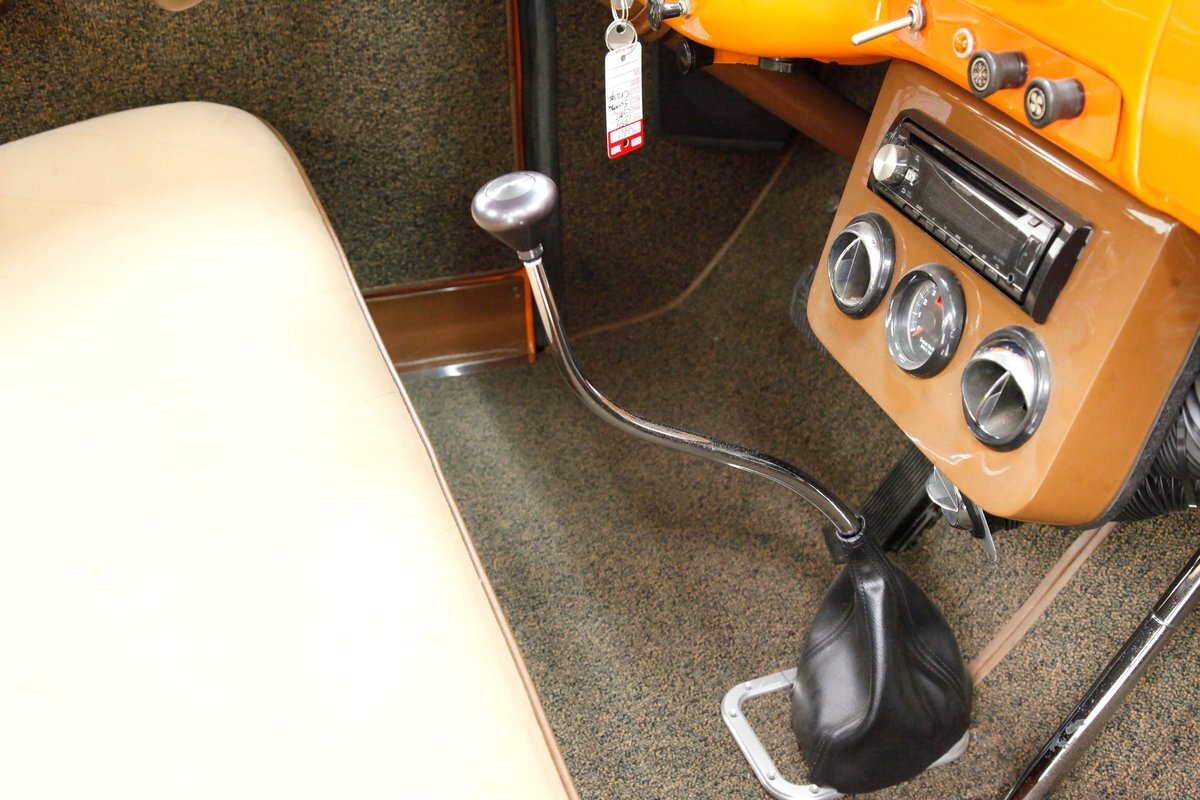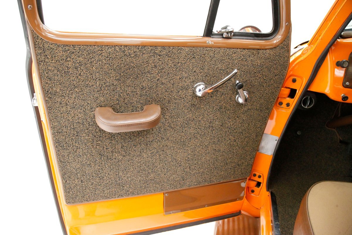 As any artisan who takes on a project as such would do, we open the doors and already we are over the top with marbled orange and black carpeted panels accenting the cranks and door pulls. Cranks and handles are excellent, and surrounding metal edging is painted tan on the sills and orange on the bottoms. As we take our wandering eyes into the passenger compartment, we are greeted with an overstuffed tan and saddle bench seat which fill the interior space from door to door. Custom dark saddle headrests have been added and now it all looks just beautiful. Continuing to the front, the original steel dash setup has been retained, but now presents in orange with a wood burl insert for the mix of VDO and SW gauges in front of the driver. Vintage Air and heat has been added in the custom highly lacquered wood panel mounted to the bottom of the dash and shares space with an AM/FM/CD stereo and a Sun tachometer. Due to the 12-volt conversion, the windshield wipers are now electrified, with no more vacuum to rely on. A long stick shifter rises from the pristine Mercedes tan wool carpet and has a black top knob. Fronting the dash is a brown tilt column, and saddle leather rimmed steering wheel atop. A shout out to the headliner which is now brown vinyl and appears as a faux leather patterned piece of tight vinyl with the custom cowboy hat rack neatly installed. Keep it simple is the mantra for this truck and it works wonderfully throughout.
