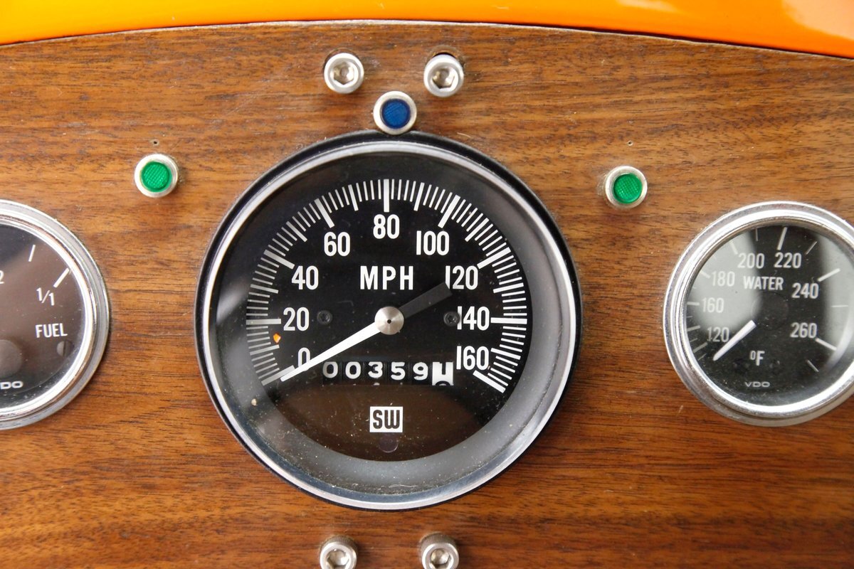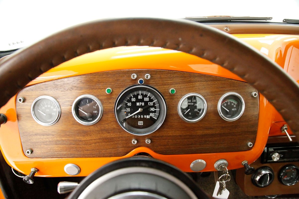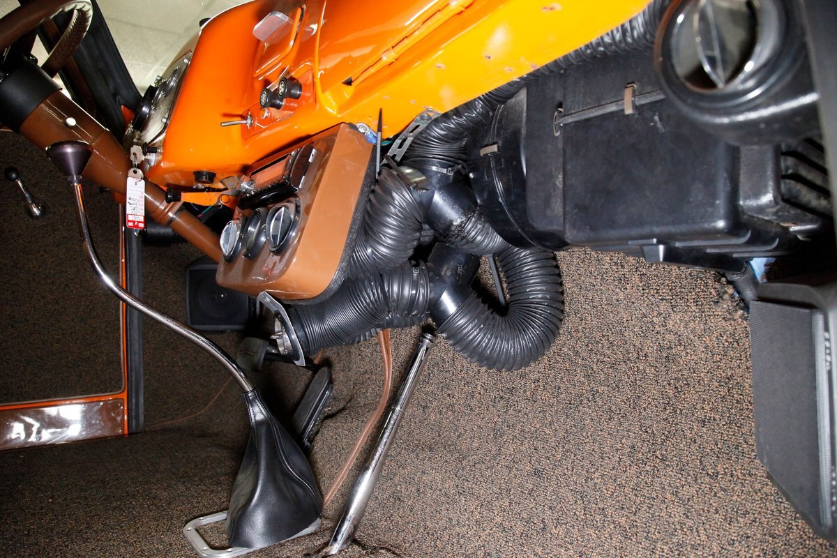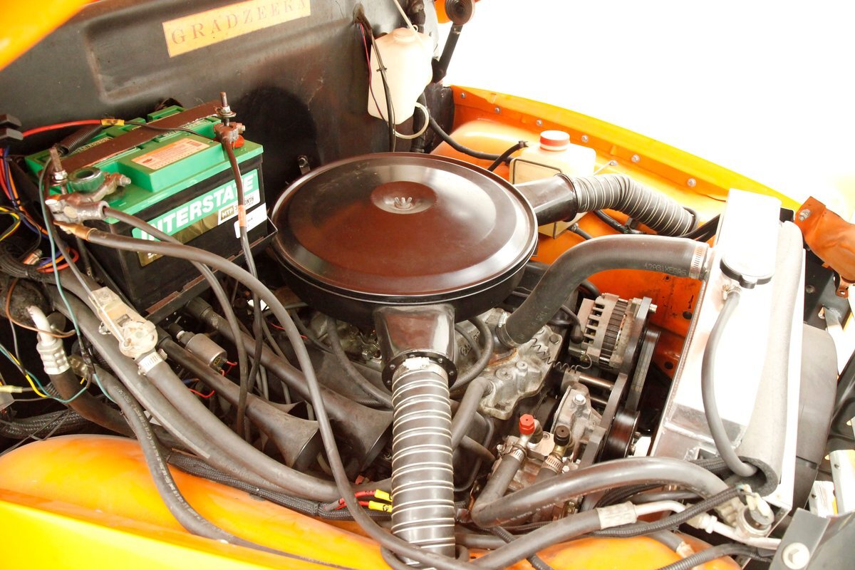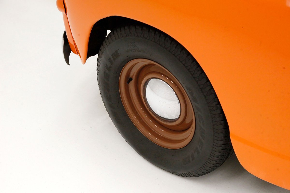 As any artisan who takes on a project as such would do, we open the doors and already we are over the top with marbled orange and black carpeted panels accenting the cranks and door pulls. Cranks and handles are excellent, and surrounding metal edging is painted tan on the sills and orange on the bottoms. As we take our wandering eyes into the passenger compartment, we are greeted with an overstuffed tan and saddle bench seat which fill the interior space from door to door. Custom dark saddle headrests have been added and now it all looks just beautiful. Continuing to the front, the original steel dash setup has been retained, but now presents in orange with a wood burl insert for the mix of VDO and SW gauges in front of the driver. Vintage Air and heat has been added in the custom highly lacquered wood panel mounted to the bottom of the dash and shares space with an AM/FM/CD stereo and a Sun tachometer. Due to the 12-volt conversion, the windshield wipers are now electrified, with no more vacuum to rely on. A long stick shifter rises from the pristine Mercedes tan wool carpet and has a black top knob. Fronting the dash is a brown tilt column, and saddle leather rimmed steering wheel atop. A shout out to the headliner which is now brown vinyl and appears as a faux leather patterned piece of tight vinyl with the custom cowboy hat rack neatly installed. Keep it simple is the mantra for this truck and it works wonderfully throughout.