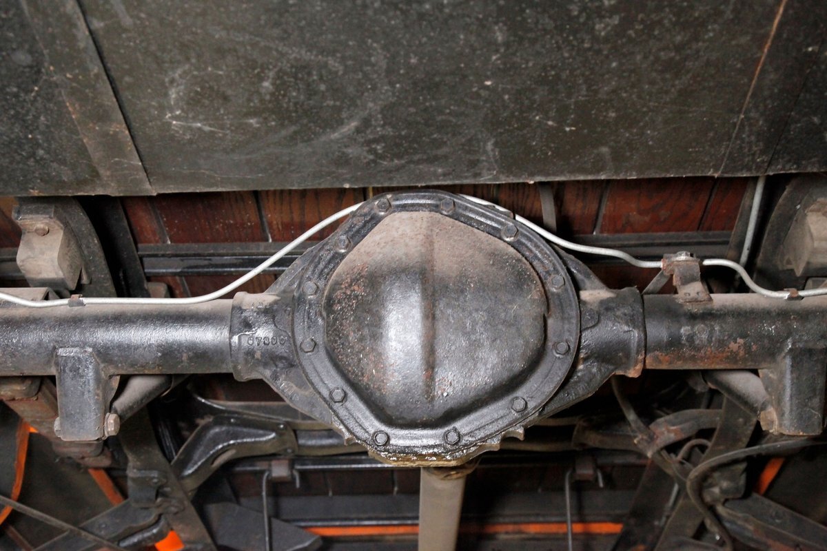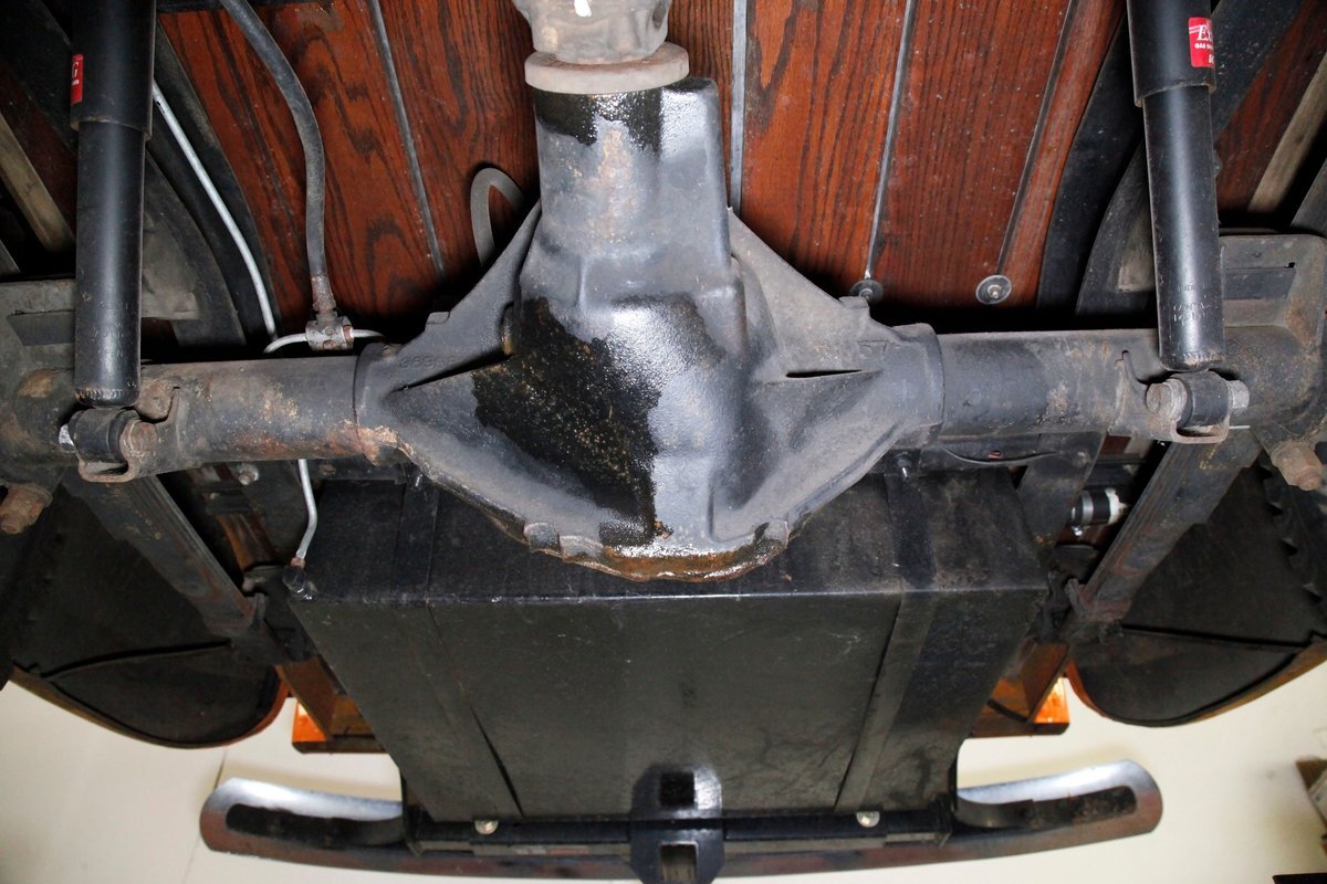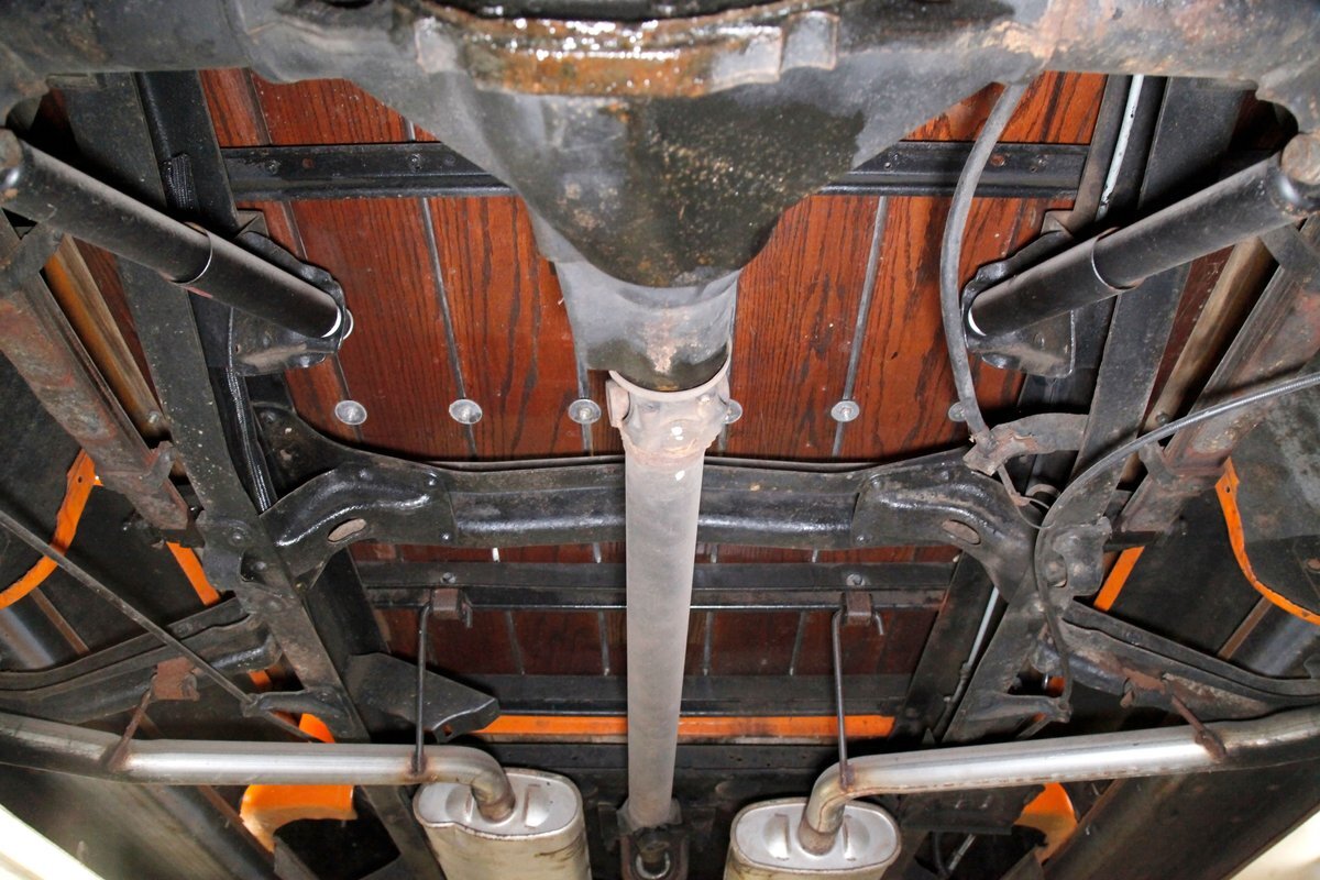 A totally restored black painted rust free frame is noted underneath. Bolted to this is a police cruiser front clip with coil spring independent suspension and on the back is a leaf spring set up. Power discs upfront, and power drums for the rear, and also a stock style dual exhaust is seen working its way rearward. Wood is near perfect just as above, and there are no runs, drips, or errors near the transmission and engine underside.