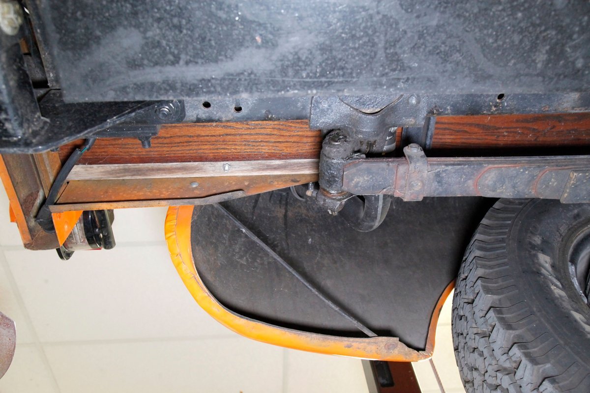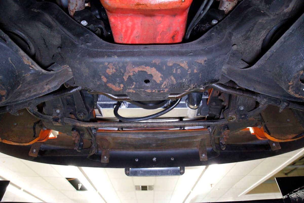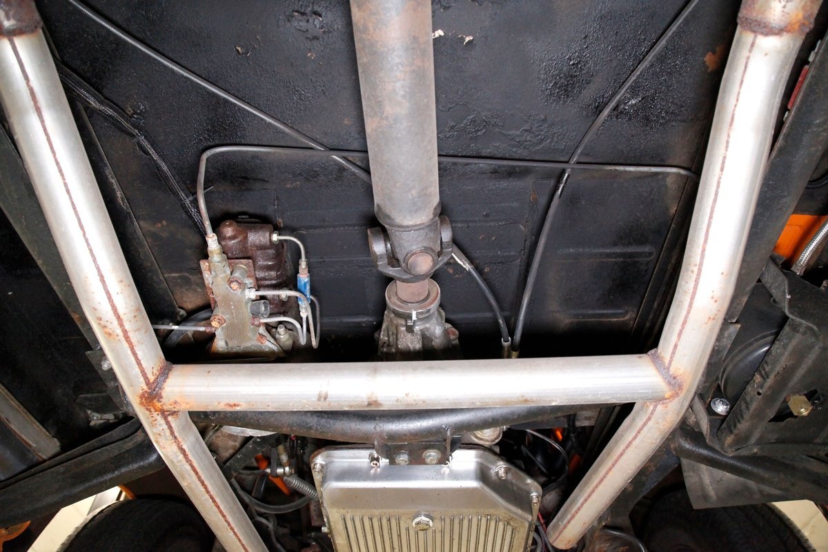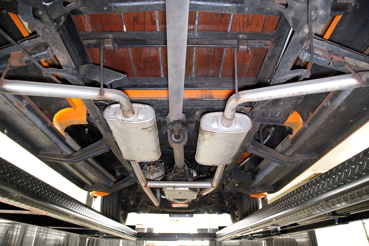 A totally restored black painted rust free frame is noted underneath. Bolted to this is a police cruiser front clip with coil spring independent suspension and on the back is a leaf spring set up. Power discs upfront, and power drums for the rear, and also a stock style dual exhaust is seen working its way rearward. Wood is near perfect just as above, and there are no runs, drips, or errors near the transmission and engine underside.