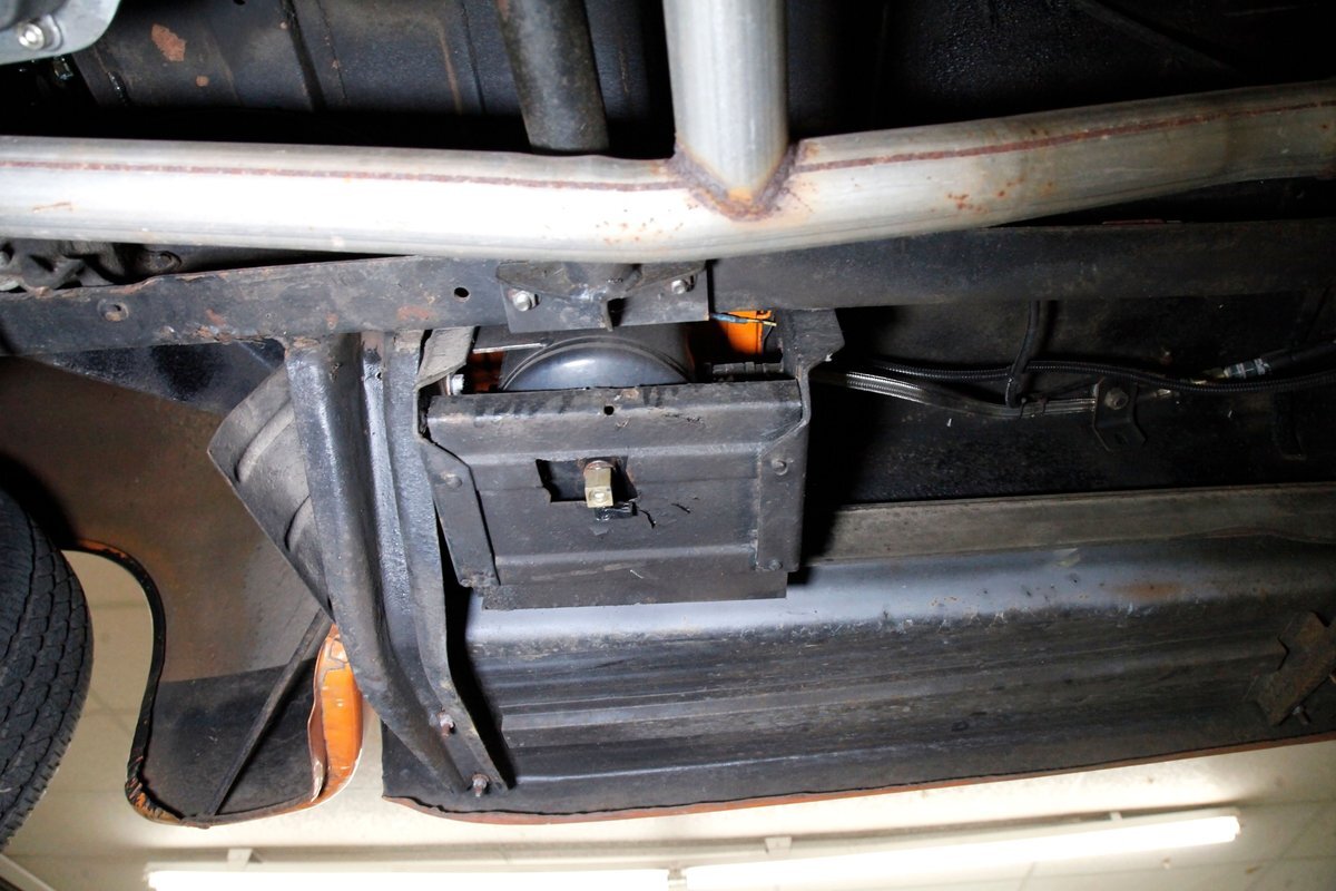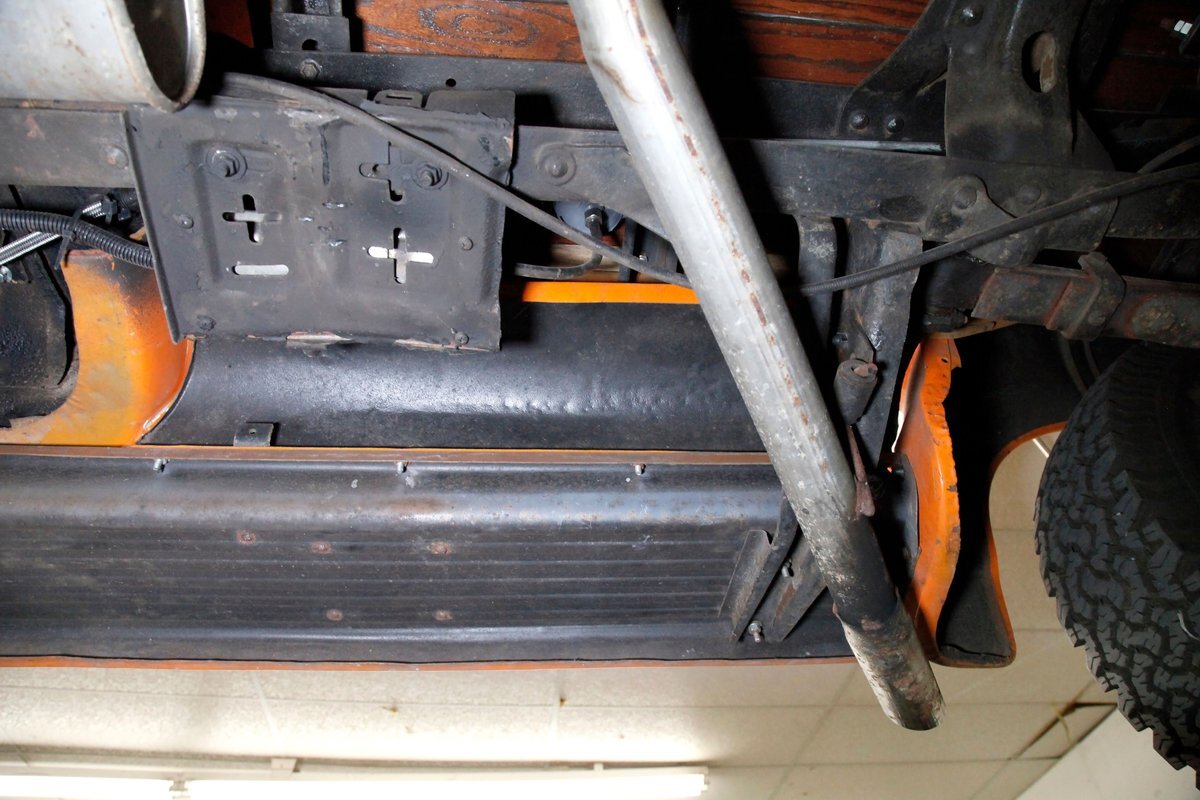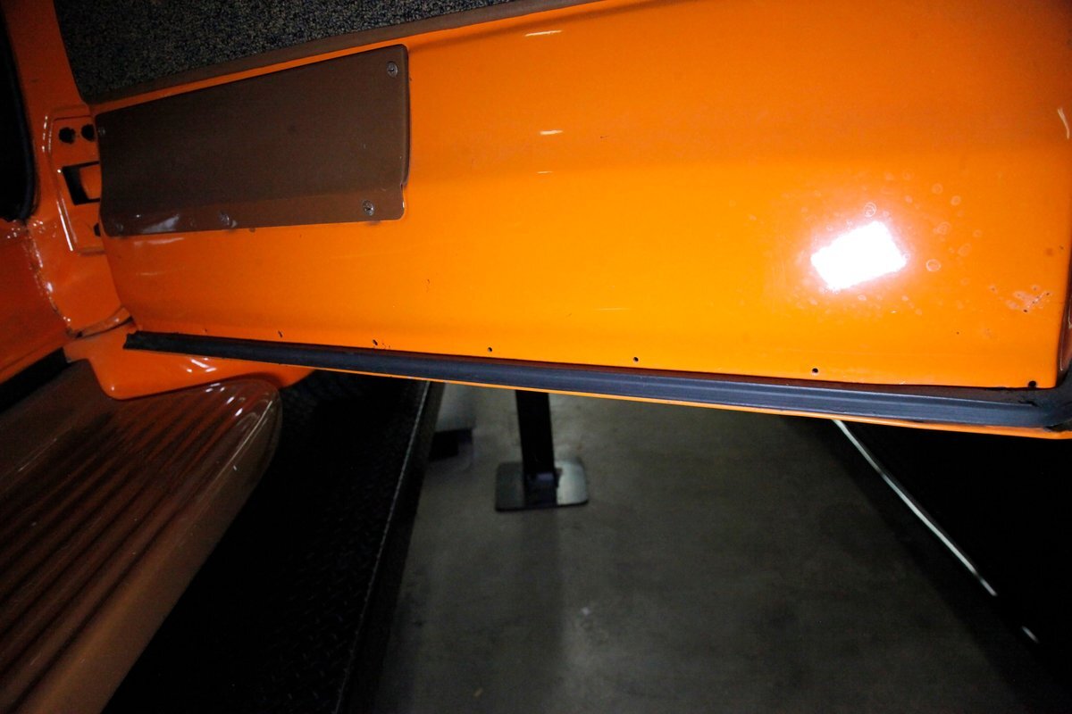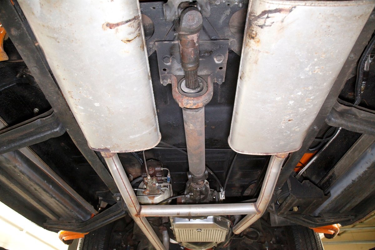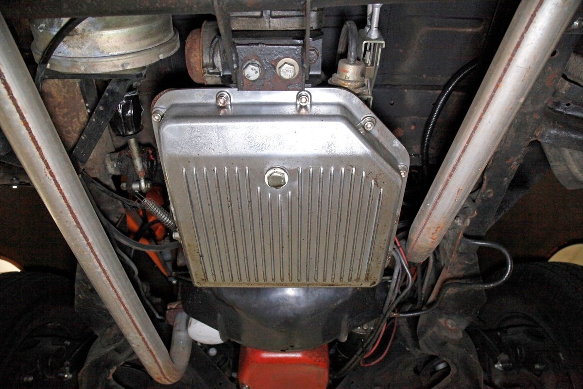 A 350ci Chevrolet engine now graces the dusty but restored engine bay. It codes out as circa 1969 to 1979 and is certainly all buttoned up with its black twin snorkel air cleaner assembly and black valve covers. Inside a few mods have been added in the form of a mild cam and an Edelbrock intake is fed by a 4-barrel carburetor. A TH350 3-speed automatic transmission pushes power from the mill rearward to a 12-bolt rear axle. Oh, and lest I forget the train horns added in the engine bay to clear the path in front of you.