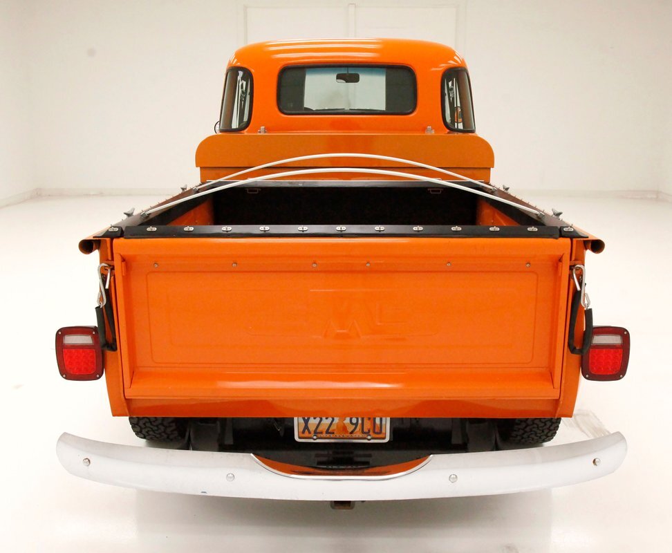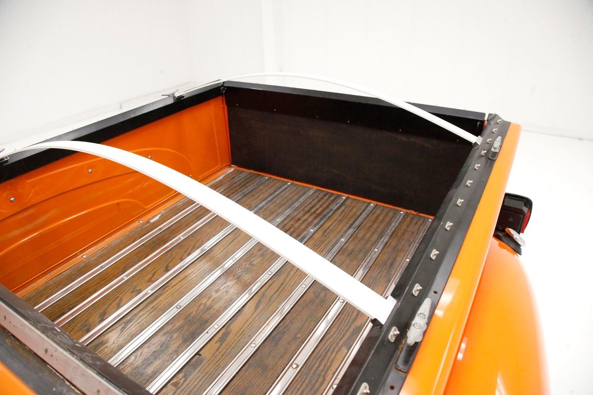 A full restoration done with obvious passion, and usage of nifty complementary colors, and a new clean wood lined bed on the back. A scrumptious interior with the overstuffed seats and perfect dash and carpet, and air, heat and defrost. Turn the key and drive away to do some work, or just cruise around and turn some heads!