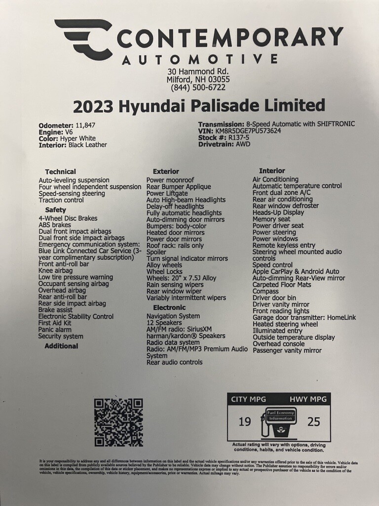 Recent Arrival! CONTEMPORARY CHRYSLER DODGE JEEP RAM is proud to present you with another True Market Priced Pre-Owned Vehicle. This 2023 Hyundai Palisade Limited is loaded with the following Factory Options: Option Group 01, 12 Speakers, 3.648 Axle Ratio, 3rd row seats: split-bench, 4-Wheel Disc Brakes, ABS brakes, Air Conditioning, Alloy wheels, AM/FM radio: SiriusXM, Apple CarPlay & Android Auto, Auto High-beam Headlights, Auto-dimming door mirrors, Auto-dimming Rear-View mirror, Auto-leveling suspension, Automatic temperature control, Brake assist, Bumpers: body-color, Cargo Net, Carpeted Floor Mats, Compass, Delay-off headlights, Driver door bin, Driver vanity mirror, Dual front impact airbags, Dual front side impact airbags, Electronic Stability Control, Emergency communication system: Blue Link Connected Car Service (3-year complimentary subscription), First Aid Kit, Four wheel independent suspension, Front anti-roll bar, Front Bucket Seats, Front Center Armrest, Front dual zone A/C, Front reading lights, Fully automatic headlights, Garage door transmitter: HomeLink, harman/kardon Speakers, Heads-Up Display, Heated & Ventilated Front Bucket Seats, Heated door mirrors, Heated front seats, Heated rear seats, Heated steering wheel, Illuminated entry, Knee airbag, Leather Seat Trim, Low tire pressure warning, Memory seat, Navigation System, Occupant sensing airbag, Outside temperature display, Overhead airbag, Overhead console, Panic alarm, Passenger door bin, Passenger vanity mirror, Power door mirrors, Power driver seat, Power Liftgate, Power moonroof, Power passenger seat, Power steering, Power windows, Radio data system, Radio: AM/FM/MP3 Premium Audio System, Rain sensing wipers, Rear air conditioning, Rear anti-roll bar, Rear audio controls, Rear Bumper Applique, Rear reading lights, Rear side impact airbag, Rear window defroster, Rear window wiper, Reclining 3rd row seat, Remote keyless entry, Roof rack: rails only, Security system, Speed control, Speed-sensing steering, Split folding rear seat, Spoiler, Steering wheel mounted audio controls, Tachometer, Telescoping steering wheel, Tilt steering wheel, Traction control, Trip computer, Turn signal indicator mirrors, Variably intermittent wipers, Ventilated front seats, Ventilated rear seats, Wheel Locks, and Wheels: 20 x 7.5J Alloy!!