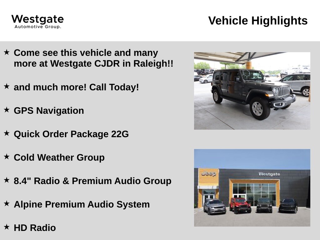 CARFAX One-Owner. Come see this vehicle and many more at Westgate CJDR in Raleigh!!, and much more! Call Today!, 1-Year SiriusXM Guardian Trial, 4G LTE Wi-Fi Hot Spot, 5-Year SiriusXM Traffic Service, 5-Year SiriusXM Travel Link Service, 8.4 Radio & Premium Audio Group, 8.4 Touchscreen Display, Alpine Premium Audio System, Auto-Dimming Rear-View Mirror, Cold Weather Group, Emergency/Assistance Call, For Details, Visit , GPS Navigation, HD Radio, Heated Front Seats, Heated Steering Wheel, Quick Order Package 22G, Radio: Uconnect 4C Nav w/8.4 Display, SiriusXM Traffic Plus, SiriusXM Travel Link.