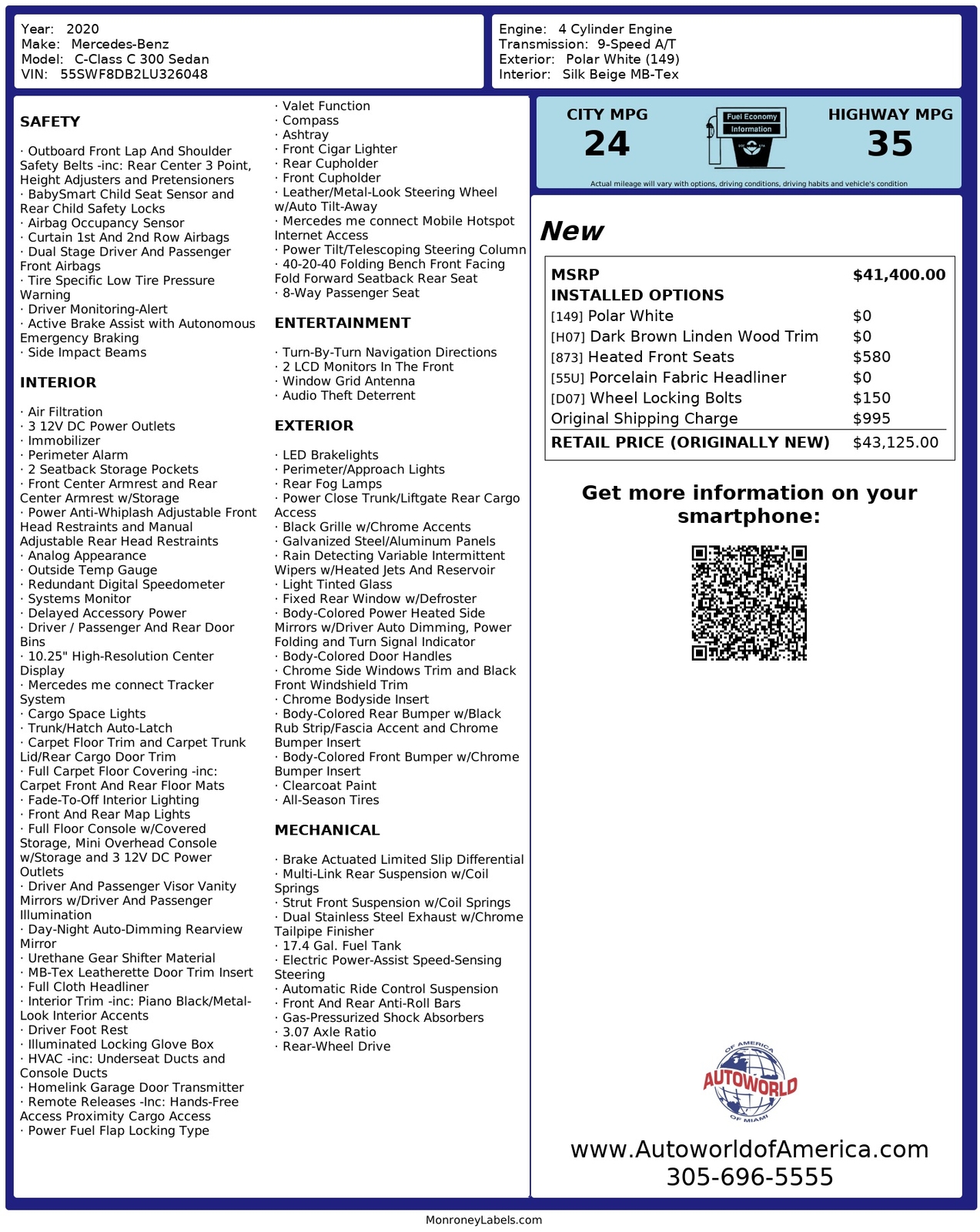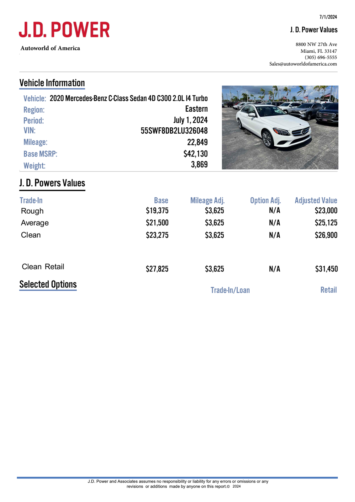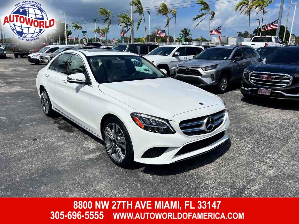 Our incredible 2020 Mercedes-Benz C-Class C 300 Sedan is sculpted to perfection in Polar White! Powered by a TurboCharged 2.0 Liter 4 Cylinder offering 255hp matched with a responsive 9 Speed Automatic transmission. This Rear Wheel Drive sedan has sport-tuned suspension to deliver you to your destination while also rewarding you with impressive acceleration - brilliant handling - and near 35mpg on the highway. Our C 300 is prestigious - poised - and influential. It commands attention - whether cruising down the street or parked in your driveway with its aggressive AMG styling - chrome diamond-block grille - sunroof - and beautiful alloy wheels. Masterfully crafted down to the last detail - the C 300 cabin greets you with heated front seats and power driver seat with memory - a sports steering wheel - dual-zone automatic climate control - split-folding rear seats - and pushbutton ignition. Enjoy intuitive access to infotainment with a central controller and one-touch keys for significant functions. Maintaining a safe connection is easy thanks to hands-free Bluetooth - navigation - as well as HD radio on the 10.25-inch high-resolution display. Our award-winning Mercedes-Benz emphasizes safety with an aluminum and high-strength steel body structure and state-of-the-art safety systems such as Collision Prevention Assist Plus and Crosswind Assist - a backup camera - active brake assist - attention assist - and much more. You desire automotive excellence - and our C 300 delivers! Save this Page and Call for Availability. We Know You Will Enjoy Your Test Drive Towards Ownership! This vehicle has a branded title and was DMV inspected in Florida. It is in excellent condition - and everything works perfectly - we have test driven it several times and checked to make sure all the options and features work as they should. It is priced thousands below its J.D. Power retail value based on advertised trim - miles - and options. Our vehicles go through a 151-Point Inspection and this vehicle includes a 3 Month 3 -000 Miles in-house warranty*. It is ready to go for local - nationwide - or international shipping. At Autoworld you will save thousands without sacrificing quality. You can now afford a newer model year - higher trim level - and even lower miles than what you were expecting in your price range. For more than 30 years customers worldwide agree that vehicles from Autoworld of America offer the best value and quality. $$$ DRIVE THE CAR - NOT THE TITLE - SAVE THOUSANDS $$$
