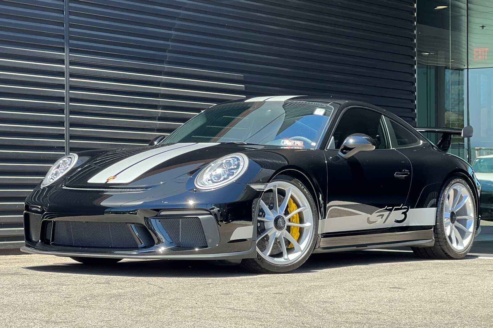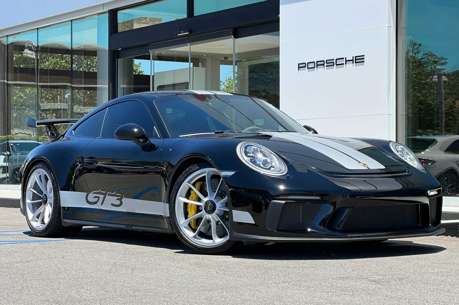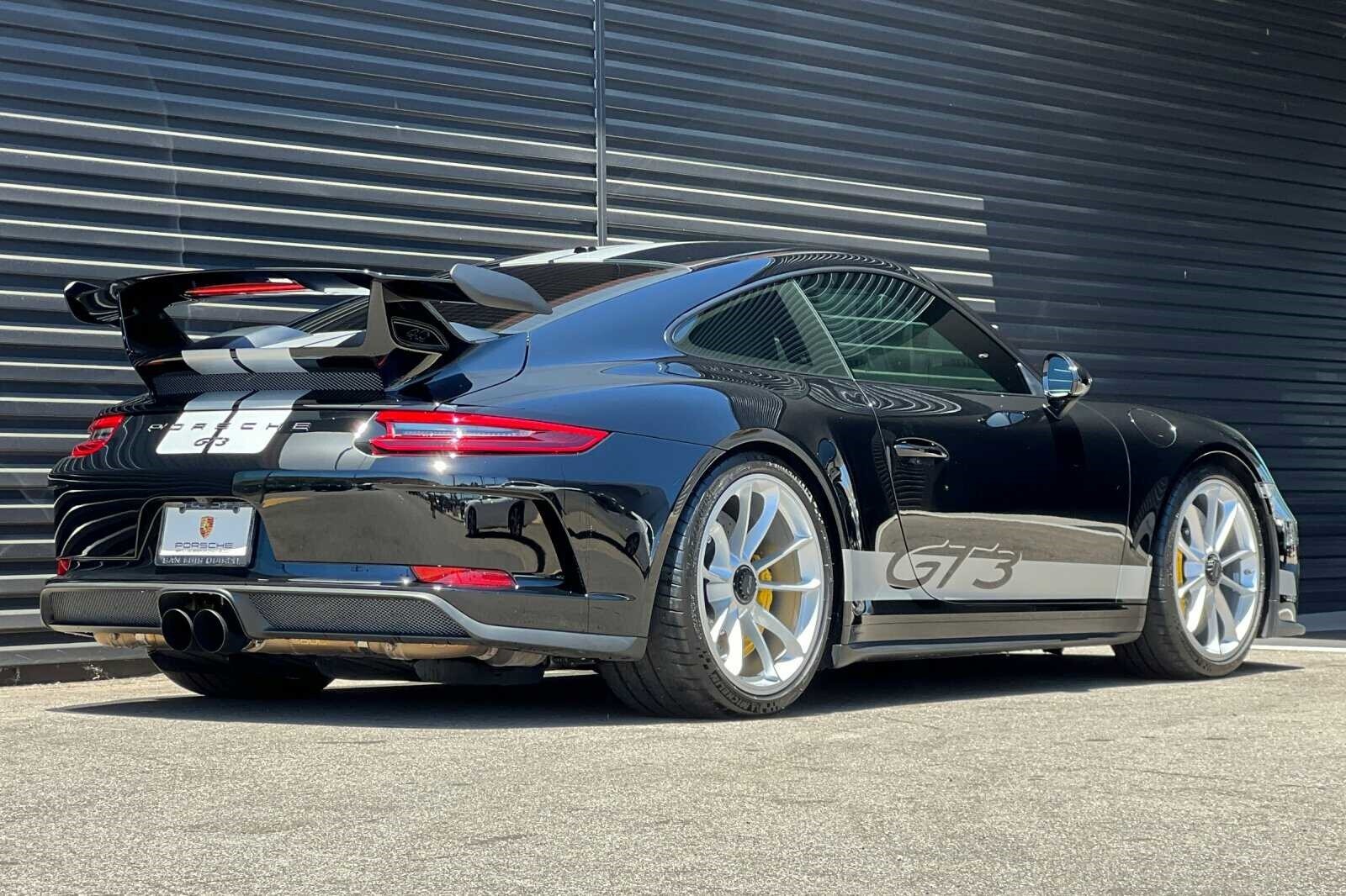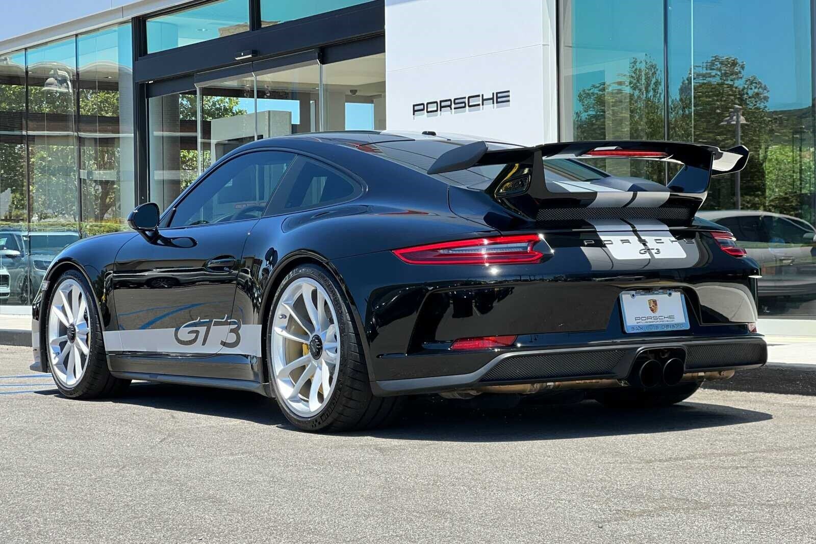 This Porsche San Luis Obispo 2018 Black Porsche 911 GT3 RWD is well equipped and includes these features and benefits: 4-Way Sport Seats Plus, 4-Wheel Disc Brakes, 8 Speakers, ABS brakes, Adaptive suspension, Air Conditioning, Alloy wheels, AM/FM radio: SiriusXM, Apple CarPlay, Automatic temperature control, Brake assist, Bumpers: body-color, CD player, Delay-off headlights, Driver door bin, Driver vanity mirror, Dual front impact airbags, Dual front side impact airbags, DVD-Audio, Electronic Stability Control, Exterior Parking Camera Rear, Four wheel independent suspension, Front anti-roll bar, Front Bucket Seats, Front Center Armrest, Front dual zone A/C, Front reading lights, Fully automatic headlights, Headlight cleaning, Heated door mirrors, High intensity discharge headlights: Bi-Xenon, Illuminated entry, Knee airbag, Leather/Alcantara Seat Trim, Low tire pressure warning, Navigation System, Occupant sensing airbag, Outside temperature display, Overhead airbag, Overhead console, Passenger cancellable airbag, Passenger door bin, Passenger vanity mirror, Porsche Communication Management, Power door mirrors, Power driver seat, Power passenger seat, Power steering, Power windows, Radio data system, Rear anti-roll bar, Rear fog lights, Rear window defroster, Remote keyless entry, Security system, Speed control, Speed-sensing steering, Spoiler, Sport steering wheel, Tachometer, Telescoping steering wheel, Tilt steering wheel, Traction control, Trip computer, Variably intermittent wipers, and Wheels: 9J x 20 Fr/12J x 20 Rr GT3.