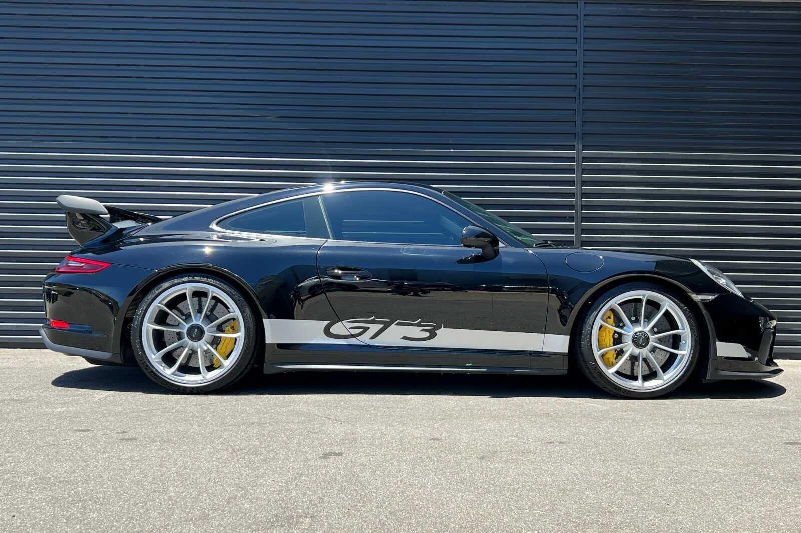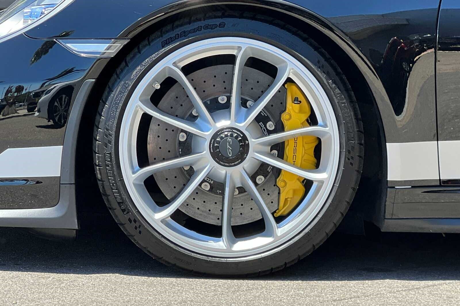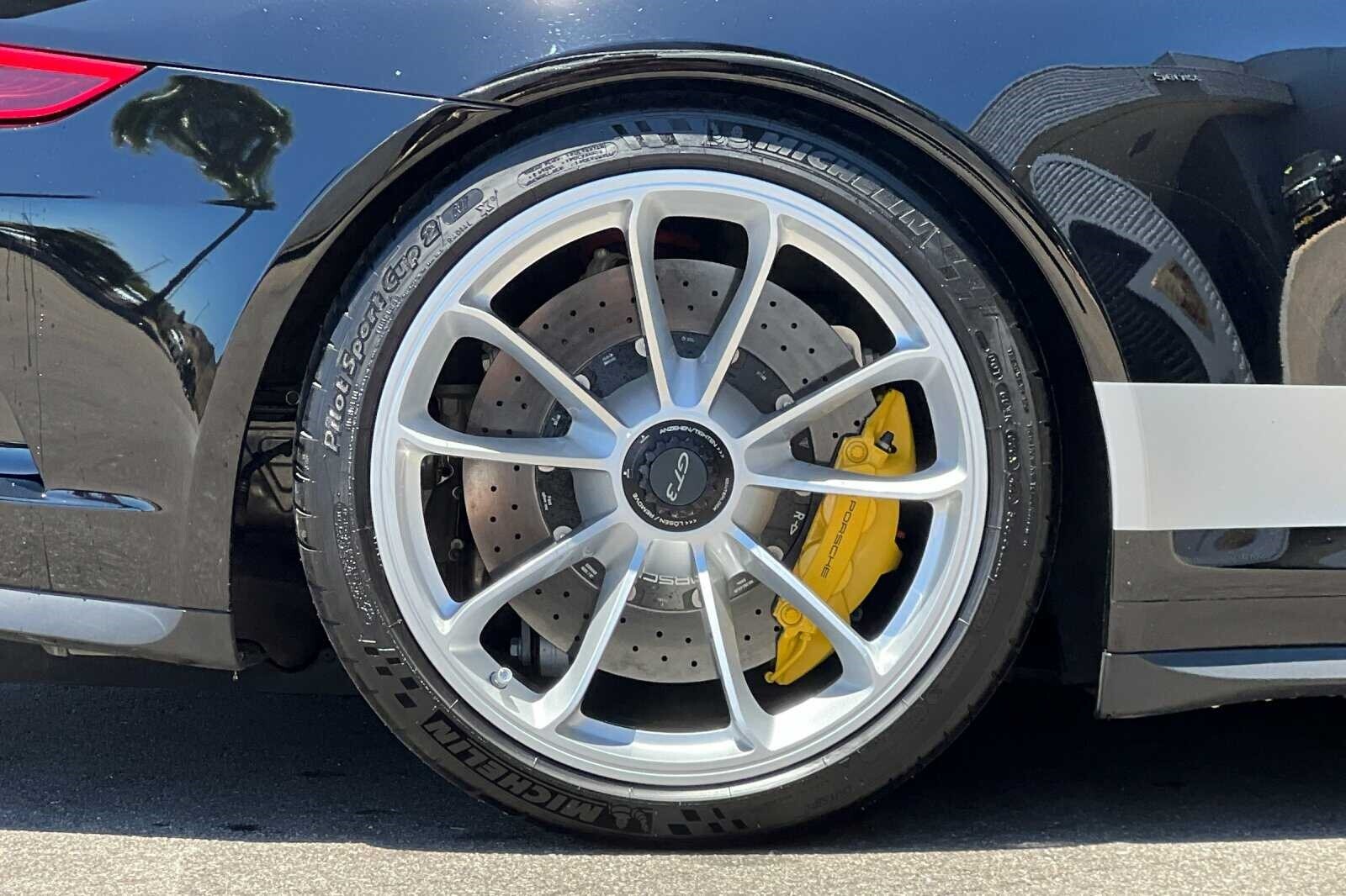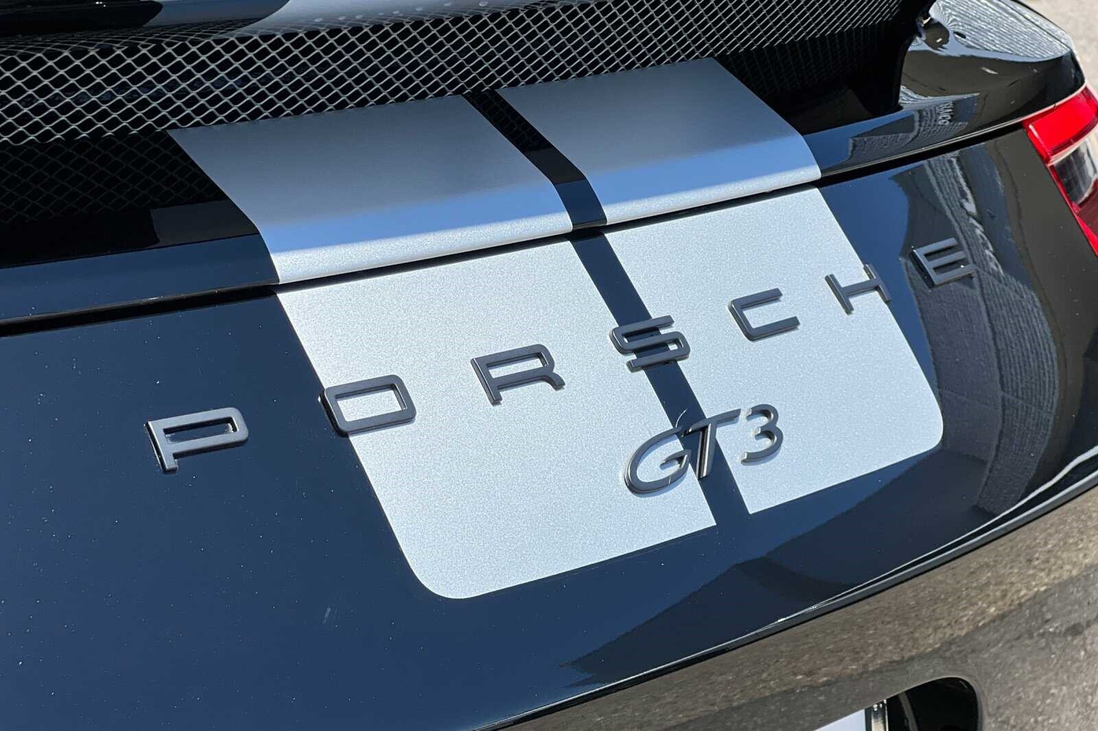 This Porsche San Luis Obispo 2018 Black Porsche 911 GT3 RWD is well equipped and includes these features and benefits: 4-Way Sport Seats Plus, 4-Wheel Disc Brakes, 8 Speakers, ABS brakes, Adaptive suspension, Air Conditioning, Alloy wheels, AM/FM radio: SiriusXM, Apple CarPlay, Automatic temperature control, Brake assist, Bumpers: body-color, CD player, Delay-off headlights, Driver door bin, Driver vanity mirror, Dual front impact airbags, Dual front side impact airbags, DVD-Audio, Electronic Stability Control, Exterior Parking Camera Rear, Four wheel independent suspension, Front anti-roll bar, Front Bucket Seats, Front Center Armrest, Front dual zone A/C, Front reading lights, Fully automatic headlights, Headlight cleaning, Heated door mirrors, High intensity discharge headlights: Bi-Xenon, Illuminated entry, Knee airbag, Leather/Alcantara Seat Trim, Low tire pressure warning, Navigation System, Occupant sensing airbag, Outside temperature display, Overhead airbag, Overhead console, Passenger cancellable airbag, Passenger door bin, Passenger vanity mirror, Porsche Communication Management, Power door mirrors, Power driver seat, Power passenger seat, Power steering, Power windows, Radio data system, Rear anti-roll bar, Rear fog lights, Rear window defroster, Remote keyless entry, Security system, Speed control, Speed-sensing steering, Spoiler, Sport steering wheel, Tachometer, Telescoping steering wheel, Tilt steering wheel, Traction control, Trip computer, Variably intermittent wipers, and Wheels: 9J x 20 Fr/12J x 20 Rr GT3.