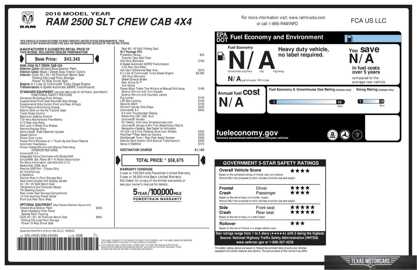 Introducing the 2016 Ram 2500 SLT 4x4, a powerhouse wrapped in a stunning New Holland Blue exterior that commands attention and respect on and off the road. This beast is not just about looks; it's about delivering unmatched performance and reliability, thanks to its Cummins 6.7L Diesel Turbo I6 engine that roars with 350hp and an impressive 660ft. lbs. of torque. When you got something that looks this good and performs even better, it's hard not to feel like the man.