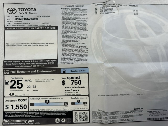 $43,618 ORIGINAL MSRP!! 2019 TOYOTA AVALON TOURING, BROWNSTONE, BLACK SOFTTEX / ULTRASUEDE INTERIOR, 19-INCH BLACK MACHINE-FINISHED ALLOY WHEELS, SPORT TUNED SUSPENSION, TOYOTA SAFETY SENSE P, PRE-COLLISION SYSTEM W/ PEDESTRIAN DETECT, LANE DEPARTURE ALERT W/ STEER ASSIST, AUTO HIGH BEAMS, DYNAMIC RADAR CRUISE CONTROL, BLIND SPOT MONITOR, REAR CROSS TRAFFIC ALERT, LED HEADLAMPS, DUAL EXHAUST, MOONROOF, ENTUNE 3.0 PREMIUM AUDIO, APP SUITE, DYNAMIC NAVIGATION, JBL W/ CLARI-FI, BLUETOOTH, SATELLIT ERADIO, HEATED STEERING WHEEL, APPLE CARPLAY, HEATED & VENTILATED FRONT SEATS, SMART KEY, QI WIRELESS CHARGING, 1-OWNER, CLEAN CARFAX!! This vehicle will be reviewed by an independent certified mechanic in accordance with PA state inspection regulations. If for any reason this vehicle does not pass inspection it will be noted. !!PLEASE CONTACT OUR SALES TEAM AT 877-864-0274 WITH ANY QUESTIONS!! We are pleased to show you another great opportunity! Sky Motor Cars is in the wholesale business and that represents the majority of what we do. When we have a vehicle this nice we present it to the public. Our turn time is quick and depending on auction schedules we may end listings early and take the vehicle to a dealer-only auction. Do not hesitate if you are interested! We have supplied many detailed photos to give you an accurate sense of just how nice this one is! !!A VARIETY OF EXTENDED WARRANTY OPTIONS ARE AVAILABLE!! !!NATIONWIDE SHIPPING & FINANCING ARE AVAILABLE!! This is a previously enjoyed vehicle so there MAY be a few light scratches and small chips around the vehicle. Please study the photos provided. Anything unusual or significant will be shown in the pictures. PLEASE NOTE THAT UNLESS SPECIFIED OUR VEHICLES ARE NOT MATTE-FINISHED. THE PICTURES OFTEN SHOW THE REFLECTION OF OUR PHOTO BOOTH CURTAINS IN SHINY PAINT AND THAT CAN MAKE THE FINISH APPEAR DULL. Also, note there are many shadows cast on the vehicle due to the conditions in which the photos were taken. If you are unclear of anything please contact us PRIOR to purchasing!