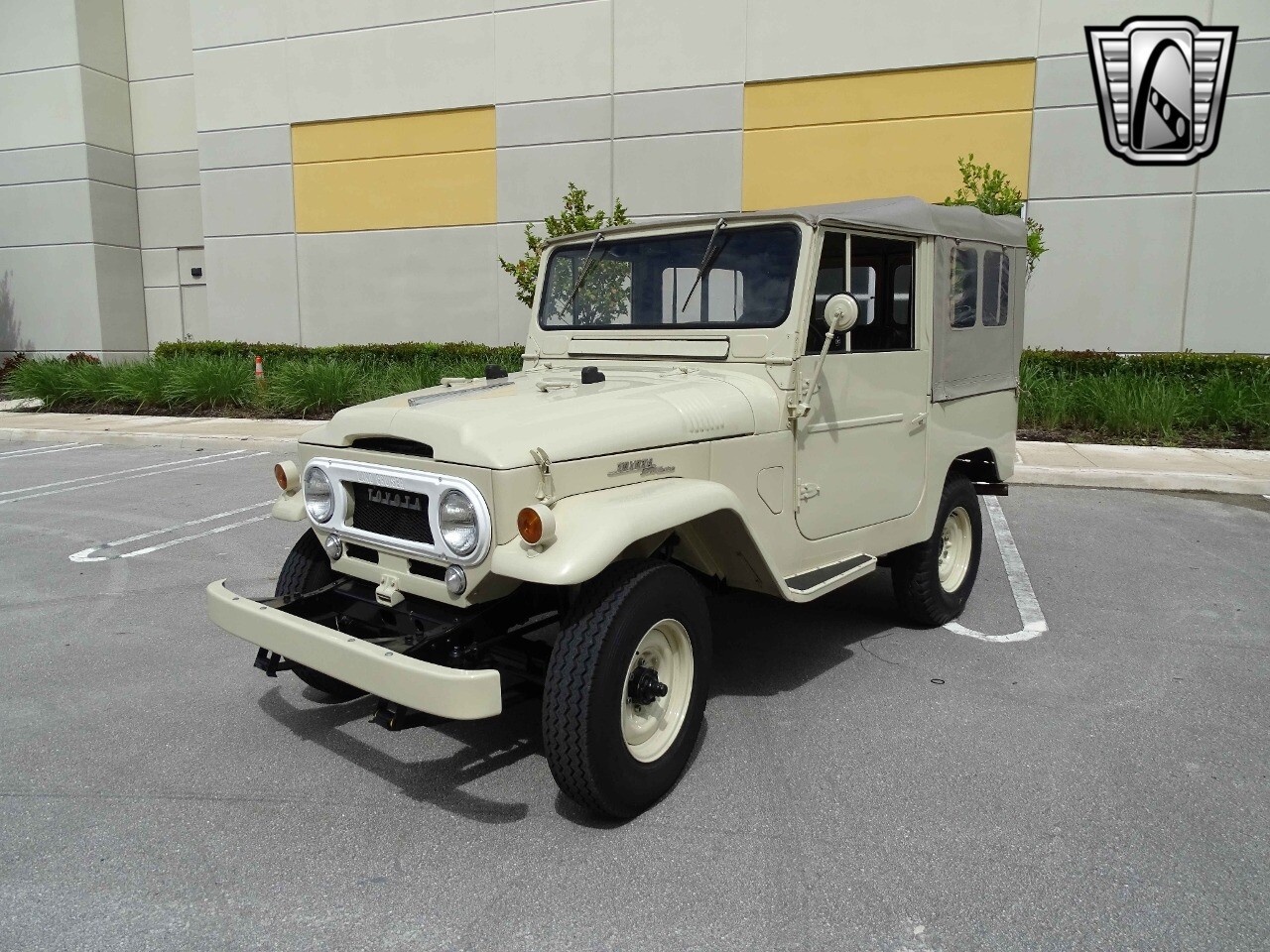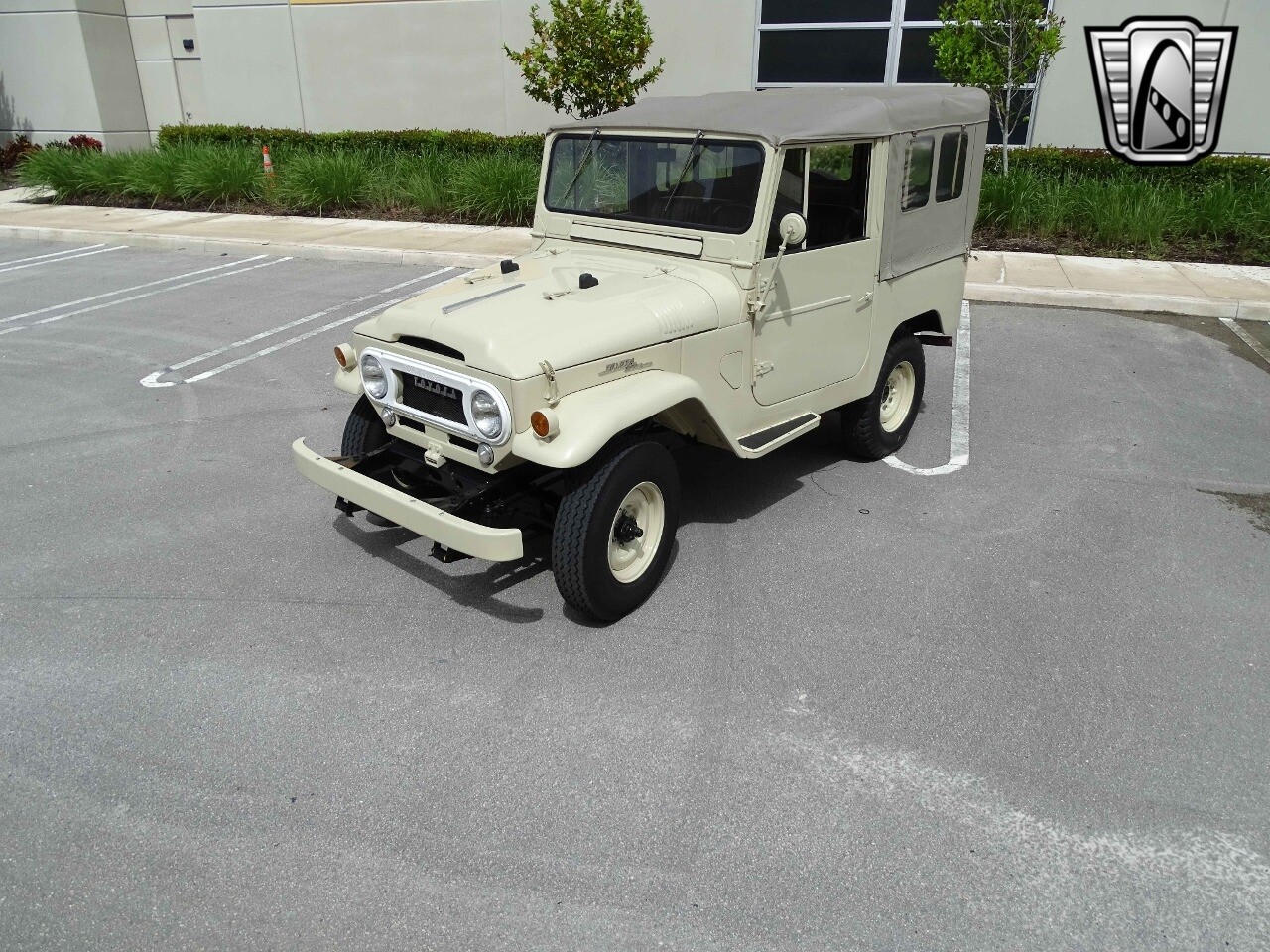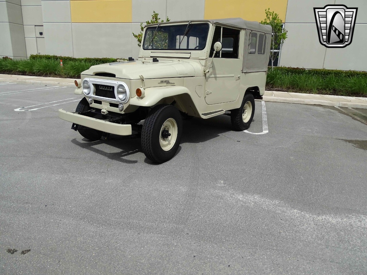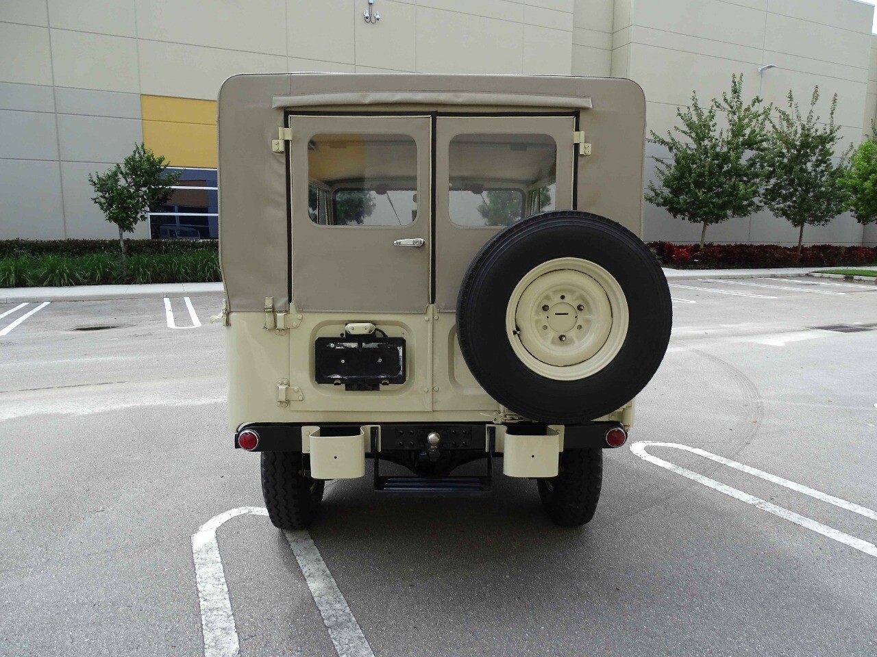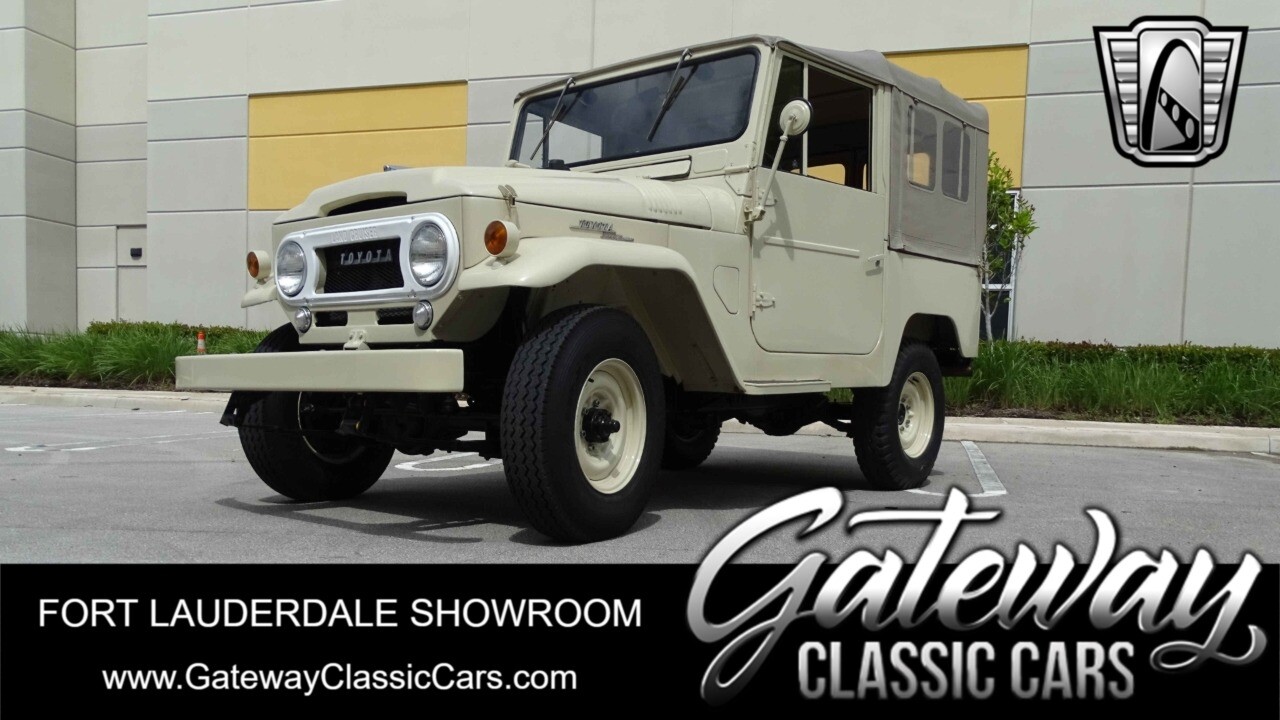 Introducing the classic 1961 Toyota Land Cruiser FJ40, a timeless icon of automotive history. This vehicle sports a sophisticated beige exterior that complements its sleek black vinyl interior, creating a harmonious blend of style and comfort.