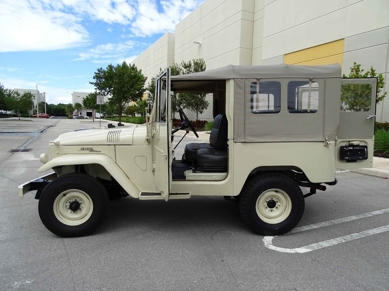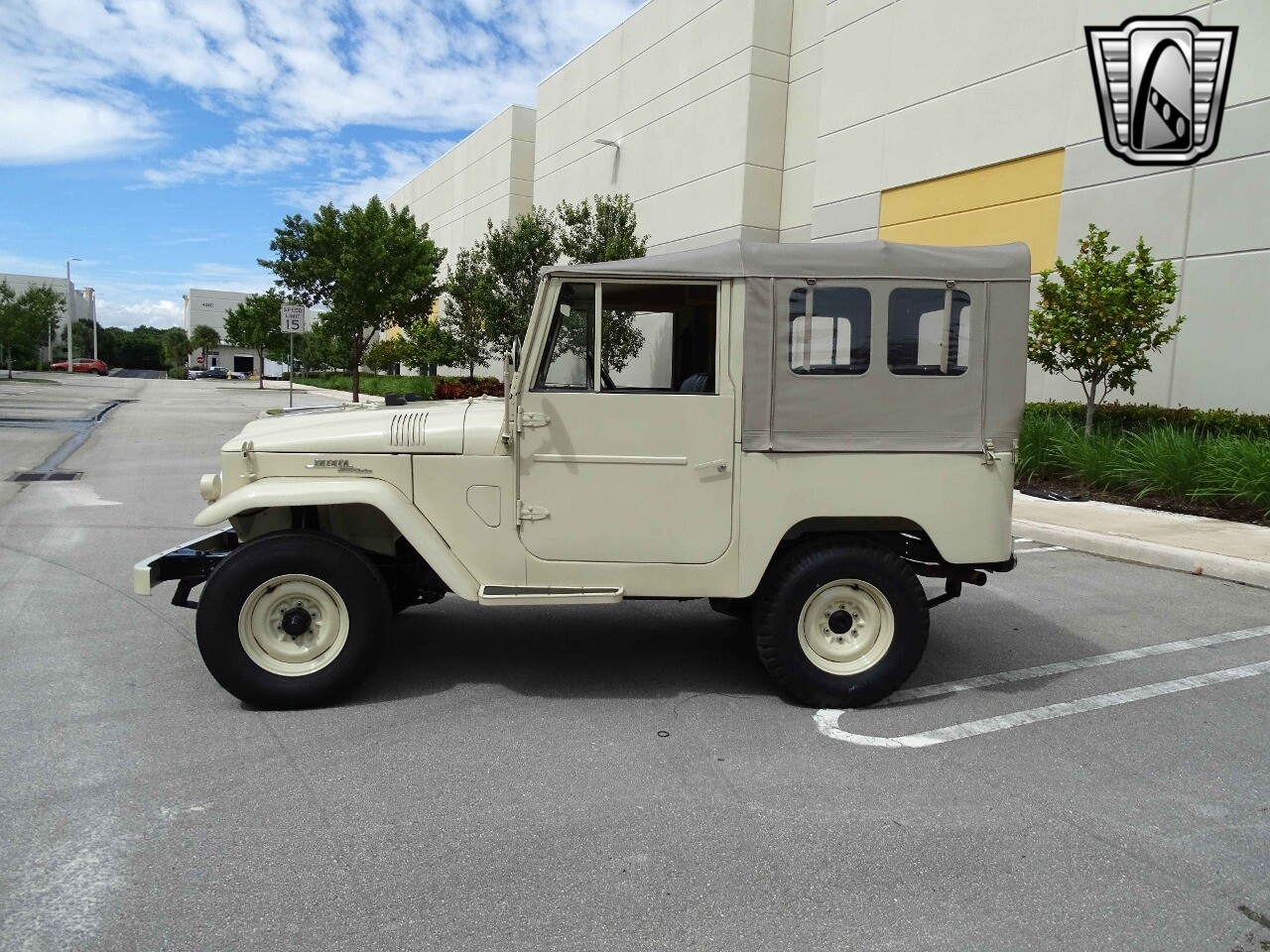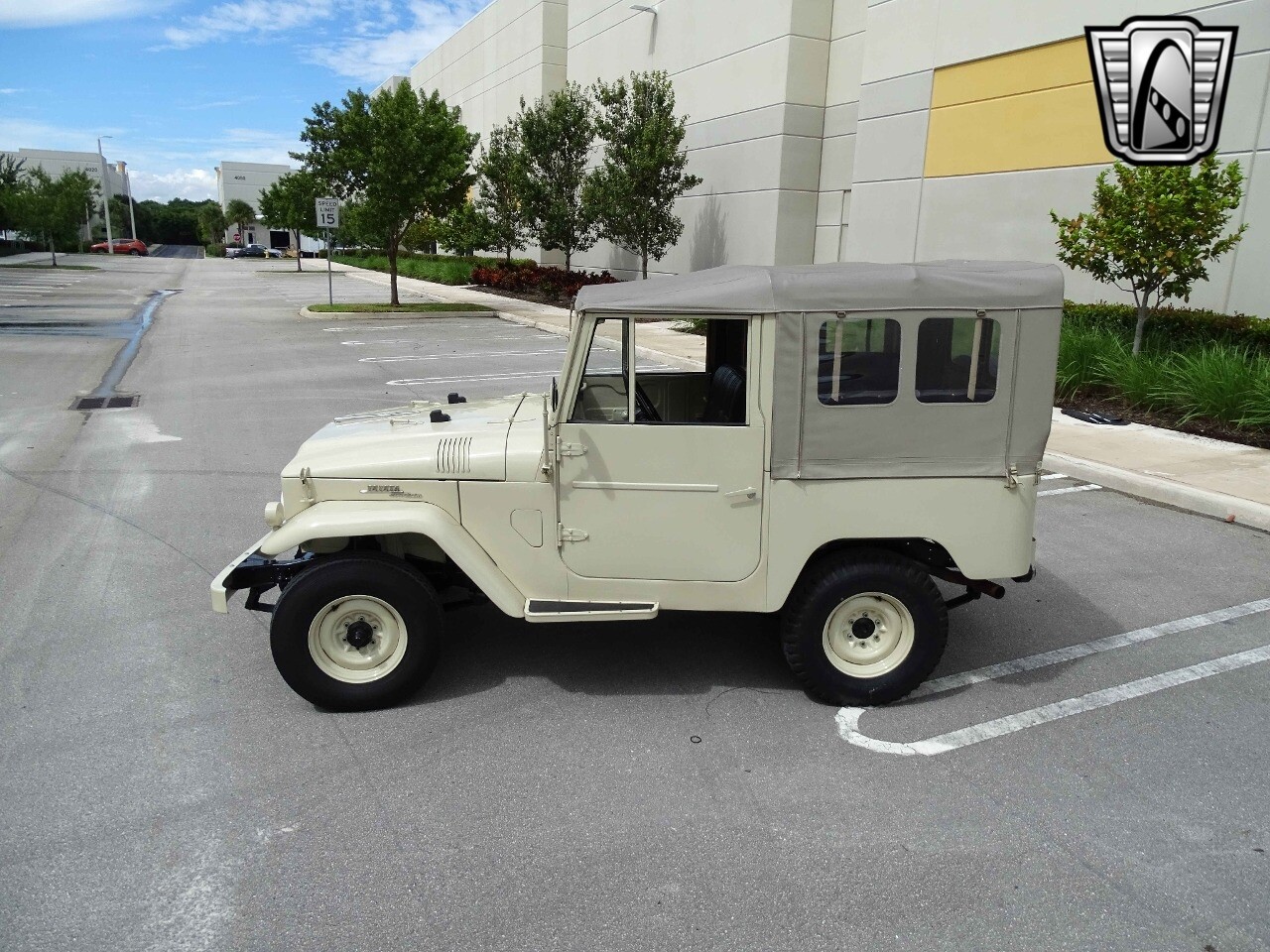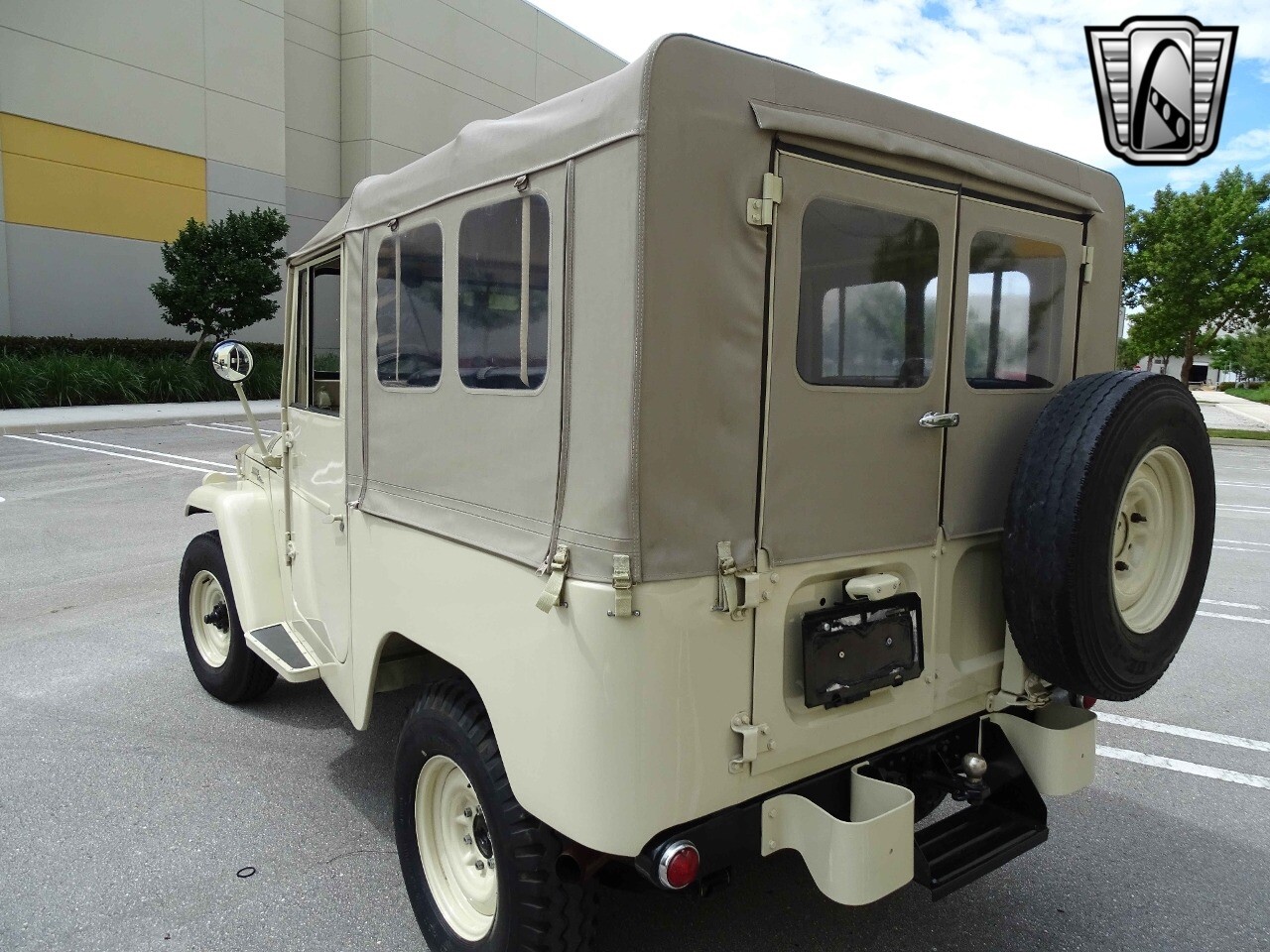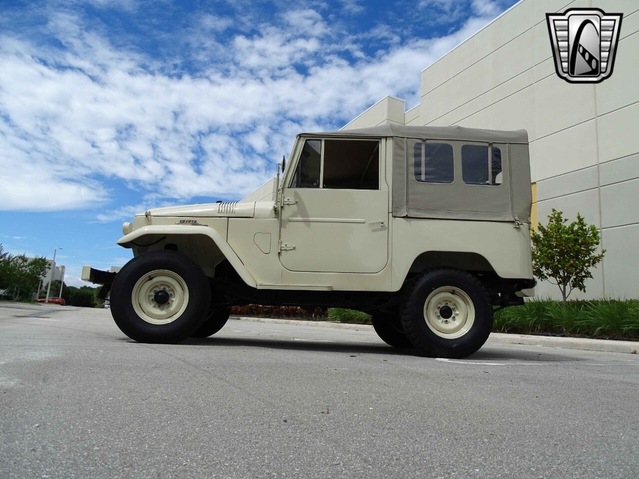 Introducing the classic 1961 Toyota Land Cruiser FJ40, a timeless icon of automotive history. This vehicle sports a sophisticated beige exterior that complements its sleek black vinyl interior, creating a harmonious blend of style and comfort.