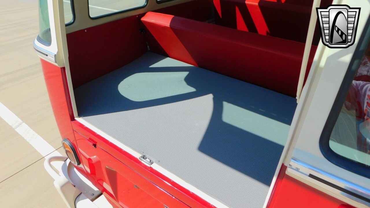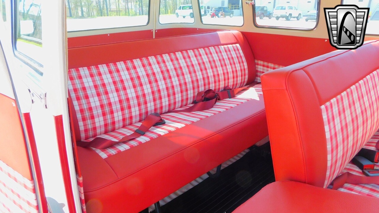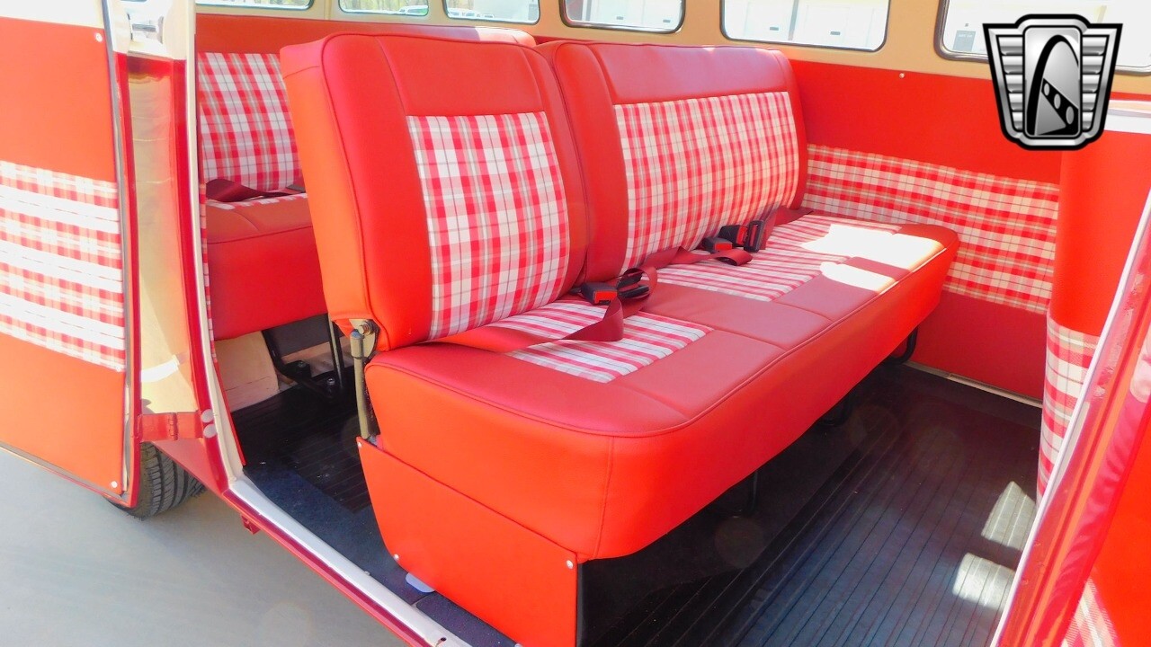 Inside this 1975 Volkswagen Type 2, you'll be welcomed by a red leather interior, an aura of elegance and adding to the unique charm of this classic vehicle. This model also comes equipped with seat belts.