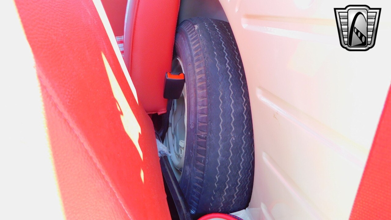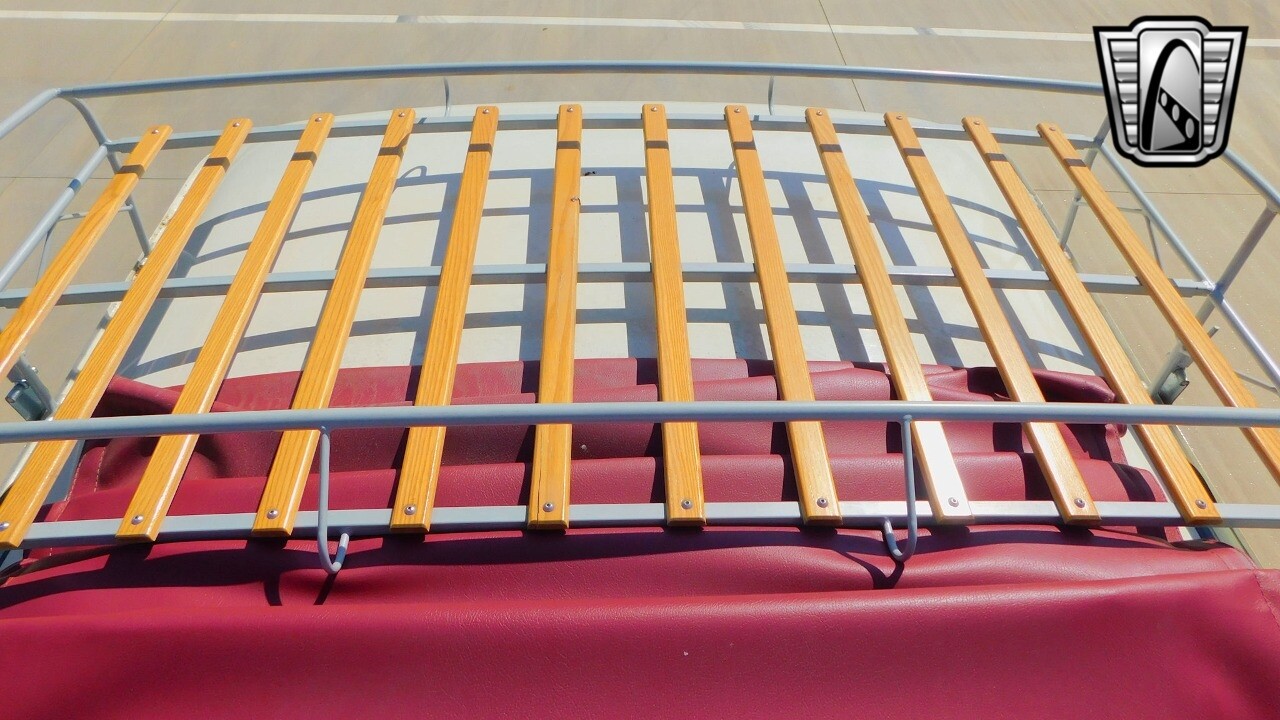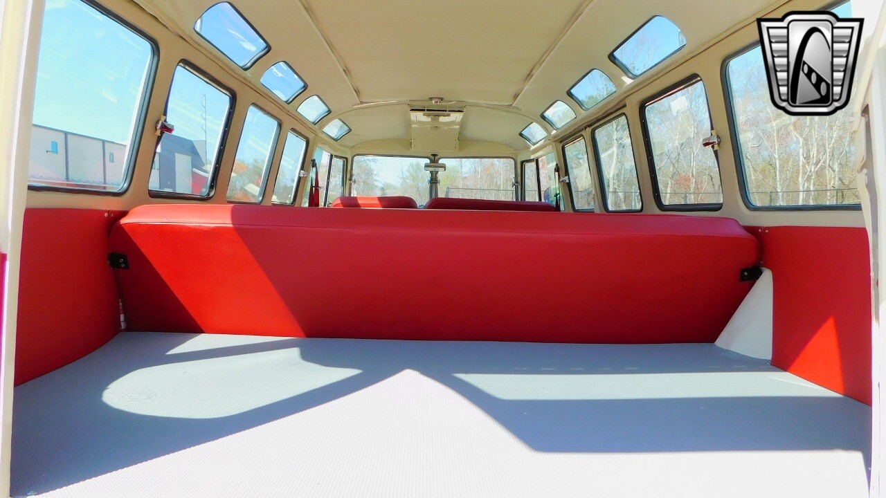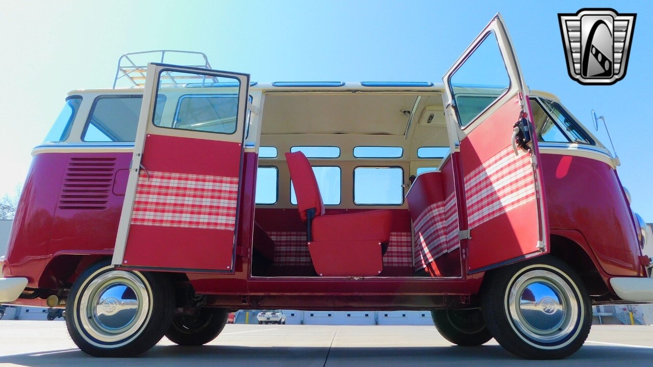 Inside this 1975 Volkswagen Type 2, you'll be welcomed by a red leather interior, an aura of elegance and adding to the unique charm of this classic vehicle. This model also comes equipped with seat belts.