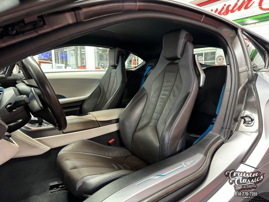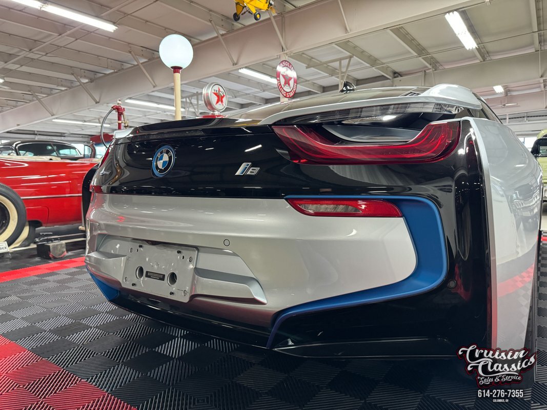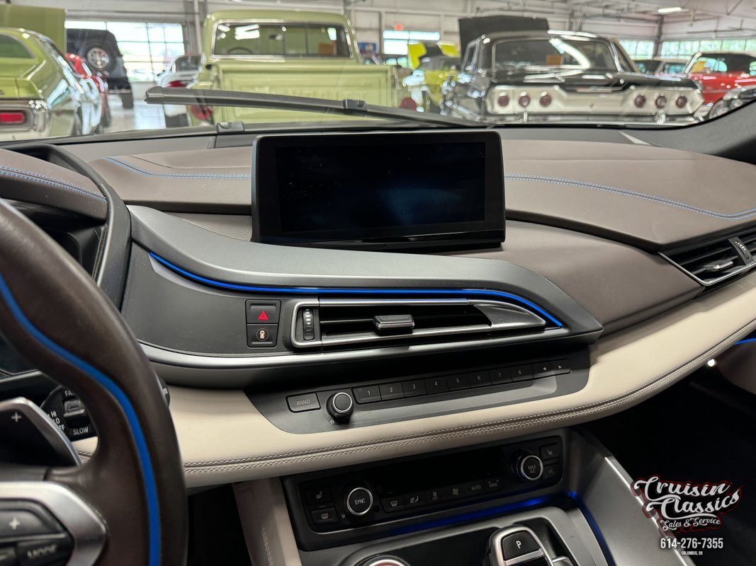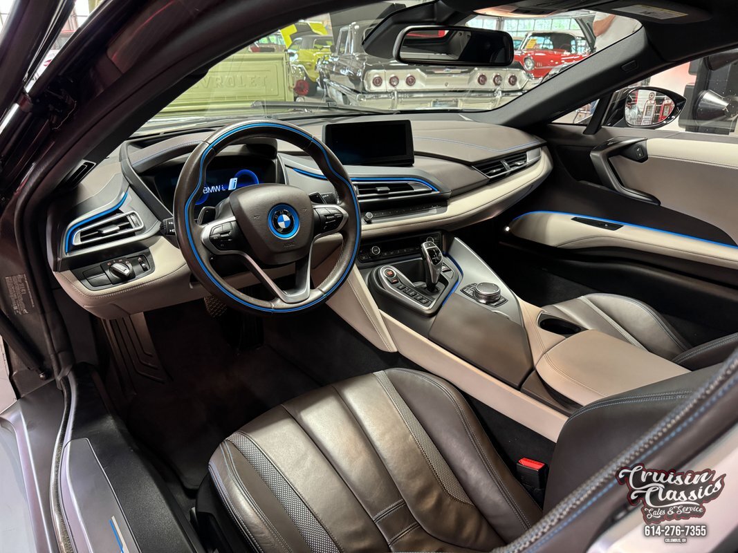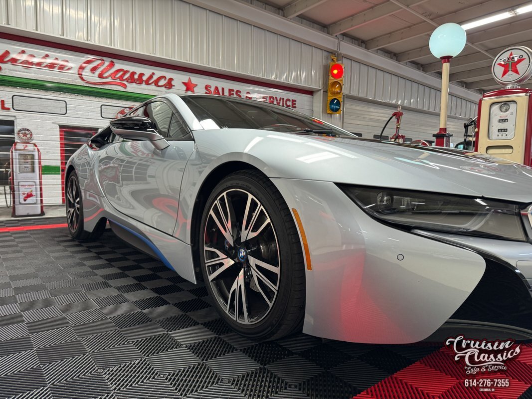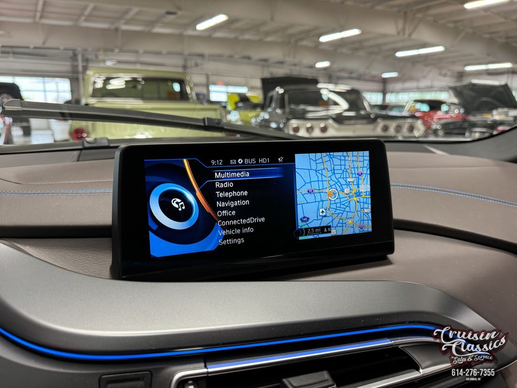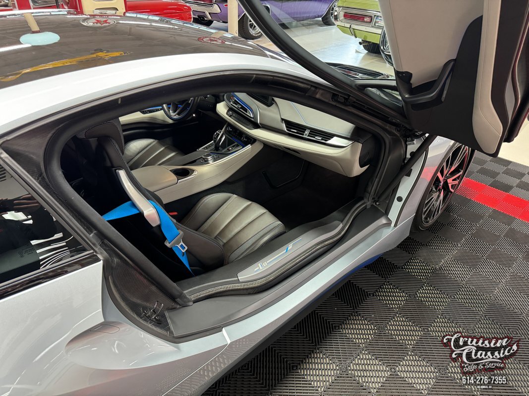Cruisin Classics is excited to present to you this stunning 2017 BMW i8. This is the first time we've had an i8 in our showroom and we're all blown away by this beautiful car. This i8 has only 17,878 actual miles on the odometer – an average of only 2,500 miles a year! It is dressed in it's factory colors of Ionic Silver with BMW iBlue and black accents and it looks simply fantastic. The paint and body are still in excellent condition, save for a small front bumper scuff and a tiny rock chip or two. The body styling is breathtaking with smooth curves and a low roof-line. The body was designed with BMW i-streamflow aerodynamics and has a drag coefficient of only .26, this ride is built with speed, performance and efficiency in mind. BMW strove to make this car as light as possible with a termoplastic front bumper, front fenders, and rear bumper as well as lightweight aluminum doors and hood. The black roof is even made of carbon fiber-reinforced plastic to save weight. This particular i8 is outfitted with the top tier "Tera-World" package that includes exterior upgrades like black brake calipers, 20" BMW iLight alloy wheels, and LED headlights with cornering. The alloy wheels are a perfect complement to the cars' styling and they're wrapped in a set of Bridgestone Potenza tires. At the rear of the car you'll find a set of LED BMW U-shaped tail lights that accentuate the flying butress-like rear styling. The glass tailgate lifts up to reveal a small storage space with a compartment cover and leather panels that cover the mid-engine. As if the exterior of the car wasn't already cool enough, BMW took things to another level by adding exceptionally well-designed "butterfly" doors that lift open with ease and create an incredible visual impact.