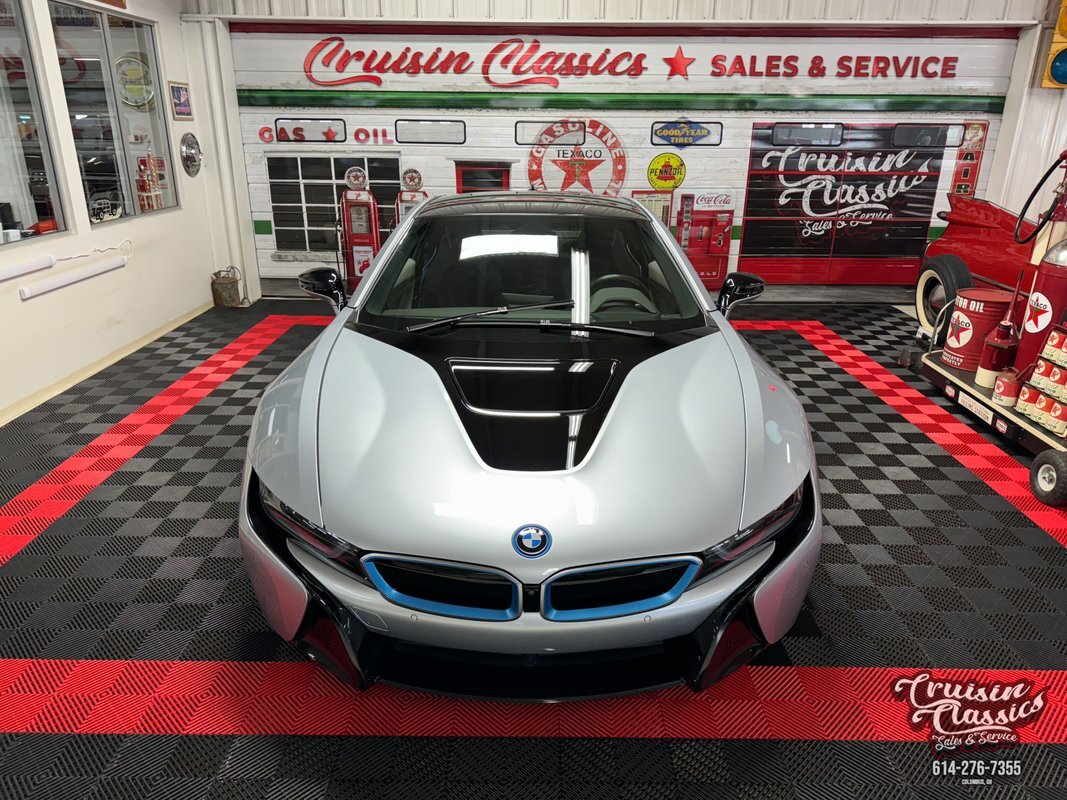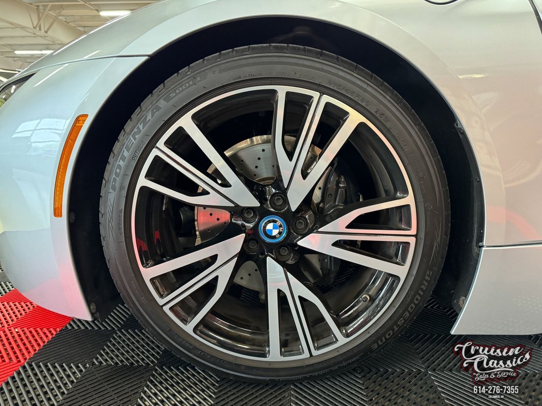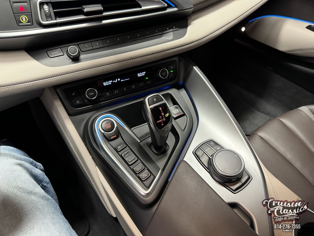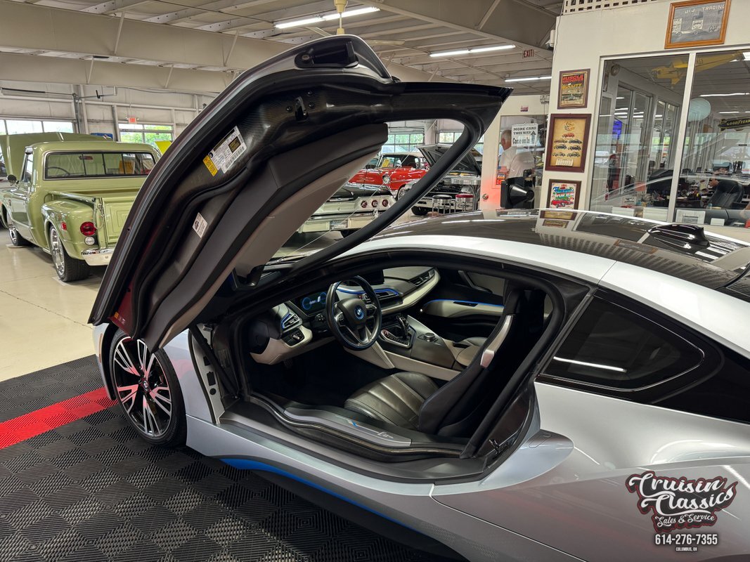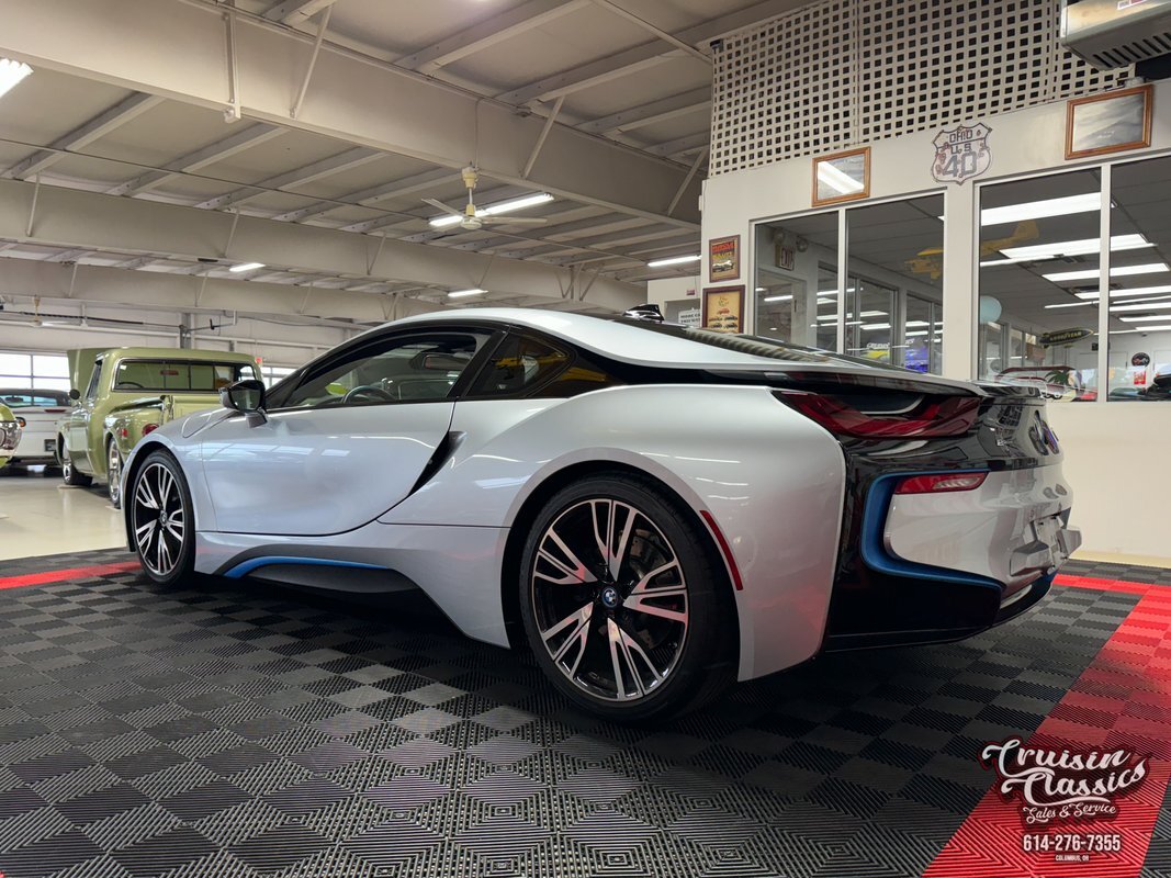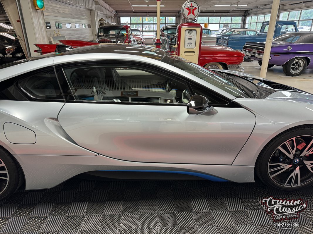 Cruisin Classics is excited to present to you this stunning 2017 BMW i8. This is the first time we've had an i8 in our showroom and we're all blown away by this beautiful car. This i8 has only 17,878 actual miles on the odometer – an average of only 2,500 miles a year! It is dressed in it's factory colors of Ionic Silver with BMW iBlue and black accents and it looks simply fantastic. The paint and body are still in excellent condition, save for a small front bumper scuff and a tiny rock chip or two. The body styling is breathtaking with smooth curves and a low roof-line. The body was designed with BMW i-streamflow aerodynamics and has a drag coefficient of only .26, this ride is built with speed, performance and efficiency in mind. BMW strove to make this car as light as possible with a termoplastic front bumper, front fenders, and rear bumper as well as lightweight aluminum doors and hood. The black roof is even made of carbon fiber-reinforced plastic to save weight. This particular i8 is outfitted with the top tier "Tera-World" package that includes exterior upgrades like black brake calipers, 20" BMW iLight alloy wheels, and LED headlights with cornering. The alloy wheels are a perfect complement to the cars' styling and they're wrapped in a set of Bridgestone Potenza tires. At the rear of the car you'll find a set of LED BMW U-shaped tail lights that accentuate the flying butress-like rear styling. The glass tailgate lifts up to reveal a small storage space with a compartment cover and leather panels that cover the mid-engine. As if the exterior of the car wasn't already cool enough, BMW took things to another level by adding exceptionally well-designed "butterfly" doors that lift open with ease and create an incredible visual impact.