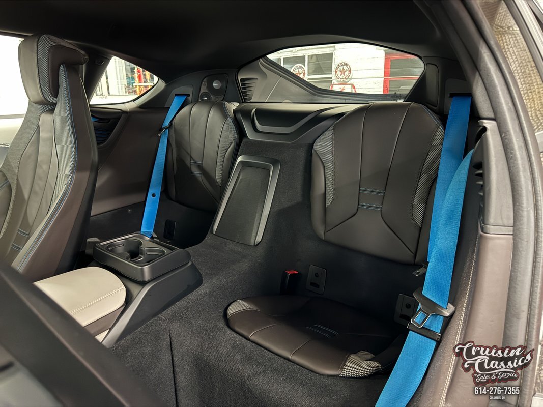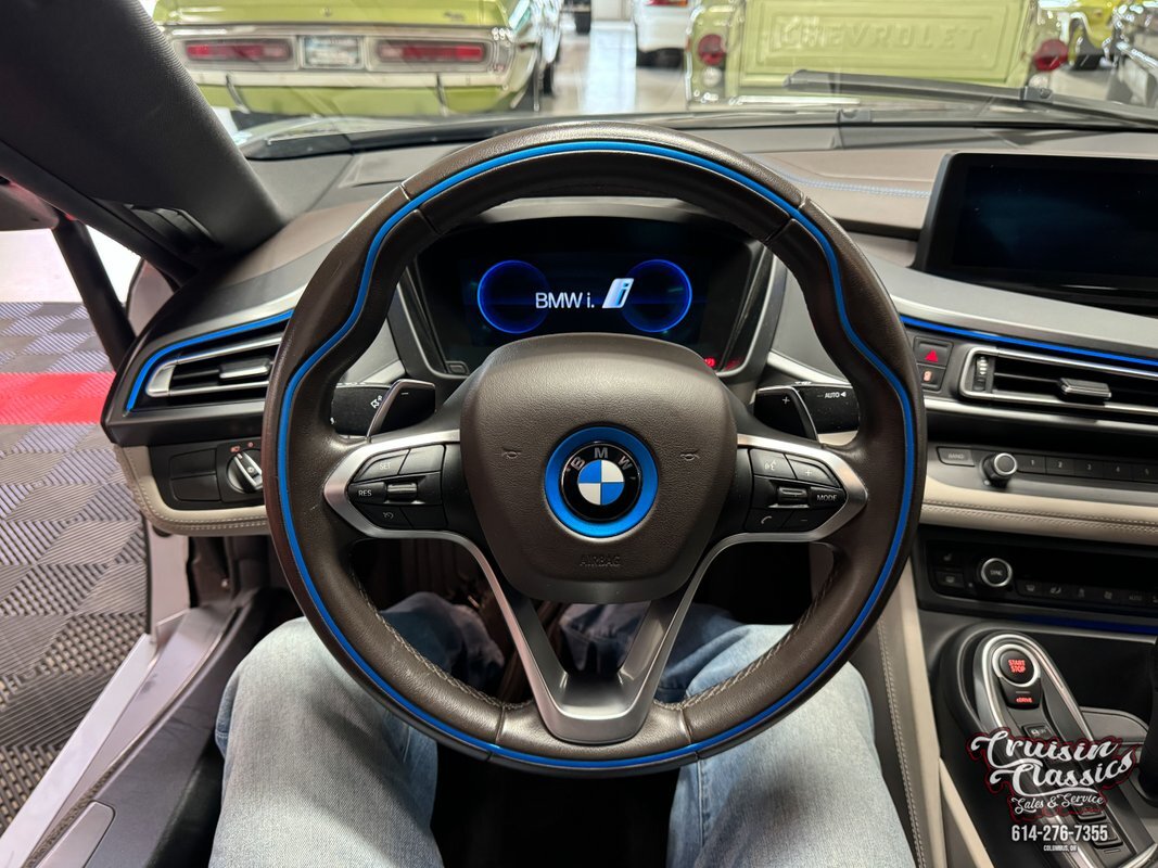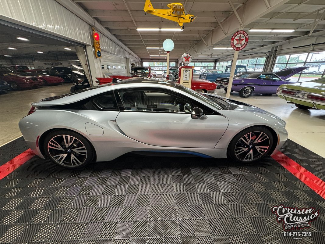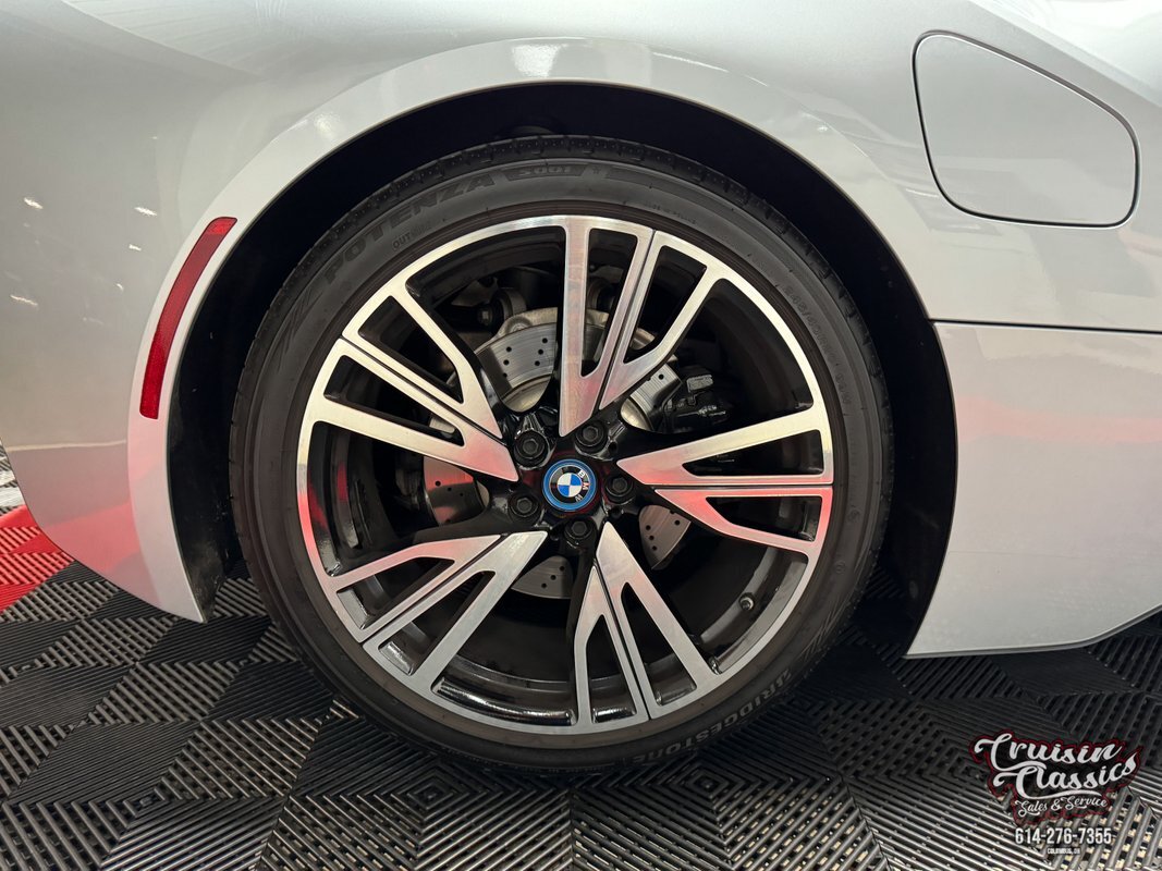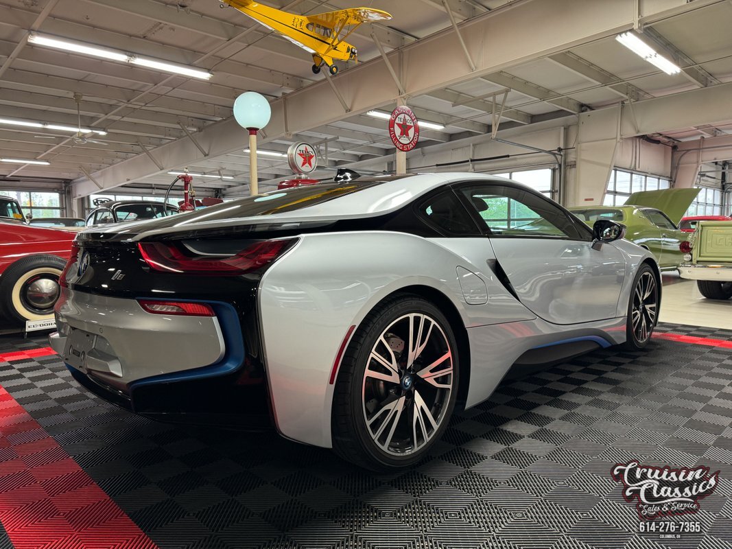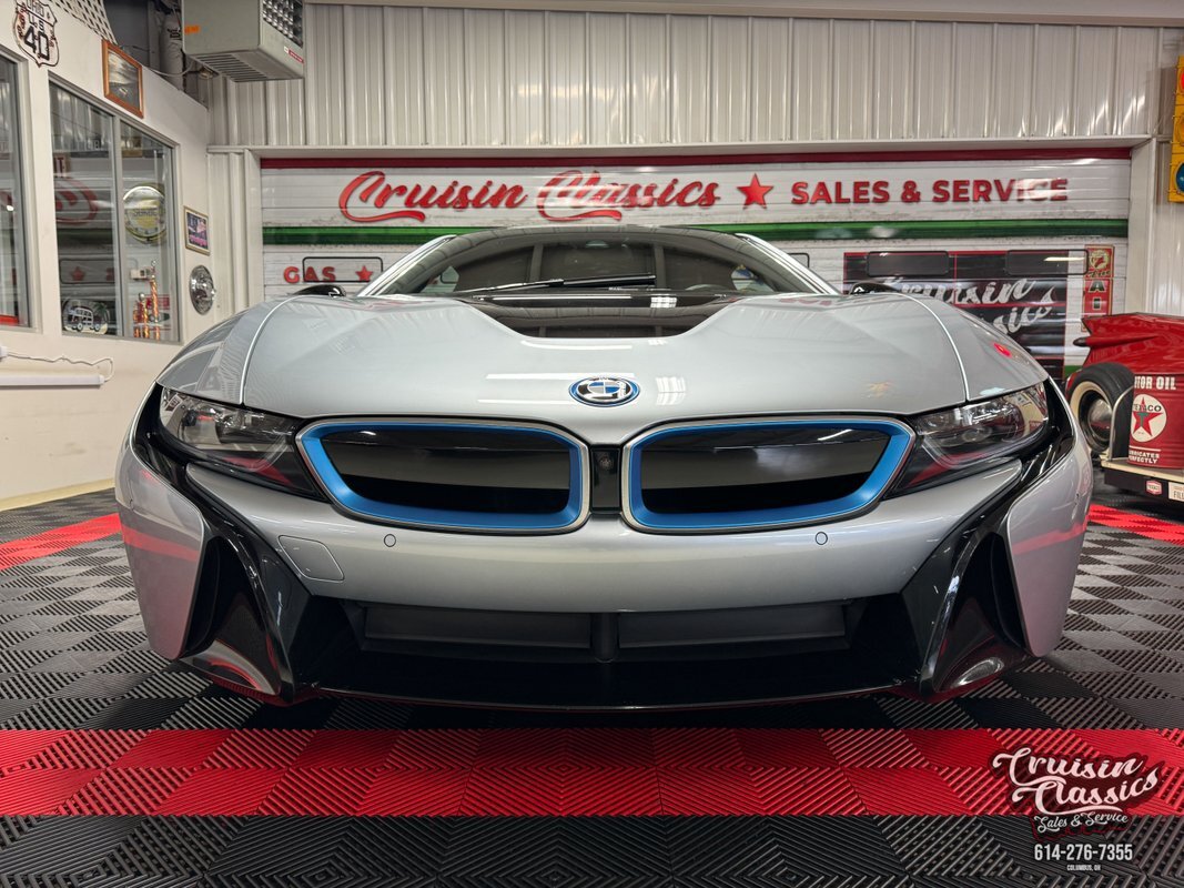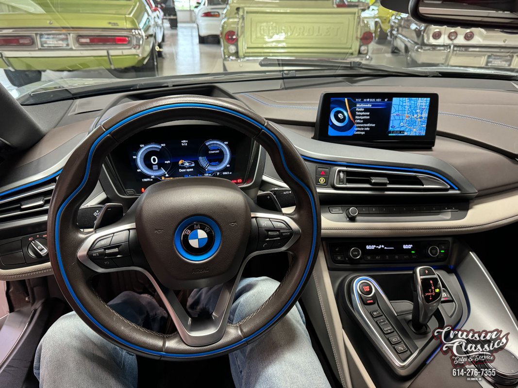 Cruisin Classics is excited to present to you this stunning 2017 BMW i8. This is the first time we've had an i8 in our showroom and we're all blown away by this beautiful car. This i8 has only 17,878 actual miles on the odometer – an average of only 2,500 miles a year! It is dressed in it's factory colors of Ionic Silver with BMW iBlue and black accents and it looks simply fantastic. The paint and body are still in excellent condition, save for a small front bumper scuff and a tiny rock chip or two. The body styling is breathtaking with smooth curves and a low roof-line. The body was designed with BMW i-streamflow aerodynamics and has a drag coefficient of only .26, this ride is built with speed, performance and efficiency in mind. BMW strove to make this car as light as possible with a termoplastic front bumper, front fenders, and rear bumper as well as lightweight aluminum doors and hood. The black roof is even made of carbon fiber-reinforced plastic to save weight. This particular i8 is outfitted with the top tier "Tera-World" package that includes exterior upgrades like black brake calipers, 20" BMW iLight alloy wheels, and LED headlights with cornering. The alloy wheels are a perfect complement to the cars' styling and they're wrapped in a set of Bridgestone Potenza tires. At the rear of the car you'll find a set of LED BMW U-shaped tail lights that accentuate the flying butress-like rear styling. The glass tailgate lifts up to reveal a small storage space with a compartment cover and leather panels that cover the mid-engine. As if the exterior of the car wasn't already cool enough, BMW took things to another level by adding exceptionally well-designed "butterfly" doors that lift open with ease and create an incredible visual impact.