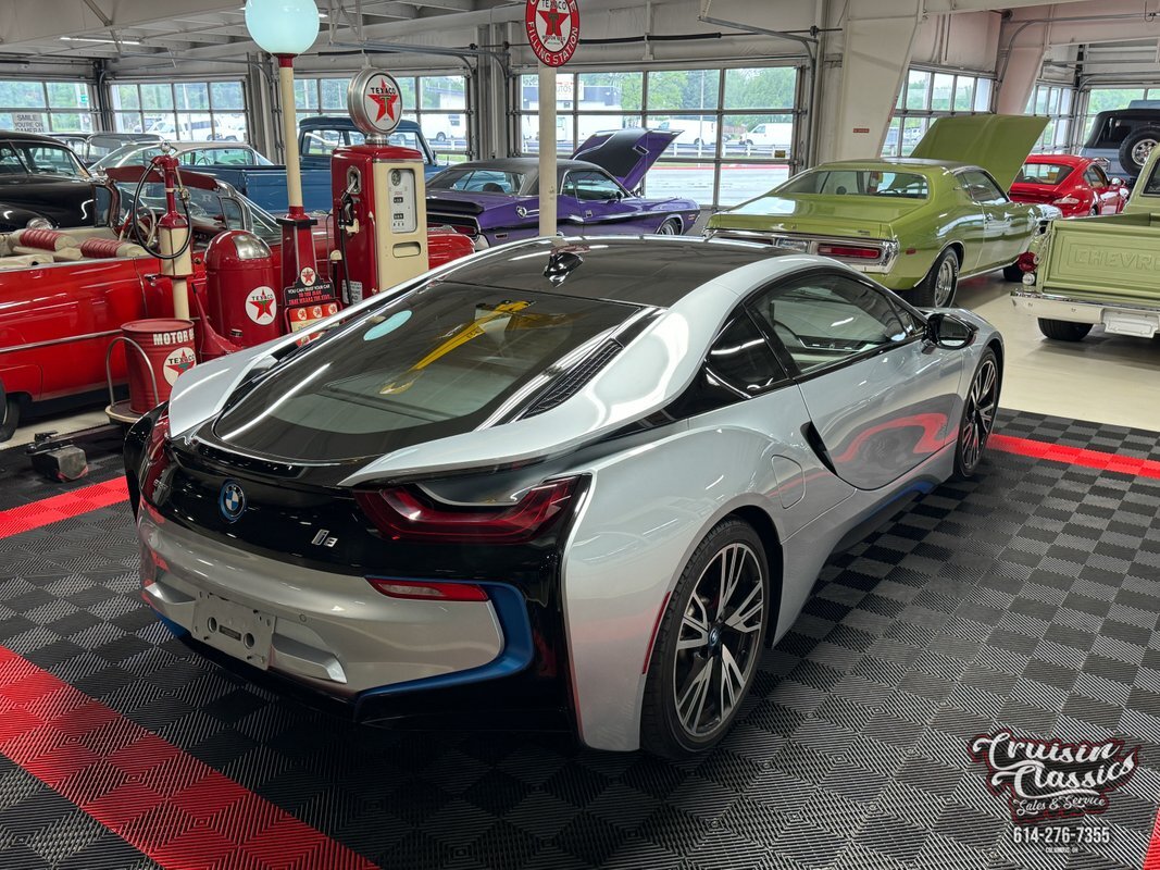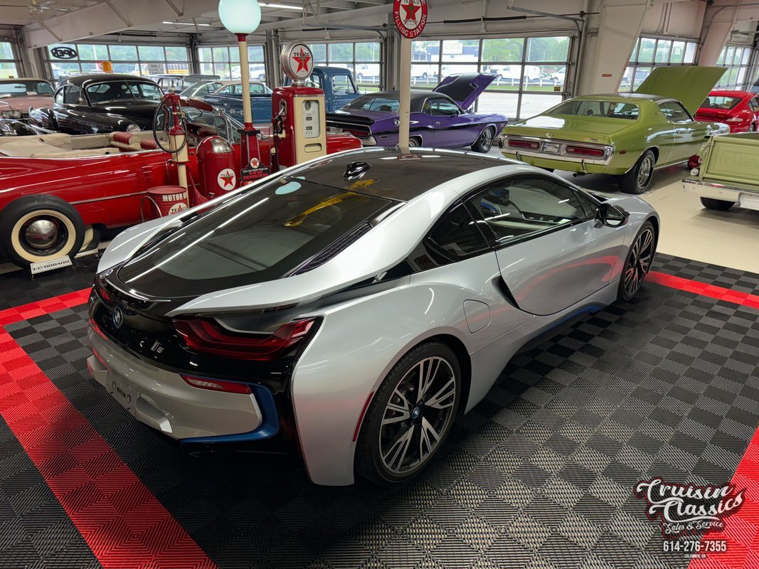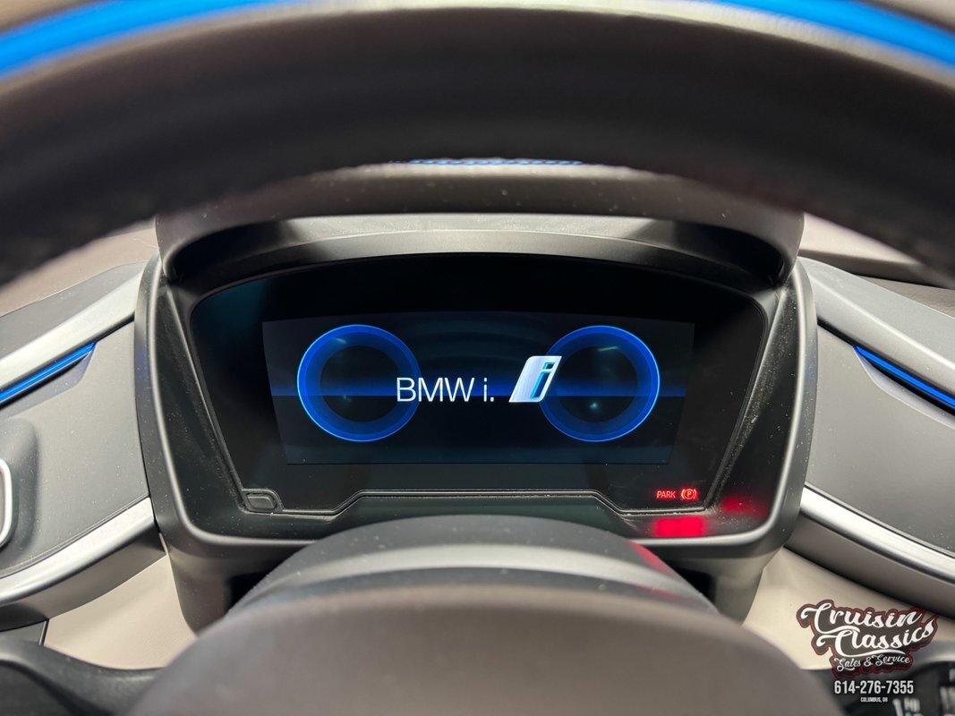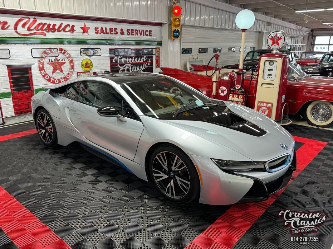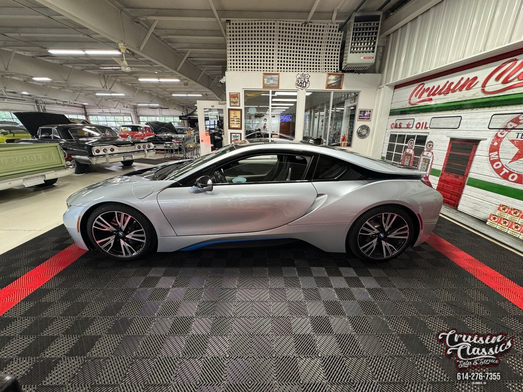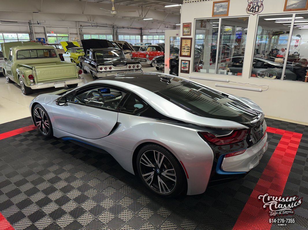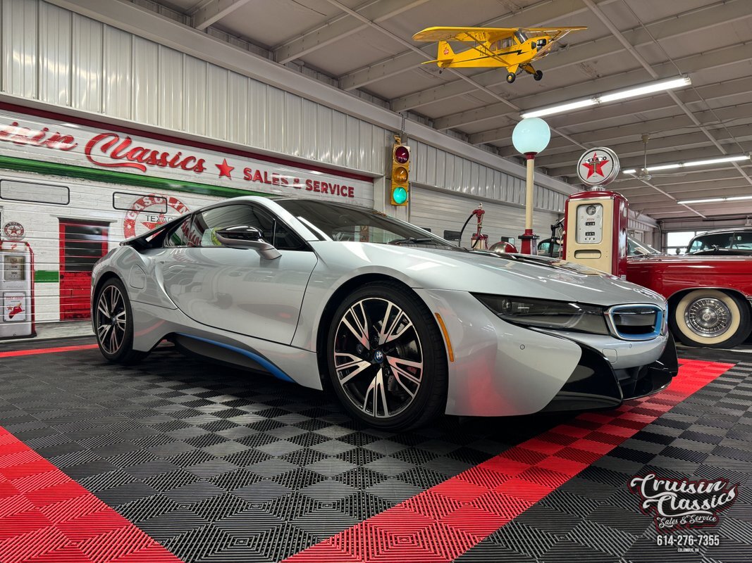 Cruisin Classics is excited to present to you this stunning 2017 BMW i8. This is the first time we've had an i8 in our showroom and we're all blown away by this beautiful car. This i8 has only 17,878 actual miles on the odometer – an average of only 2,500 miles a year! It is dressed in it's factory colors of Ionic Silver with BMW iBlue and black accents and it looks simply fantastic. The paint and body are still in excellent condition, save for a small front bumper scuff and a tiny rock chip or two. The body styling is breathtaking with smooth curves and a low roof-line. The body was designed with BMW i-streamflow aerodynamics and has a drag coefficient of only .26, this ride is built with speed, performance and efficiency in mind. BMW strove to make this car as light as possible with a termoplastic front bumper, front fenders, and rear bumper as well as lightweight aluminum doors and hood. The black roof is even made of carbon fiber-reinforced plastic to save weight. This particular i8 is outfitted with the top tier "Tera-World" package that includes exterior upgrades like black brake calipers, 20" BMW iLight alloy wheels, and LED headlights with cornering. The alloy wheels are a perfect complement to the cars' styling and they're wrapped in a set of Bridgestone Potenza tires. At the rear of the car you'll find a set of LED BMW U-shaped tail lights that accentuate the flying butress-like rear styling. The glass tailgate lifts up to reveal a small storage space with a compartment cover and leather panels that cover the mid-engine. As if the exterior of the car wasn't already cool enough, BMW took things to another level by adding exceptionally well-designed "butterfly" doors that lift open with ease and create an incredible visual impact.