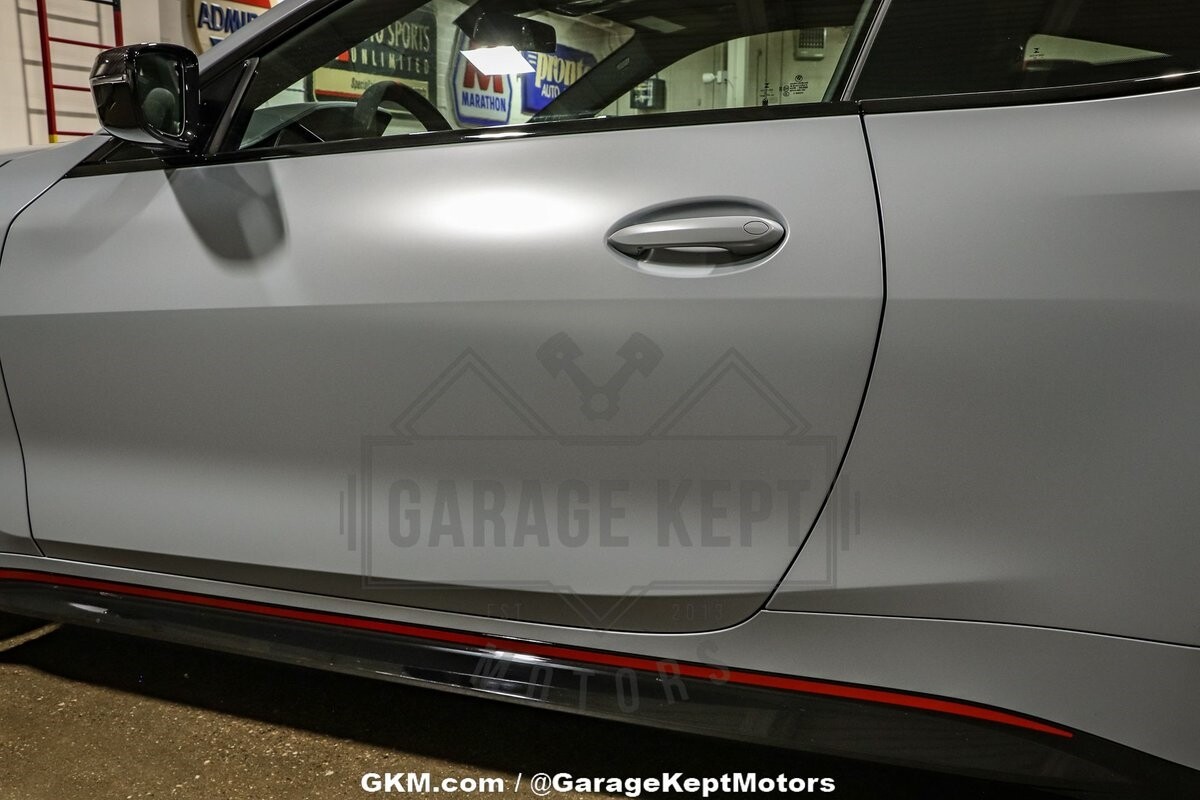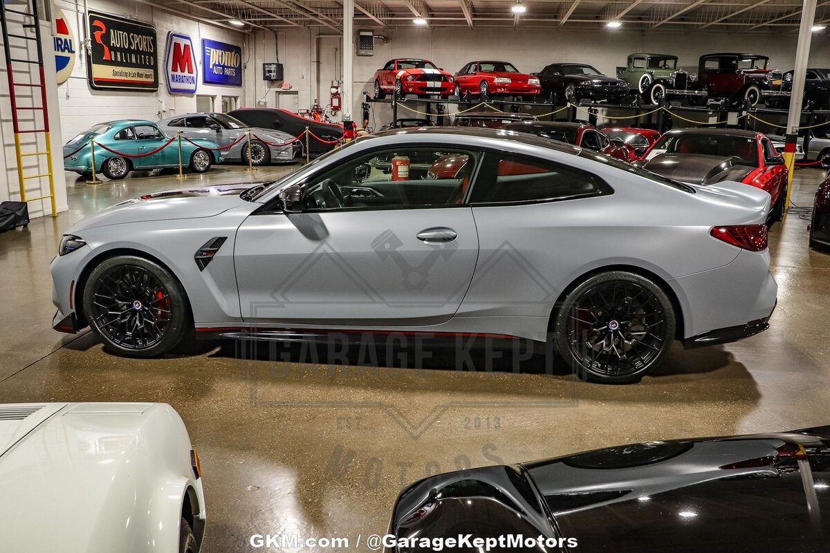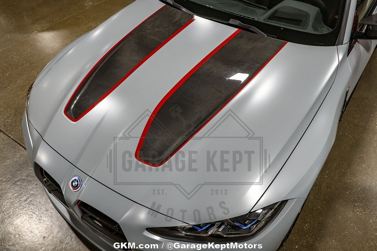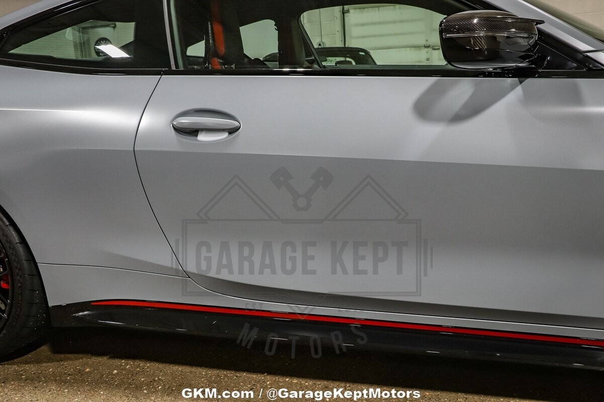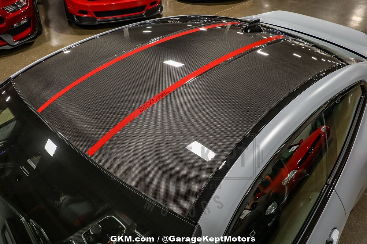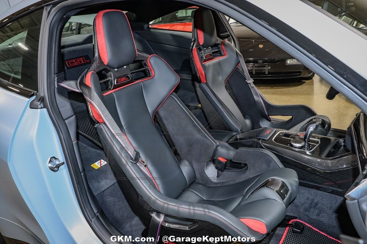 The exterior is finished in a stunning Frozen Brooklyn Grey Metallic, a unique and sophisticated color that perfectly complements the aggressive lines and aerodynamic design of the M4 CSL. This eye-catching hue not only enhances the car's aesthetic appeal but also underscores its exclusivity. Inside, the black and red leather interior offers a perfect blend of sportiness and luxury, providing a comfortable and stylish environment for both driver and passenger.