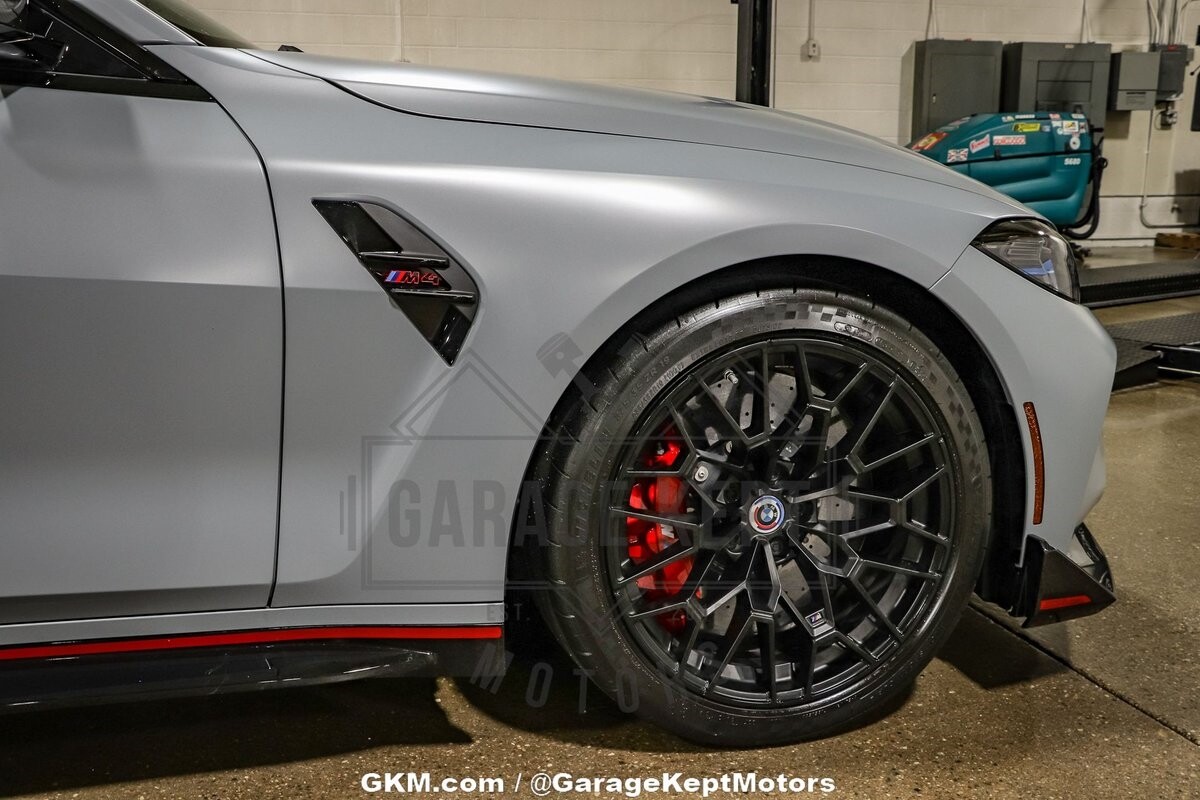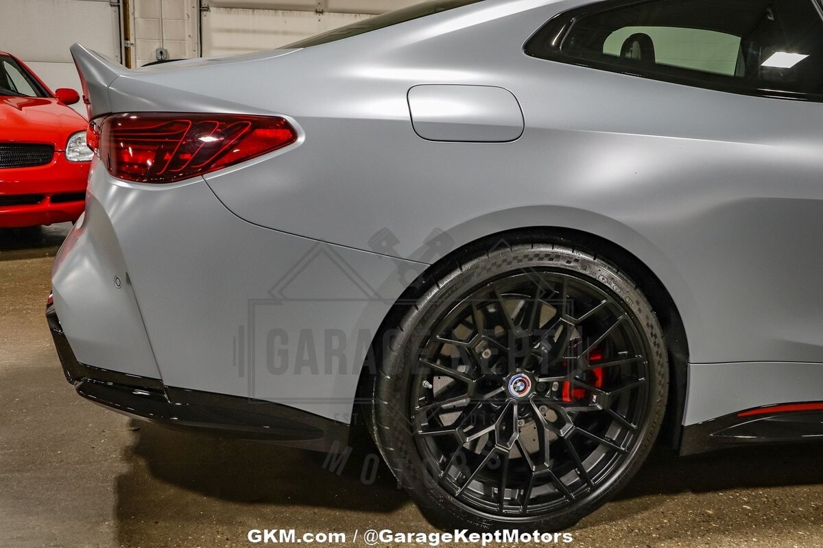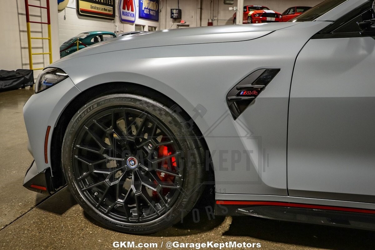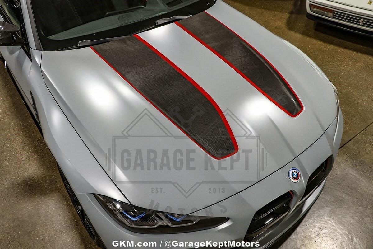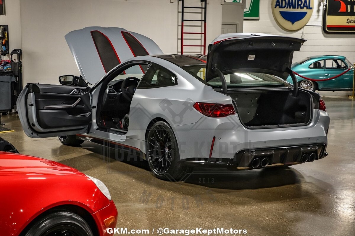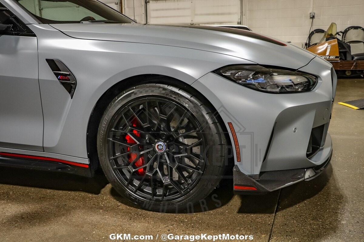 The exterior is finished in a stunning Frozen Brooklyn Grey Metallic, a unique and sophisticated color that perfectly complements the aggressive lines and aerodynamic design of the M4 CSL. This eye-catching hue not only enhances the car's aesthetic appeal but also underscores its exclusivity. Inside, the black and red leather interior offers a perfect blend of sportiness and luxury, providing a comfortable and stylish environment for both driver and passenger.