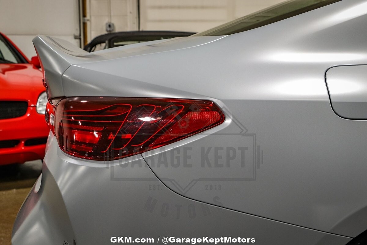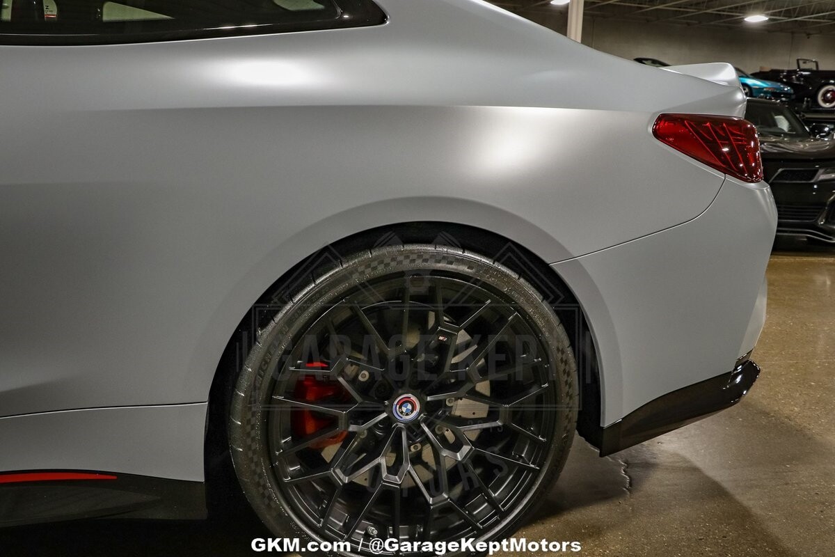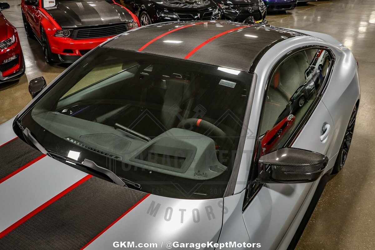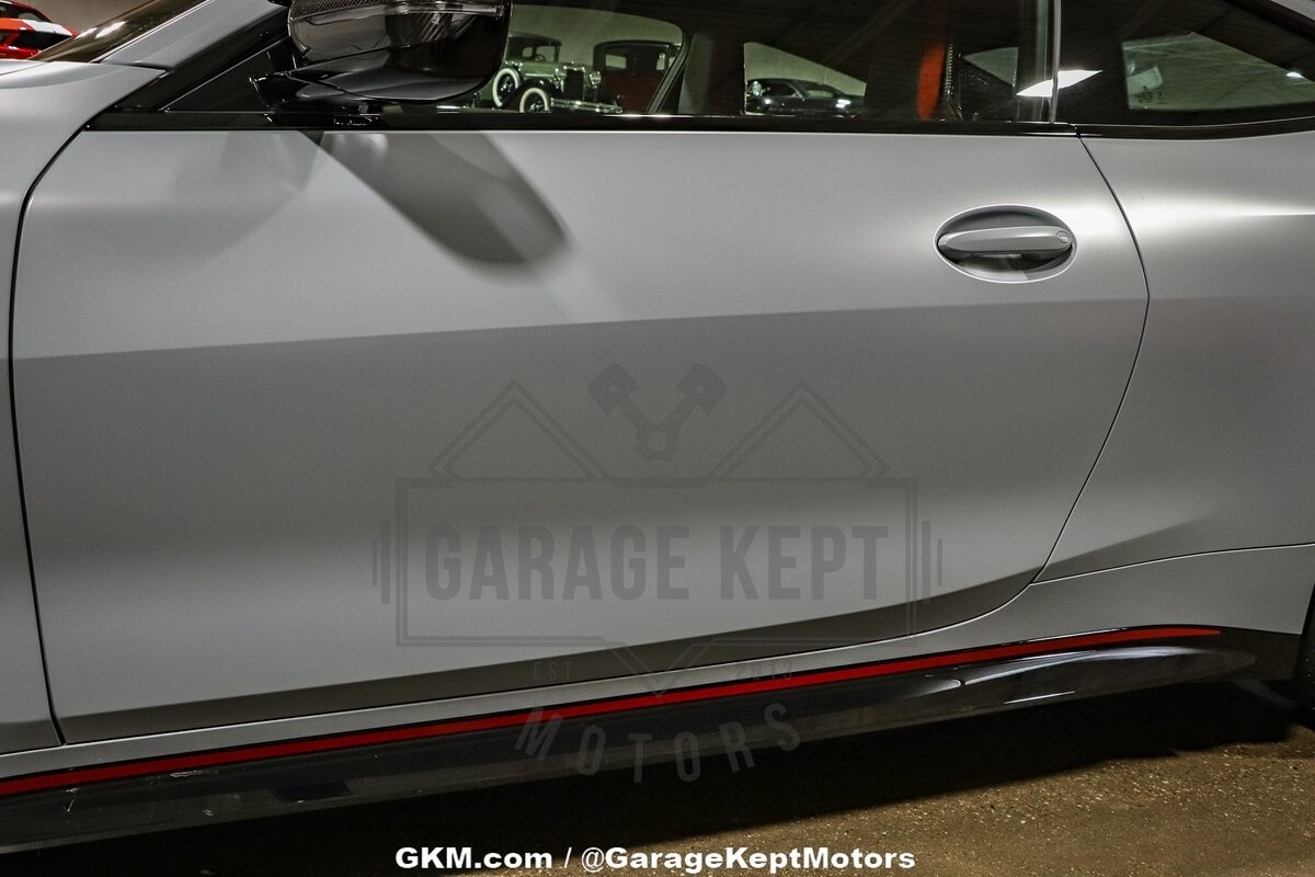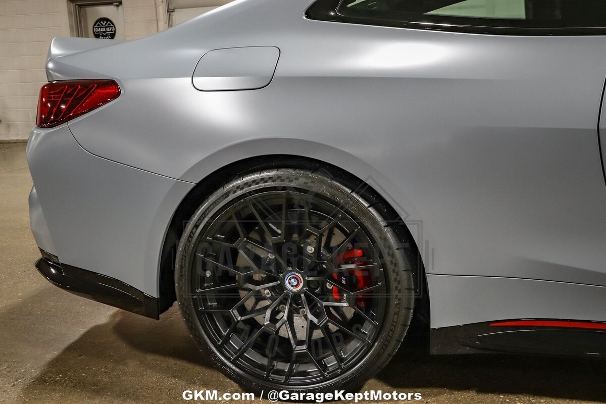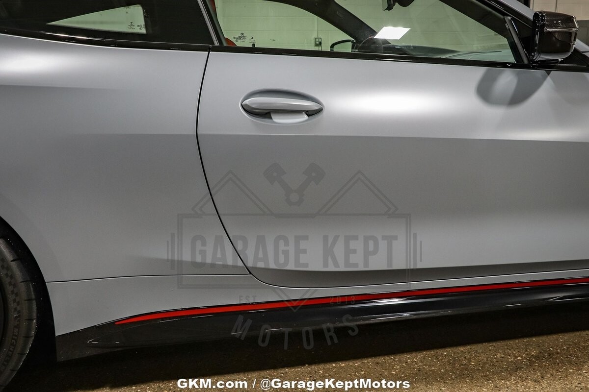 The exterior is finished in a stunning Frozen Brooklyn Grey Metallic, a unique and sophisticated color that perfectly complements the aggressive lines and aerodynamic design of the M4 CSL. This eye-catching hue not only enhances the car's aesthetic appeal but also underscores its exclusivity. Inside, the black and red leather interior offers a perfect blend of sportiness and luxury, providing a comfortable and stylish environment for both driver and passenger.