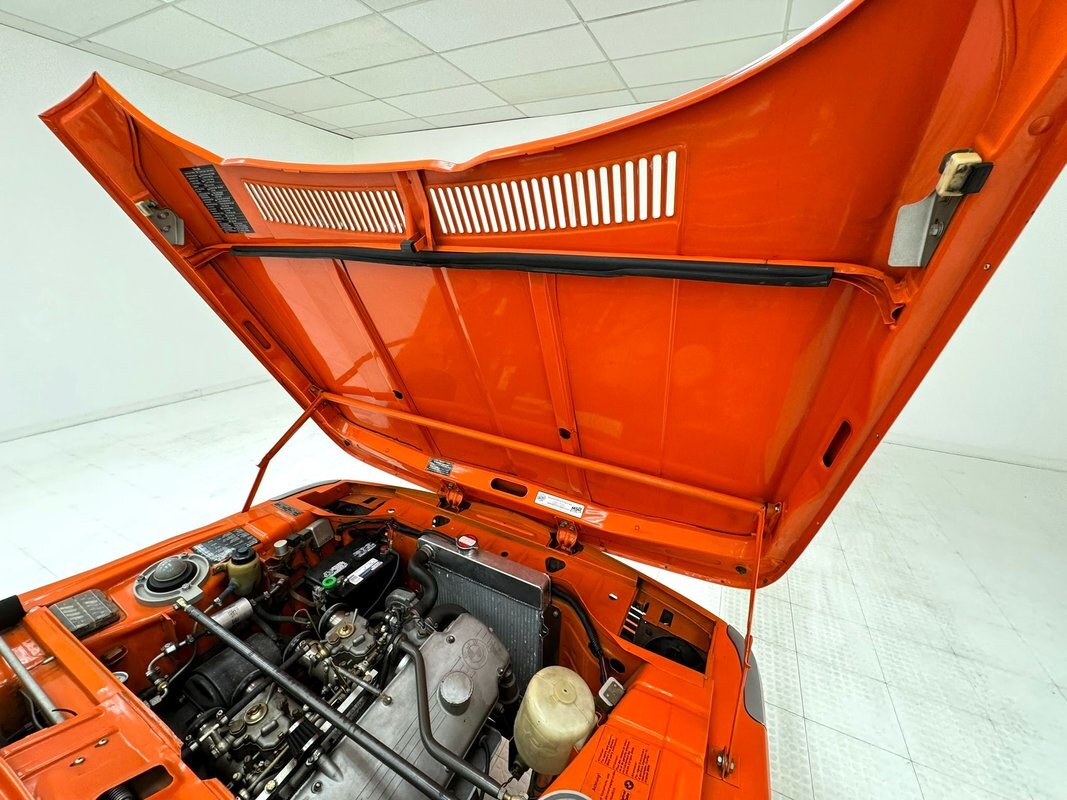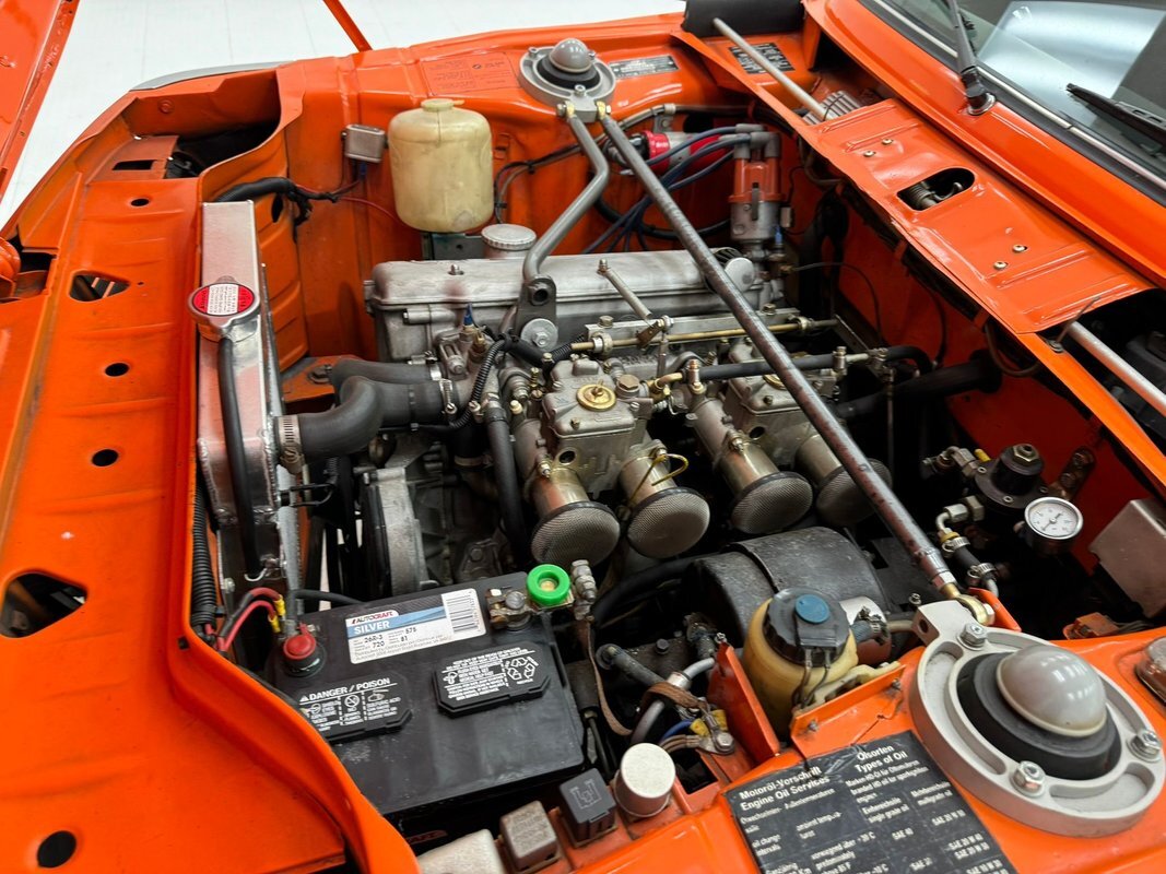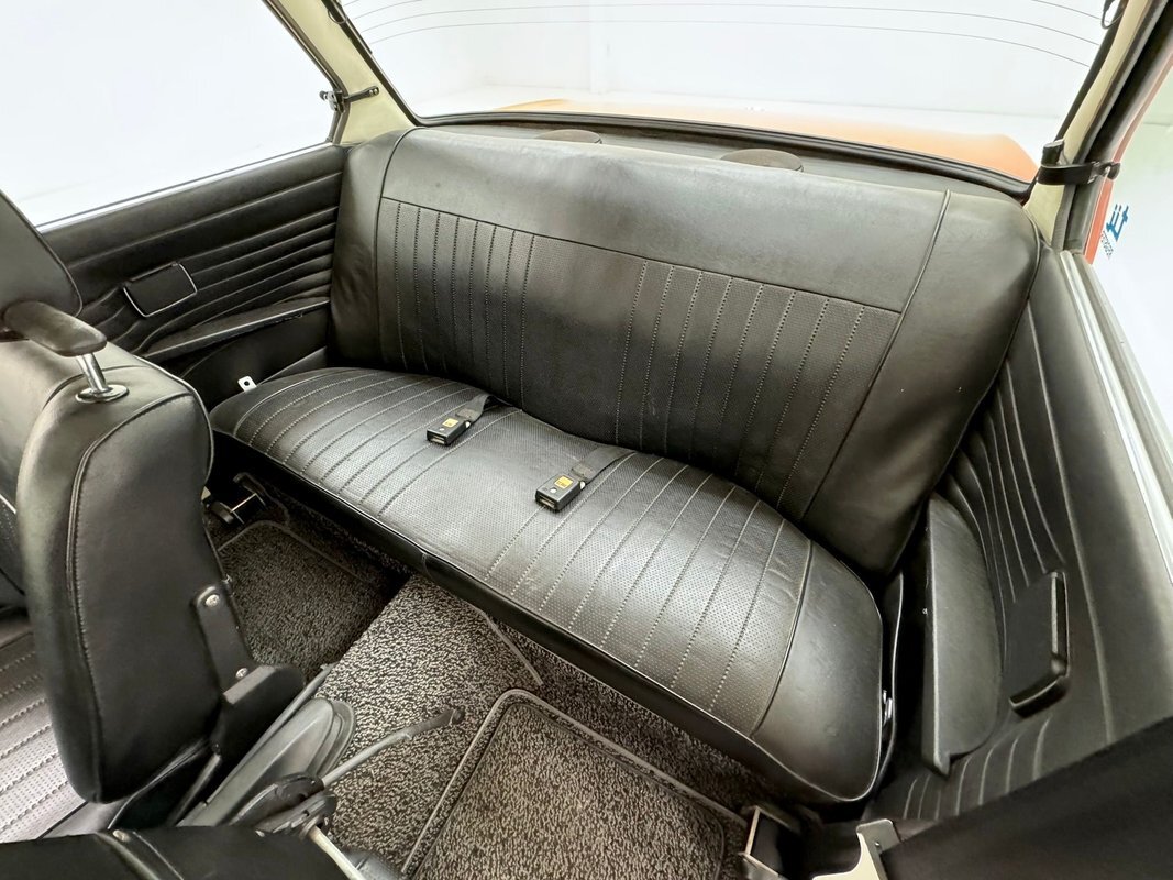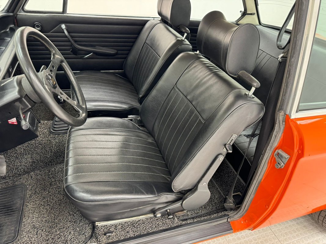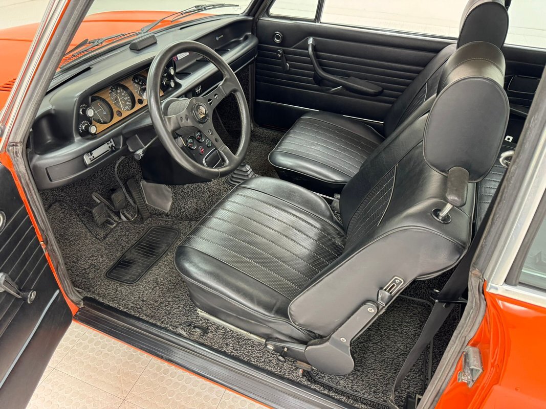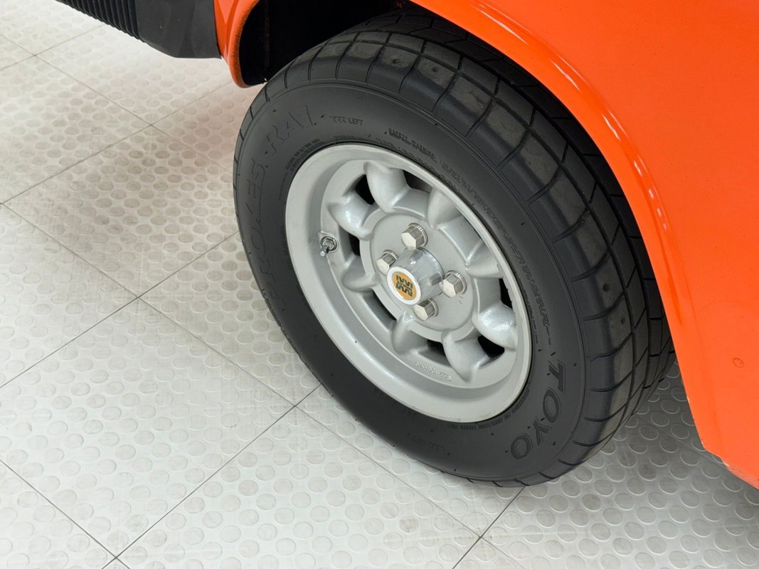 Inca Orange makes a bright appearance on every body panel and uniquely, the bumpers. If the model alone doesn't get attention, the blast of orange paint surely will. Rally lights emerge from the front bumper flaking the kidney grille. The side markers are rounded around the fender corners in a noteworthy design cue. The factory sunroof does not leak per the consignor and the original 13-inch Minilite wheels look fantastic. Tall windows on this little car create a greenhouse effect and aid in visibility for this driving machine. A square back is finished with ANSA dual exhaust tips exiting in the center. A closer look reveals some body filler repair on the rear valance, chipping paint along a bottom edge, flaking rust under some bubbles also on a lower edge, and various other rock chips, touch-ups, and bubbling on or near edge surfaces. We also note filler plugs where the body side molding once resided, but fear not as our consignor is including all the trim and attaching clips.