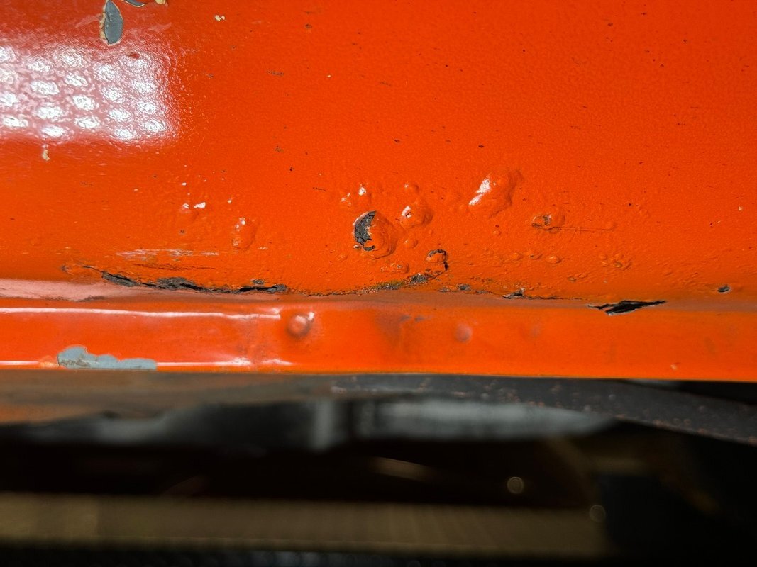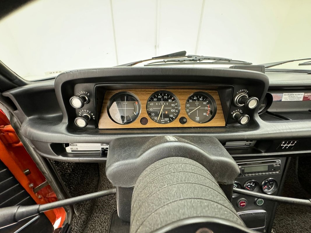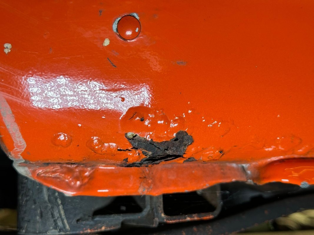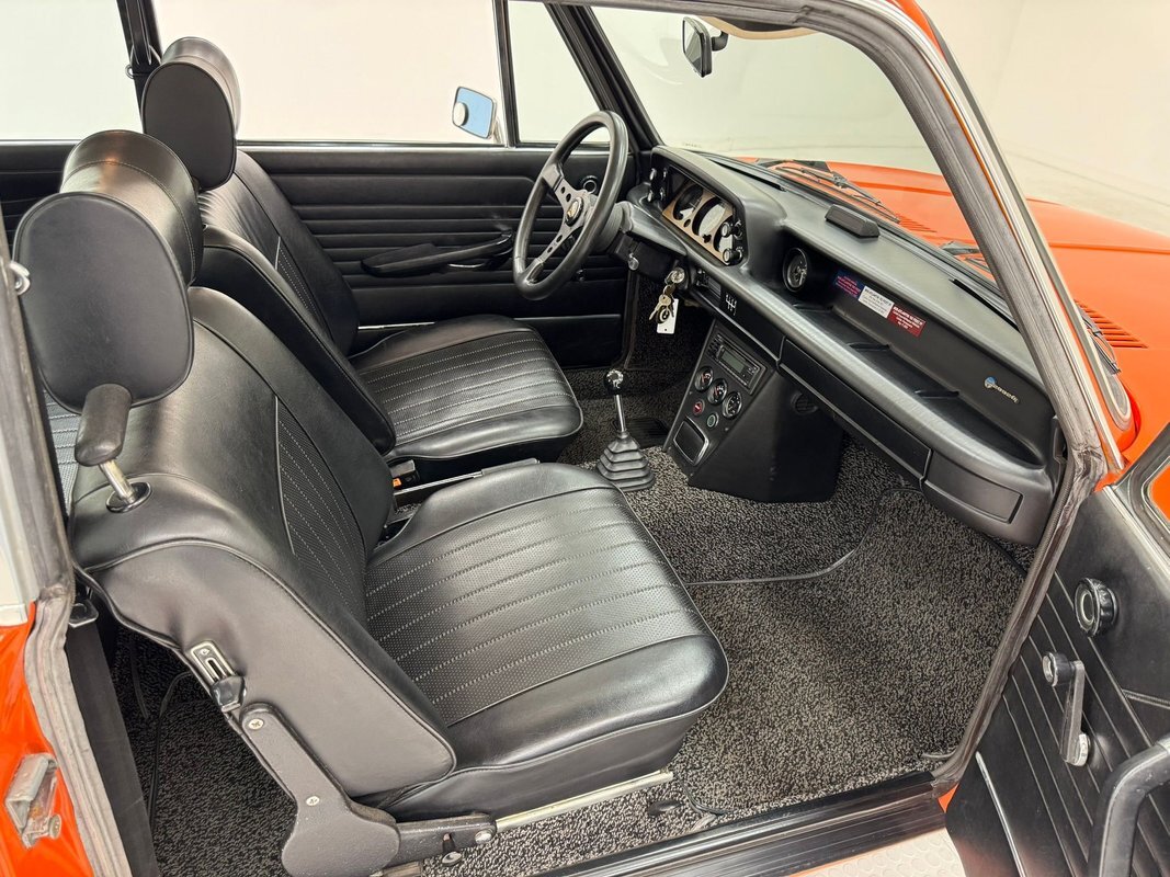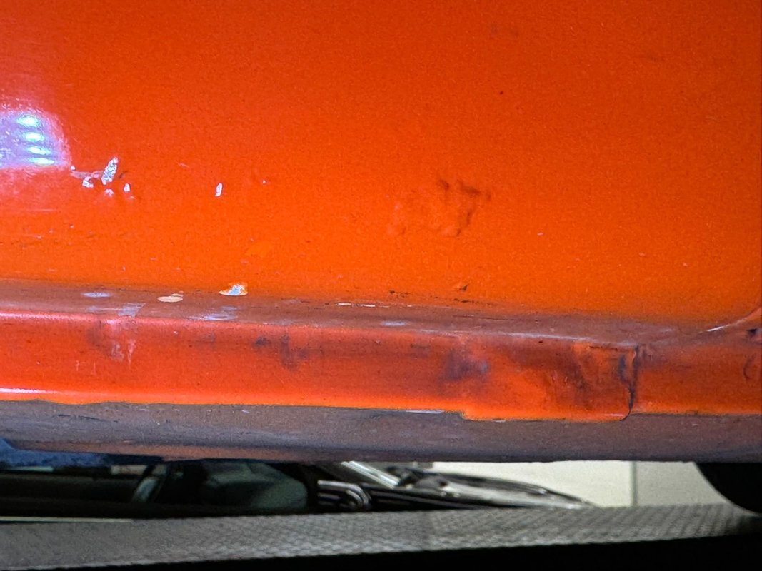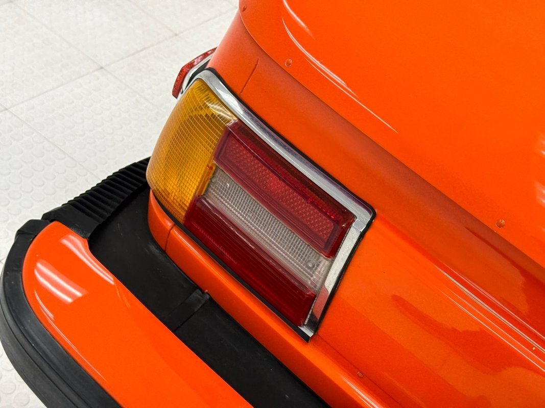 Inca Orange makes a bright appearance on every body panel and uniquely, the bumpers. If the model alone doesn't get attention, the blast of orange paint surely will. Rally lights emerge from the front bumper flaking the kidney grille. The side markers are rounded around the fender corners in a noteworthy design cue. The factory sunroof does not leak per the consignor and the original 13-inch Minilite wheels look fantastic. Tall windows on this little car create a greenhouse effect and aid in visibility for this driving machine. A square back is finished with ANSA dual exhaust tips exiting in the center. A closer look reveals some body filler repair on the rear valance, chipping paint along a bottom edge, flaking rust under some bubbles also on a lower edge, and various other rock chips, touch-ups, and bubbling on or near edge surfaces. We also note filler plugs where the body side molding once resided, but fear not as our consignor is including all the trim and attaching clips.