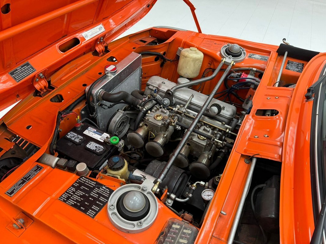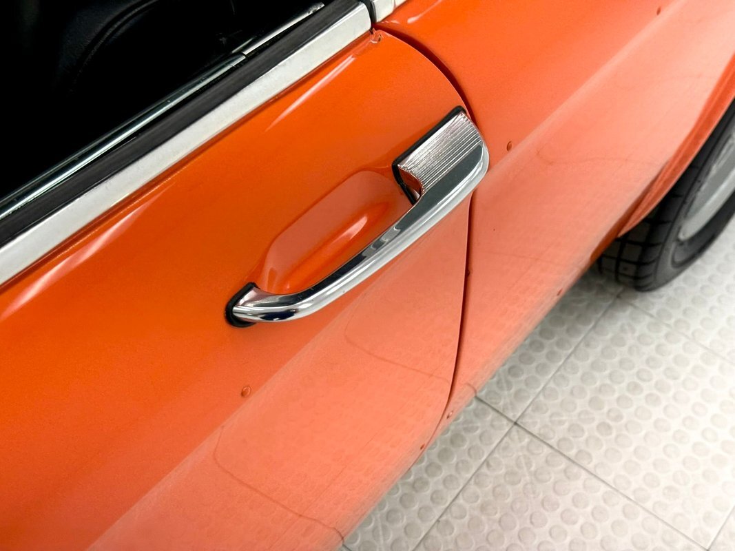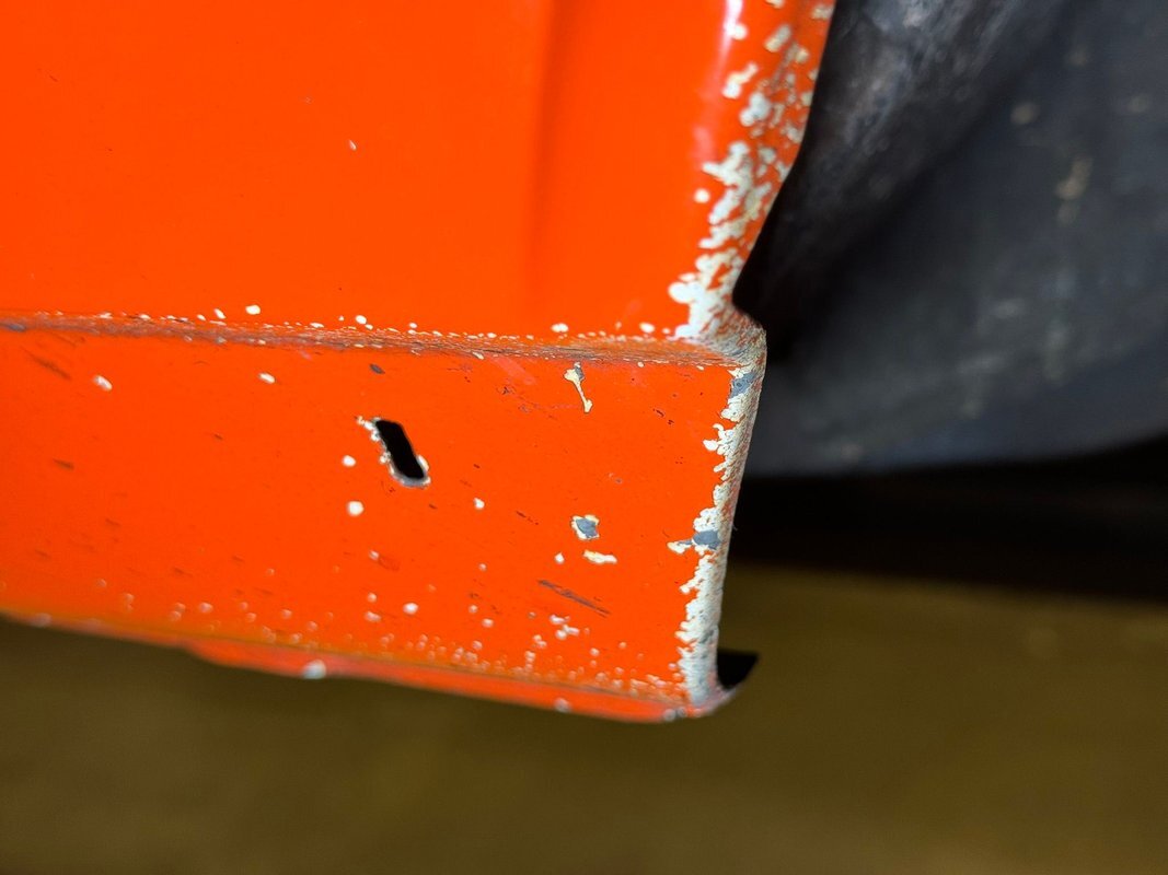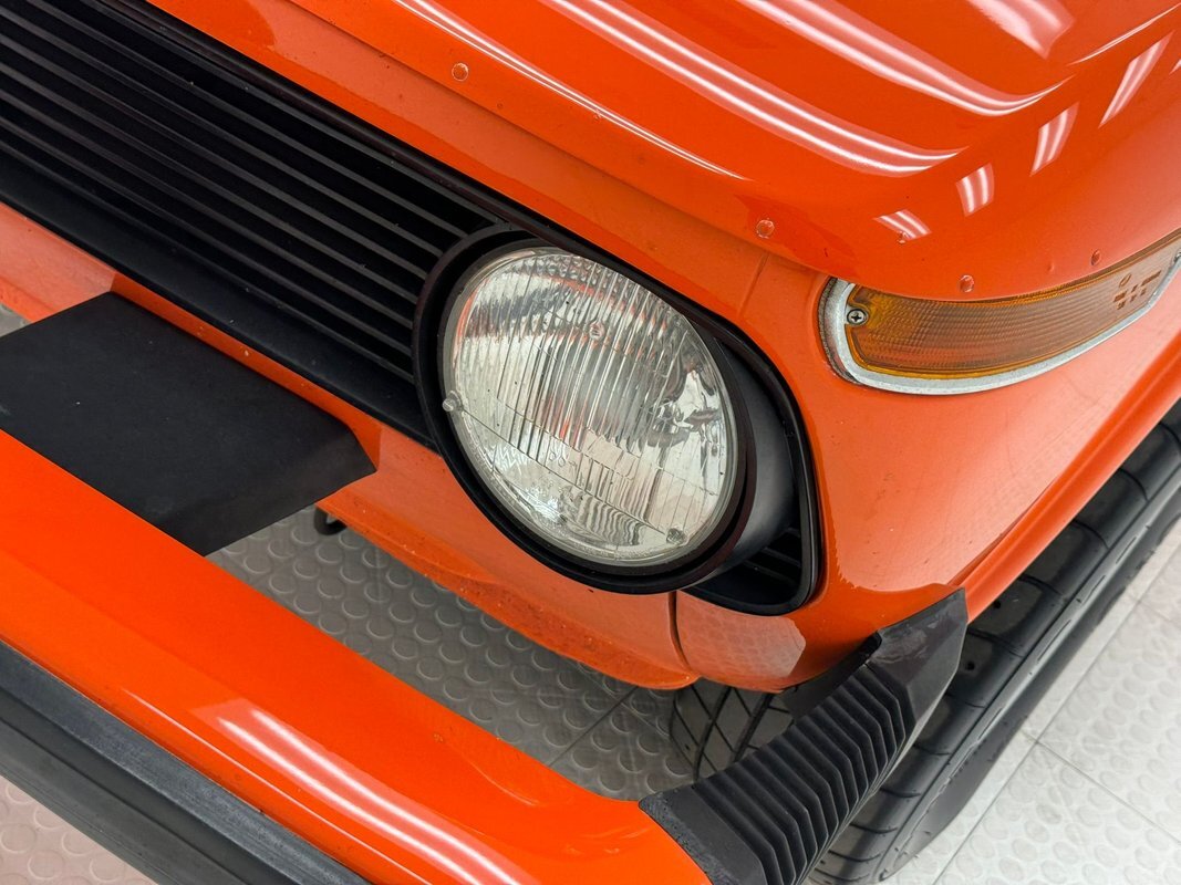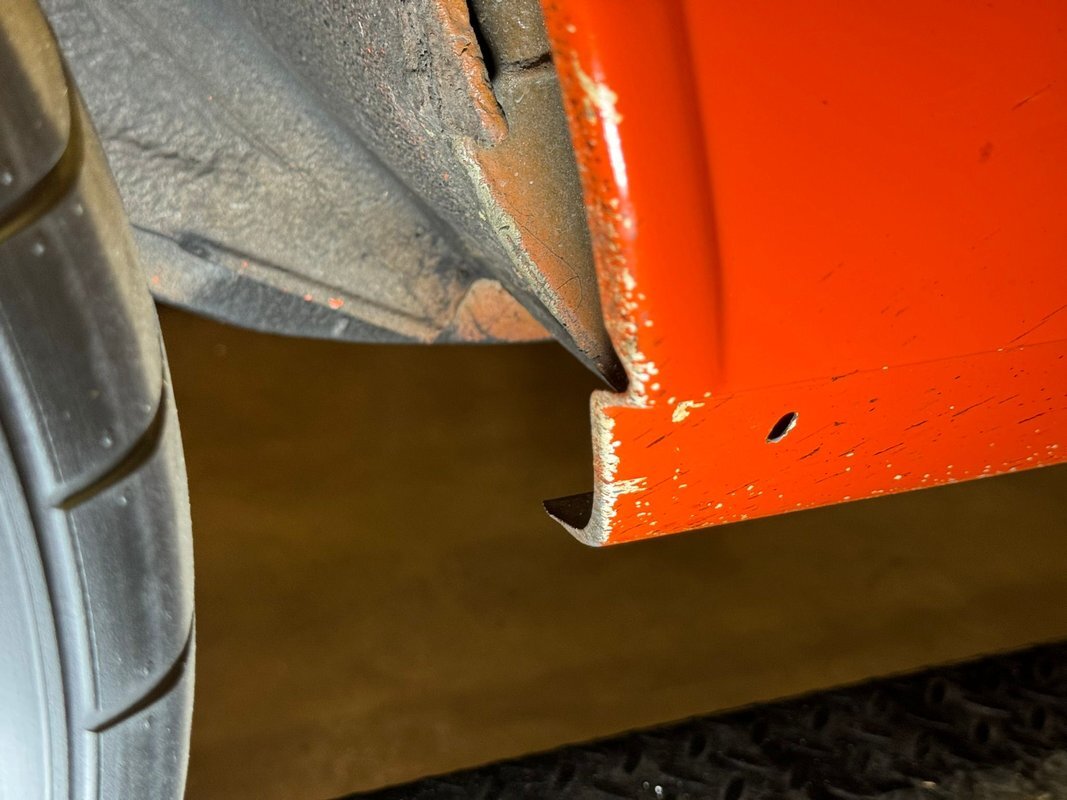 Inca Orange makes a bright appearance on every body panel and uniquely, the bumpers. If the model alone doesn't get attention, the blast of orange paint surely will. Rally lights emerge from the front bumper flaking the kidney grille. The side markers are rounded around the fender corners in a noteworthy design cue. The factory sunroof does not leak per the consignor and the original 13-inch Minilite wheels look fantastic. Tall windows on this little car create a greenhouse effect and aid in visibility for this driving machine. A square back is finished with ANSA dual exhaust tips exiting in the center. A closer look reveals some body filler repair on the rear valance, chipping paint along a bottom edge, flaking rust under some bubbles also on a lower edge, and various other rock chips, touch-ups, and bubbling on or near edge surfaces. We also note filler plugs where the body side molding once resided, but fear not as our consignor is including all the trim and attaching clips.