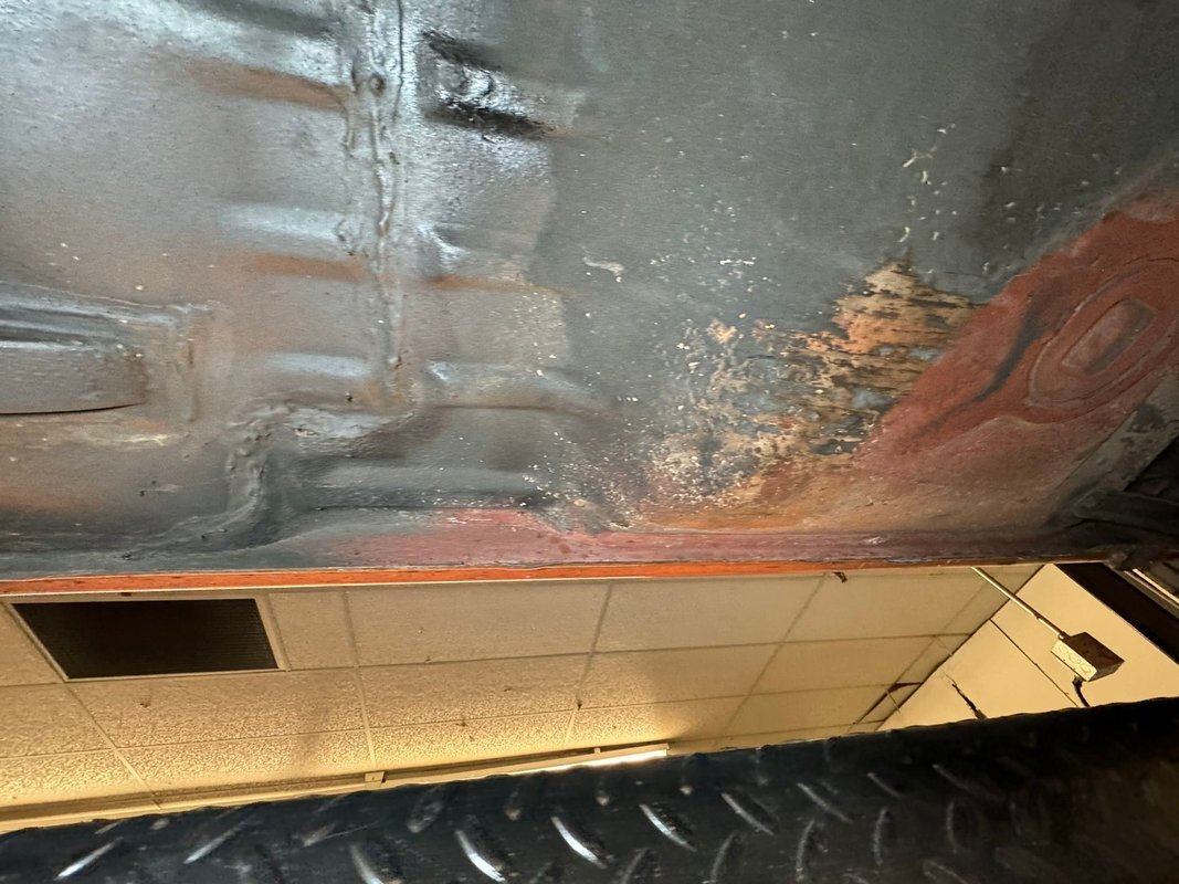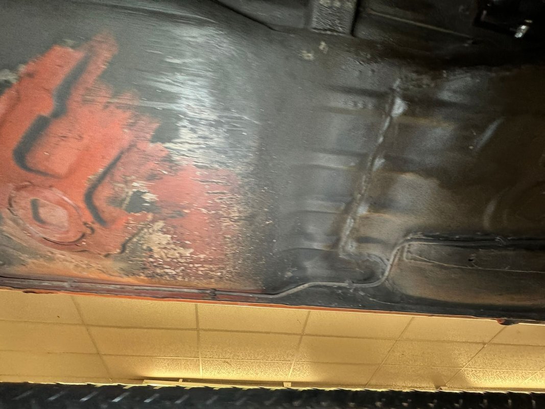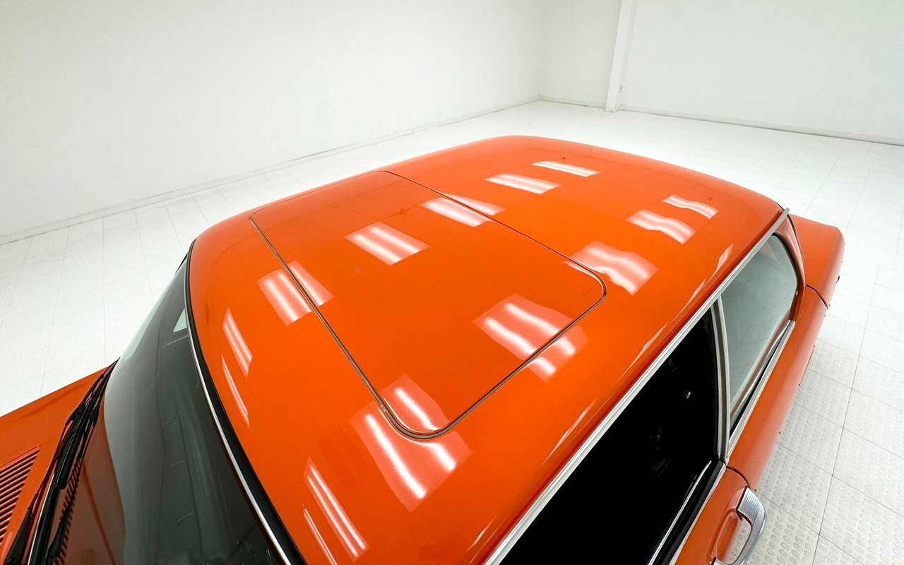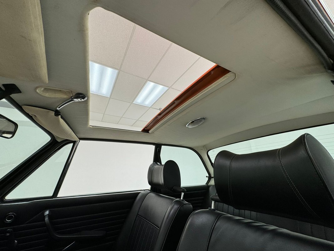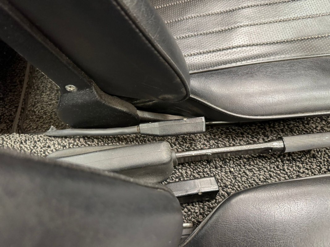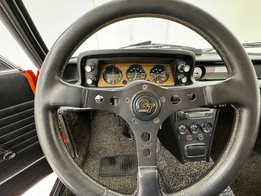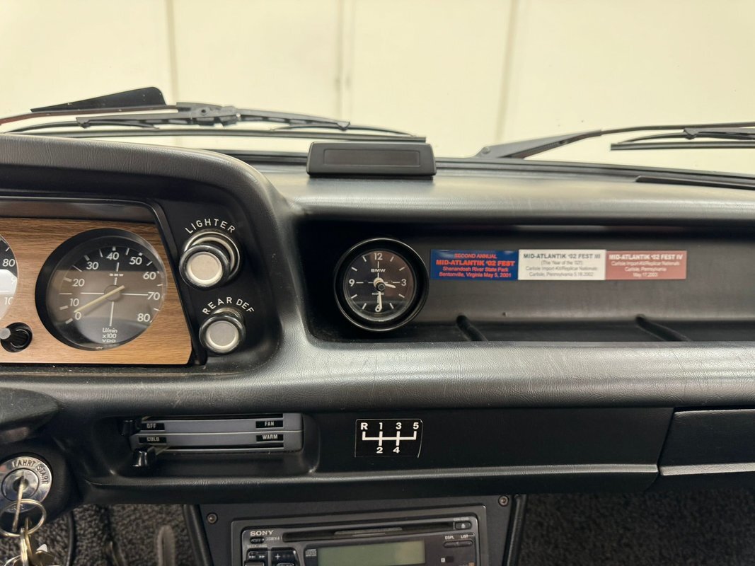 Black vinyl door panels lead to matching front bucket seats and a rear bench, all in excellent condition. A sporty Grant GT steering wheel directs the car while a wood trimmed dash panel has large readable VDO gauges and indicator lights. An analog clock sits center and below it, a bespoke center stack console that holds a Sony AM/FM/CD radio, a trio of VDO gauges, (volts, oil temperature, oil pressure), and an ashtray. The 5-speed shifter is floor mounted with a rubber boot surrounded in two color loop style carpeting in great condition with matching mats on top. The headliner is in good condition and is made of ivory vinyl which helps, along with the big windows, lighten up the interior.