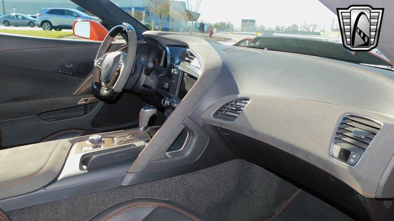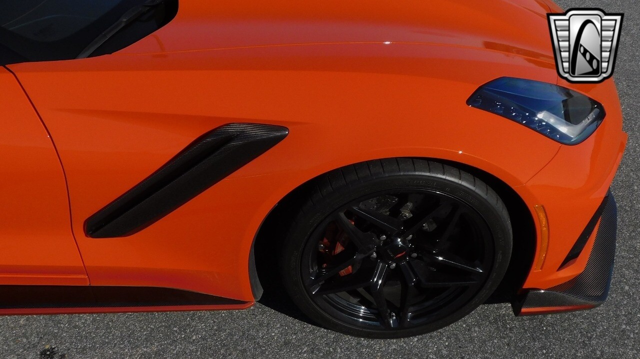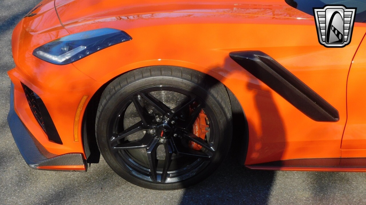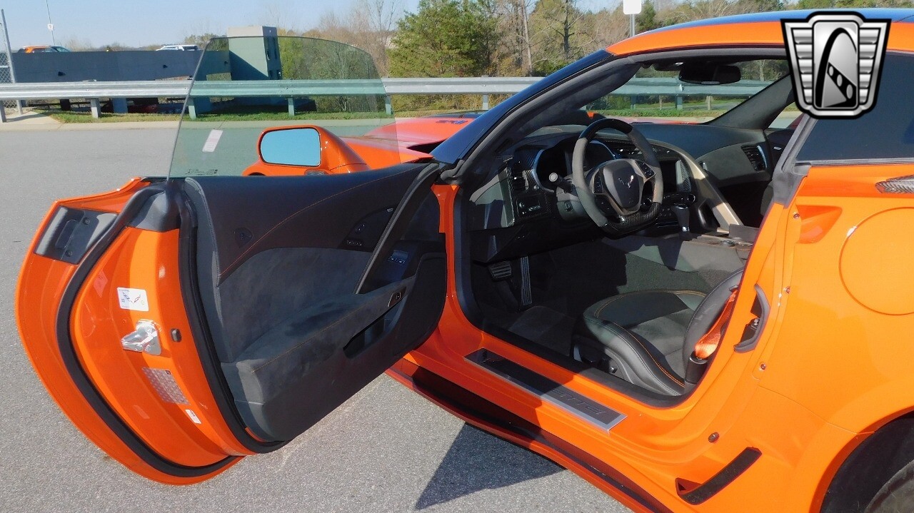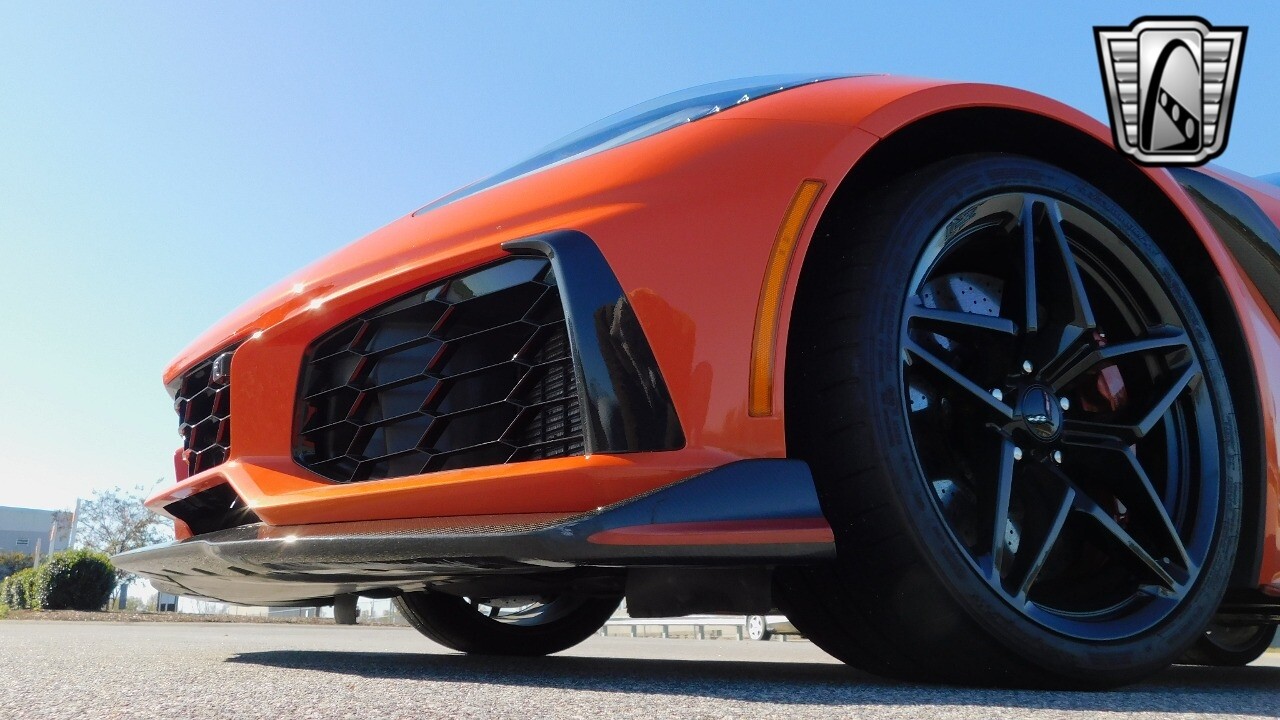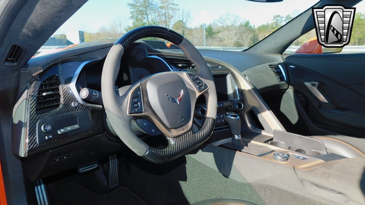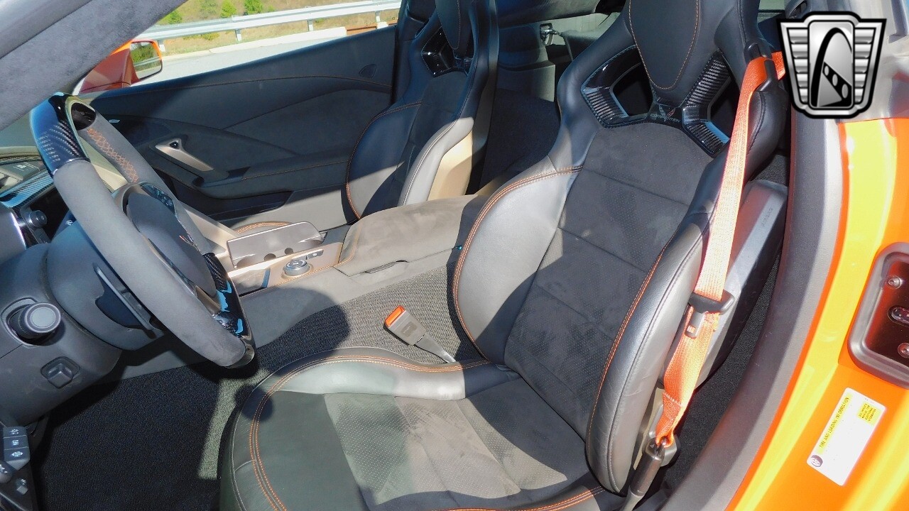 This heart-stopping machine is equipped with the available Sebring Orange Design Package. Contents include Sebring Orange Tintcoat exterior color, orange-painted calipers, ZR1 Carbon Flash-painted aluminum wheels, orange custom leather stitch, orange-painted striped ground effects, Jet Black leather seating surfaces with suede microfiber inserts with orange stitching, Competition Sport bucket seats, carbon fiber, and suede microfiber-wrapped rim, flat-bottom steering wheel, orange safety belts, ZR- logo floor mats with orange accents and bronze-tinted aluminum interior accents.