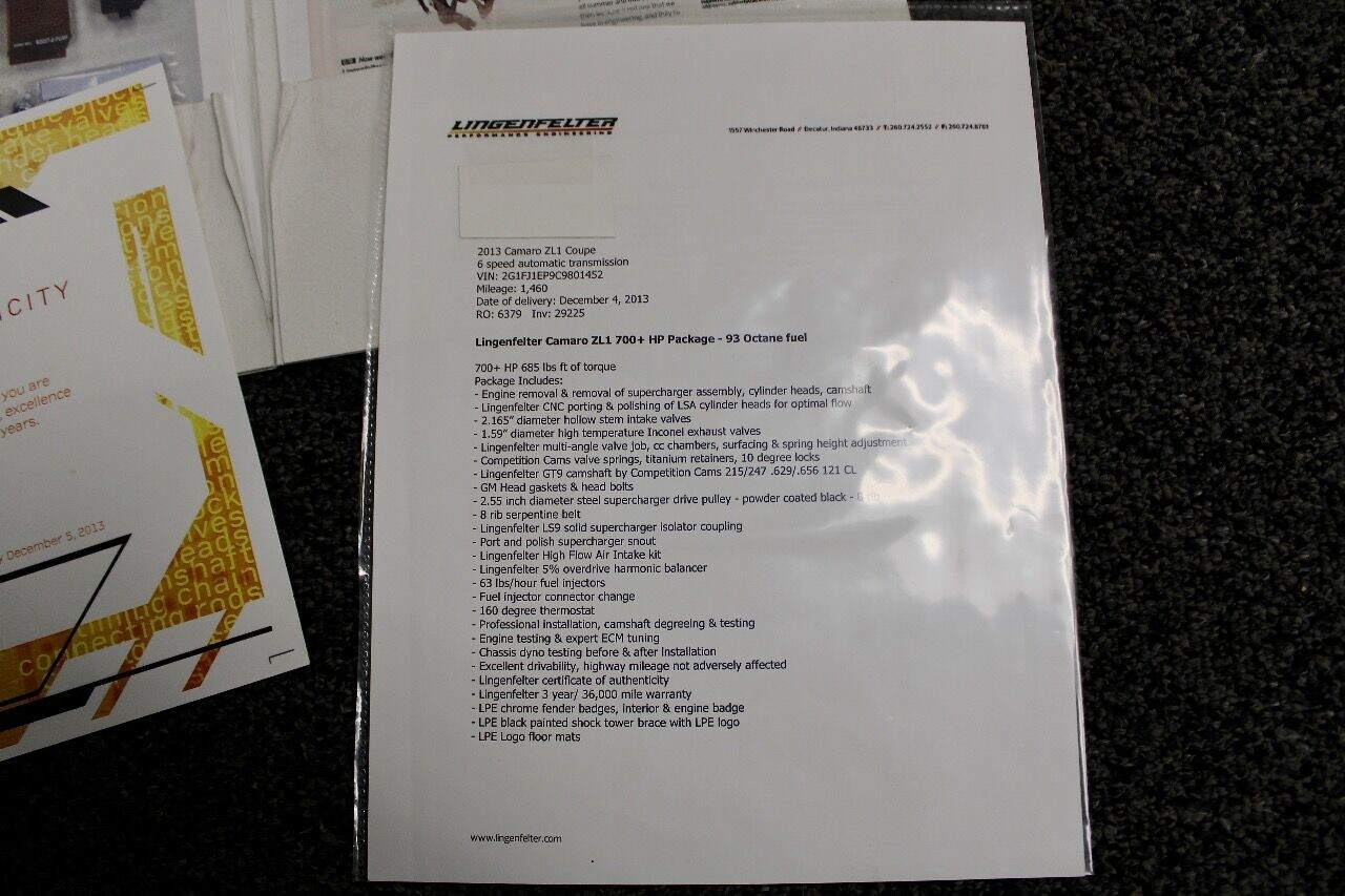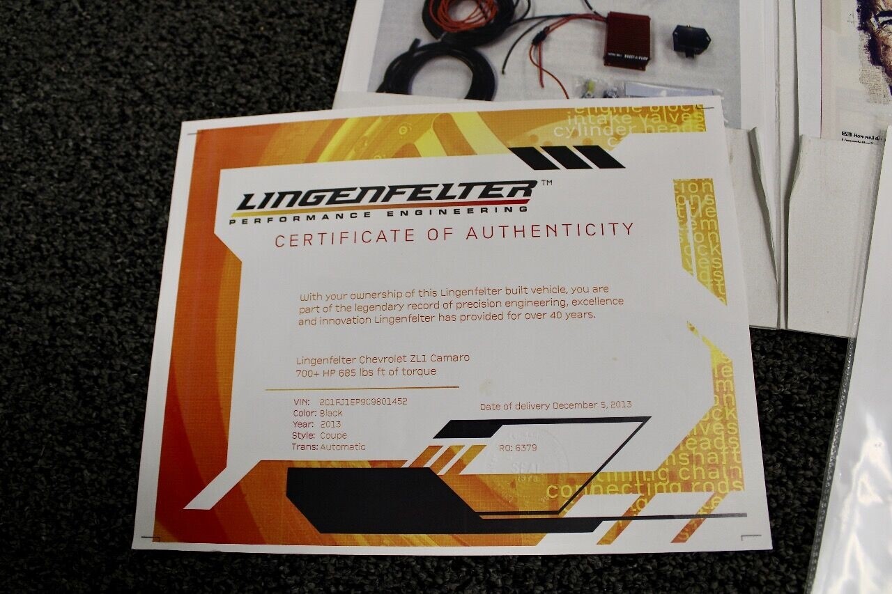 2012 Chevrolet Camaro ZL1 Lingenfelter Edition 700HP+ with only 9500 Miles. Package included Engine removal & removal of supercharger assembly, cylinder heads, camshaft, Lingenfelter CNC porting & polishing of ZL1 LSA cylinder heads for optimal flow, 2.165 diameter hollow stem intake valves, 1.59 diameter high temperature Inconel exhaust valves, Lingenfelter multi-angle valve job, cc chambers, surfacing & spring height adjustment, Lingenfelter dual valve springs, titanium retainers,10 degree locks, Lingenfelter GT9 camshaft by Competition Cams 215/247 .629/.656 121 CL, GM Head gaskets & head bolts, Lingenfelter 2.55 inch diameter 10 bolt supercharger drive pulley, Lingenfelter 10 bolt supercharger pulley hub, Gates HD 8 rib serpentine belt, Lingenfelter LSA solid supercharger isolator coupling, Port and polish supercharger snout, Lingenfelter High Flow air intake kit, Lingenfelter 10% overdrive harmonic balancer, FIC 660cc 72 lbs hour fuel injectors, Lingenfelter 160 degree thermostat, Professional installation, camshaft degreeing & testing, Engine testing & expert ECM tuning, Chassis dyno testing before & after installation, Lingenfelter certificate of authenticity. Black on Black interior, Boston Acoustics Sound System, Rear Vision Package with Camera and Parking Sensors. The car is in absolute immaculate condition.