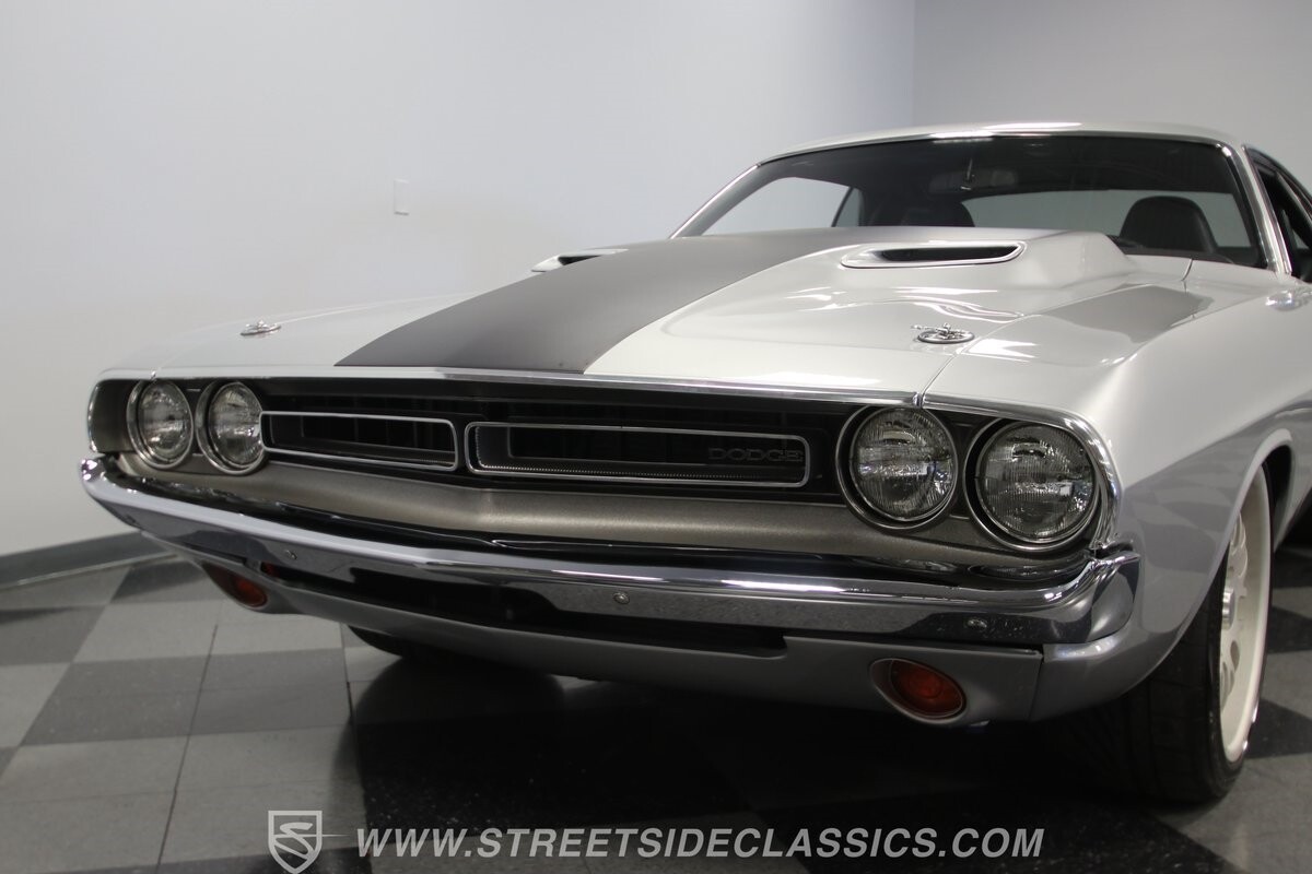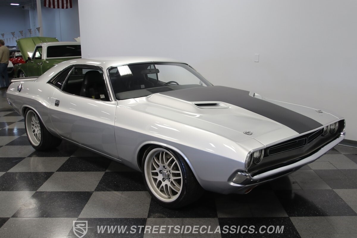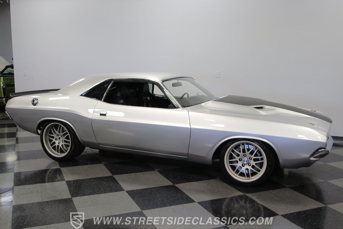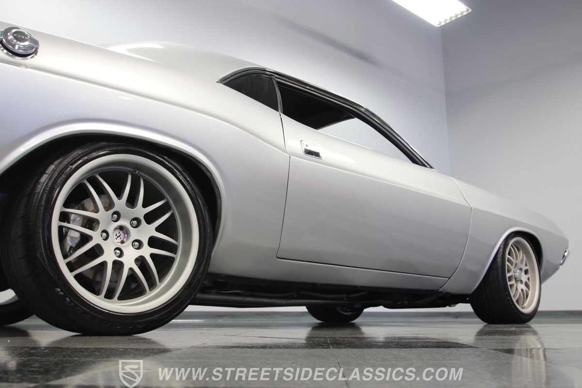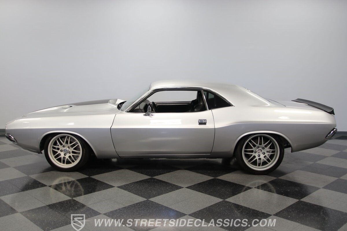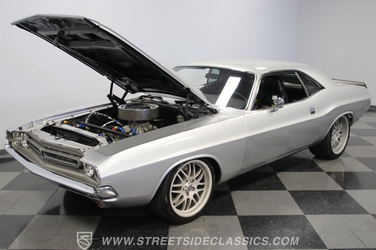 The story we're told is that this has only about 1k miles on it since it's full restoration. Just looking down the bright, shiny flanks of this Challenger, you can see that the money was spent wisely. Panel fit and body gaps show an attention to quality, which makes for the best canvas around. So the silver paint looks like it was applied over truly precious metal. The shine gives extra definition to the full-length body crease, and so it gives this coupe a true look that's equal parts fast and class. It's nicely detailed with the black hood stripe coordinating with the rear spoiler. And Mopar fans will pick up on subtle details, like how this one has the front end of the '71 car so that the chrome bumper hugs the form better. Other upgrades are more obvious and hint at the big upgrades in power. So those modern alloys allow you to fit modern sport tires, and the larger power bulge in the hood let's everyone know there's a beast within.