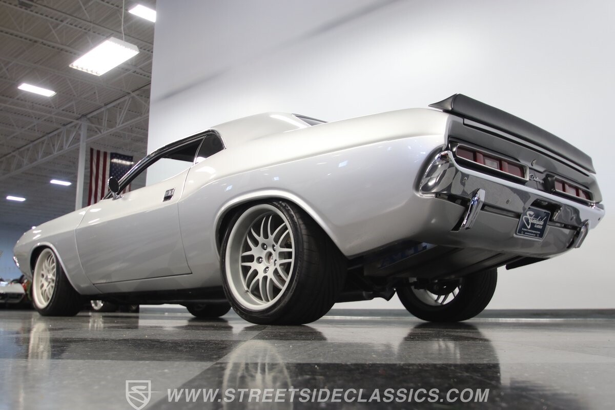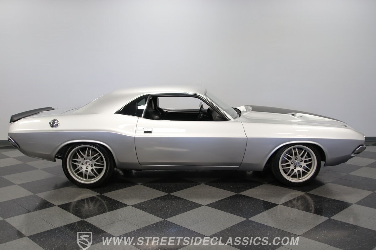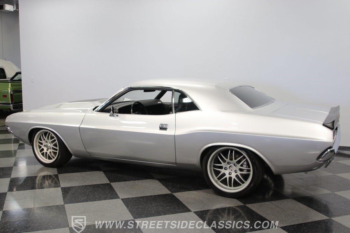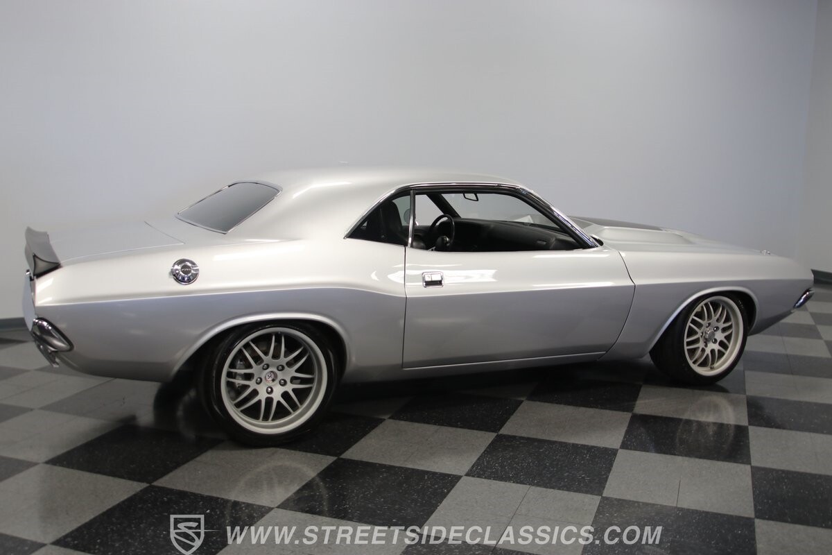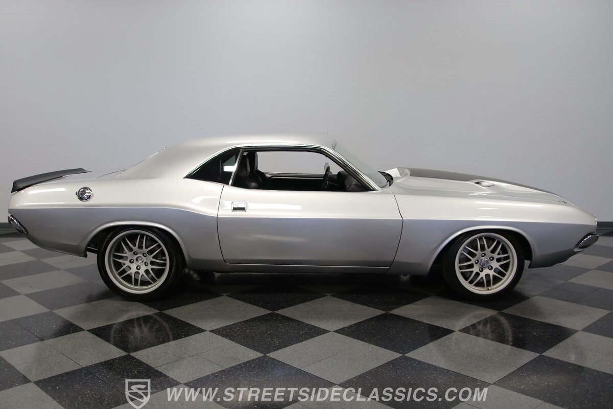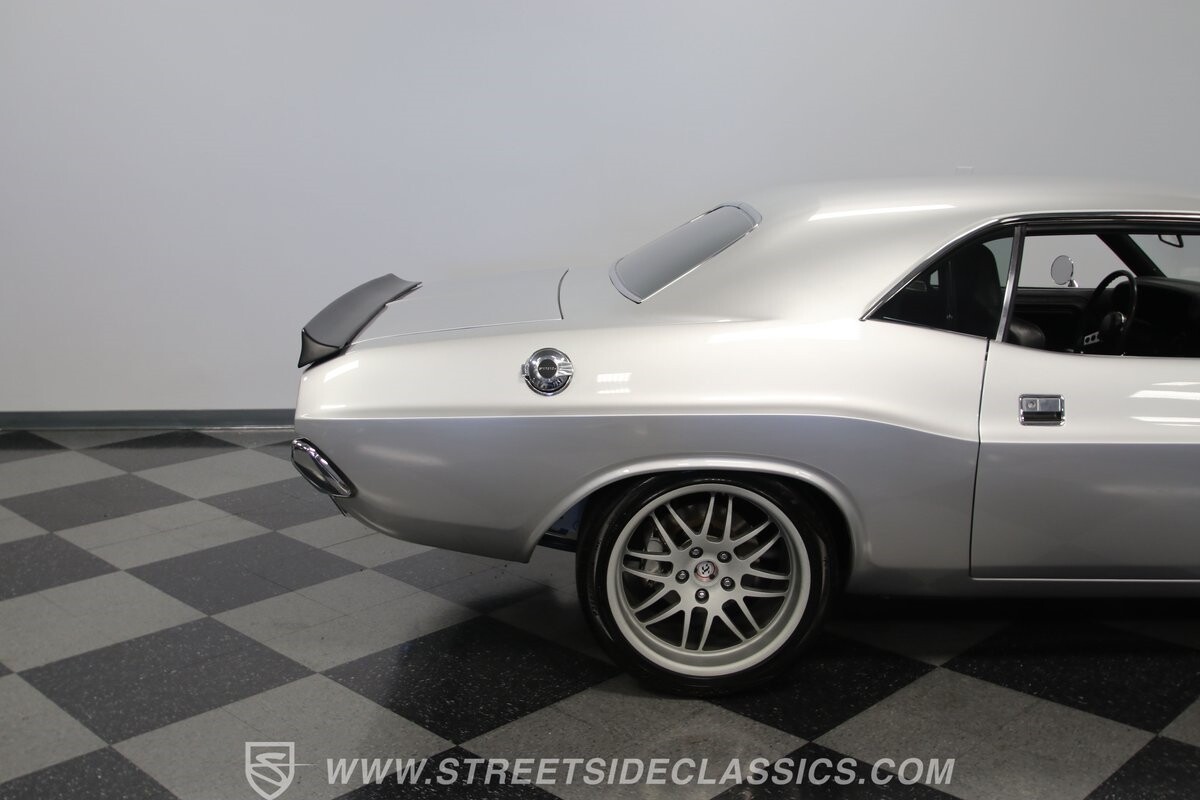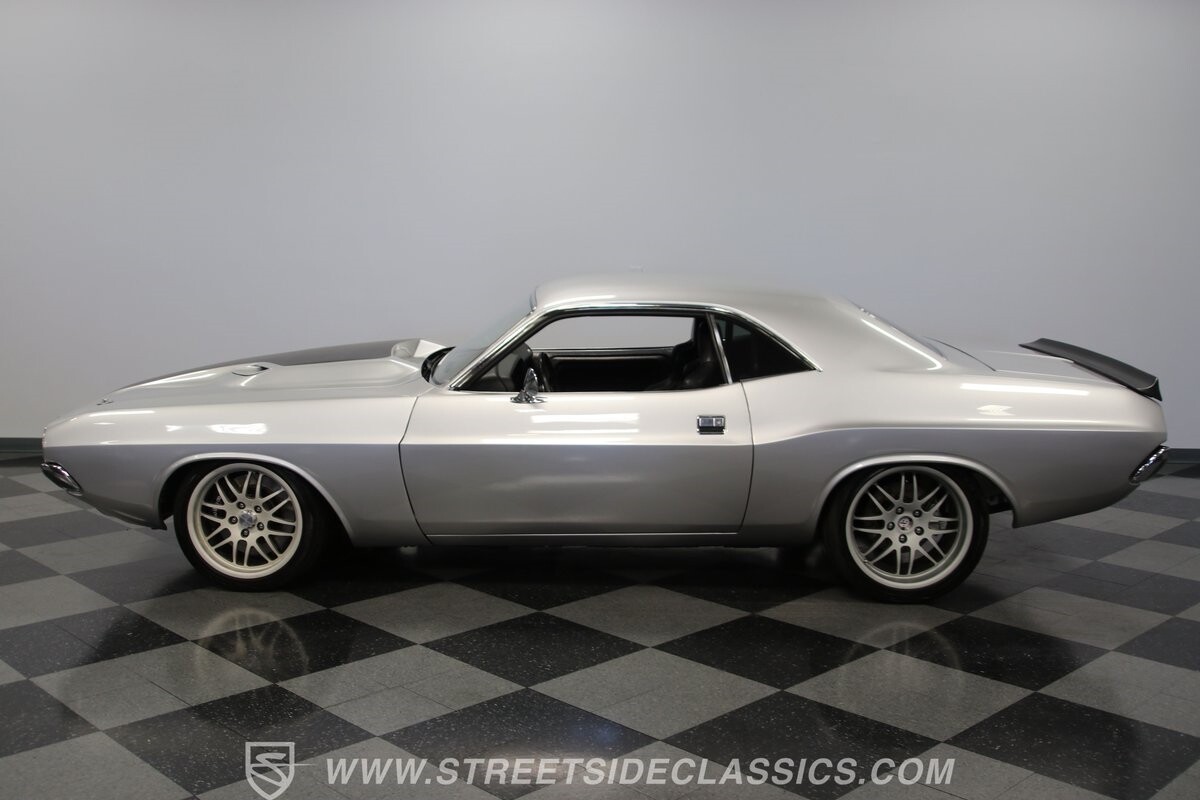 The story we're told is that this has only about 1k miles on it since it's full restoration. Just looking down the bright, shiny flanks of this Challenger, you can see that the money was spent wisely. Panel fit and body gaps show an attention to quality, which makes for the best canvas around. So the silver paint looks like it was applied over truly precious metal. The shine gives extra definition to the full-length body crease, and so it gives this coupe a true look that's equal parts fast and class. It's nicely detailed with the black hood stripe coordinating with the rear spoiler. And Mopar fans will pick up on subtle details, like how this one has the front end of the '71 car so that the chrome bumper hugs the form better. Other upgrades are more obvious and hint at the big upgrades in power. So those modern alloys allow you to fit modern sport tires, and the larger power bulge in the hood let's everyone know there's a beast within.