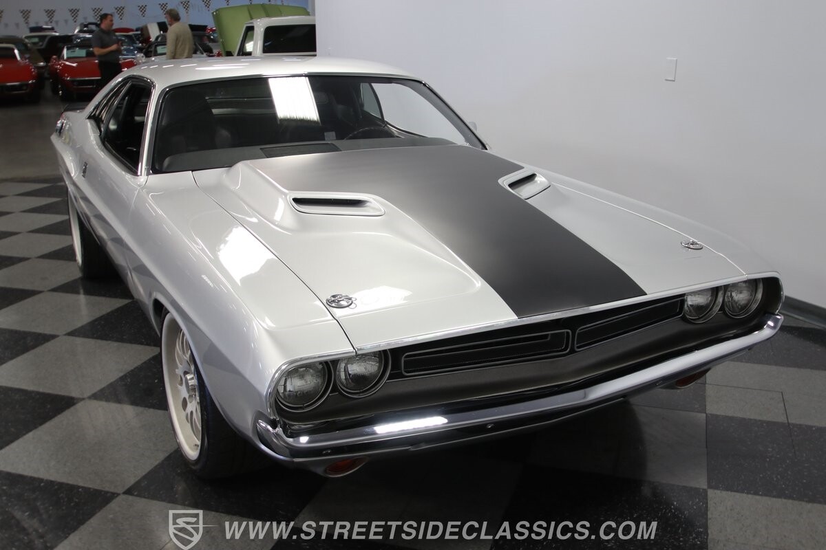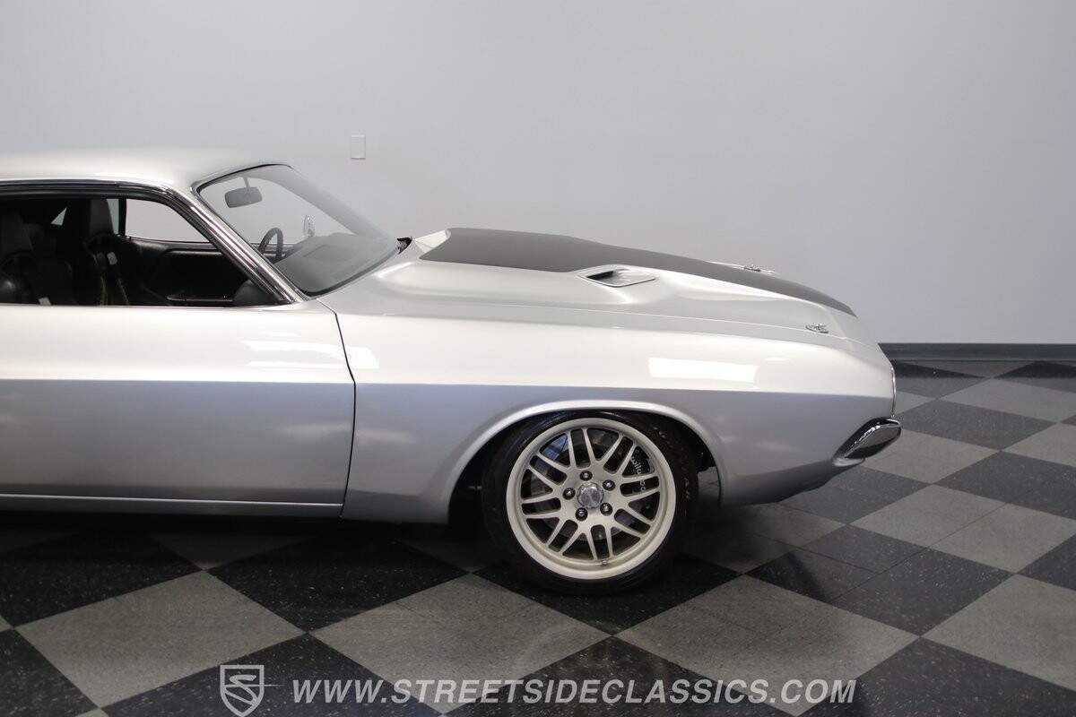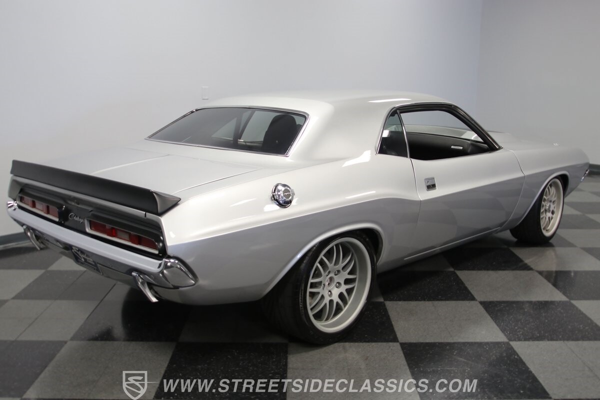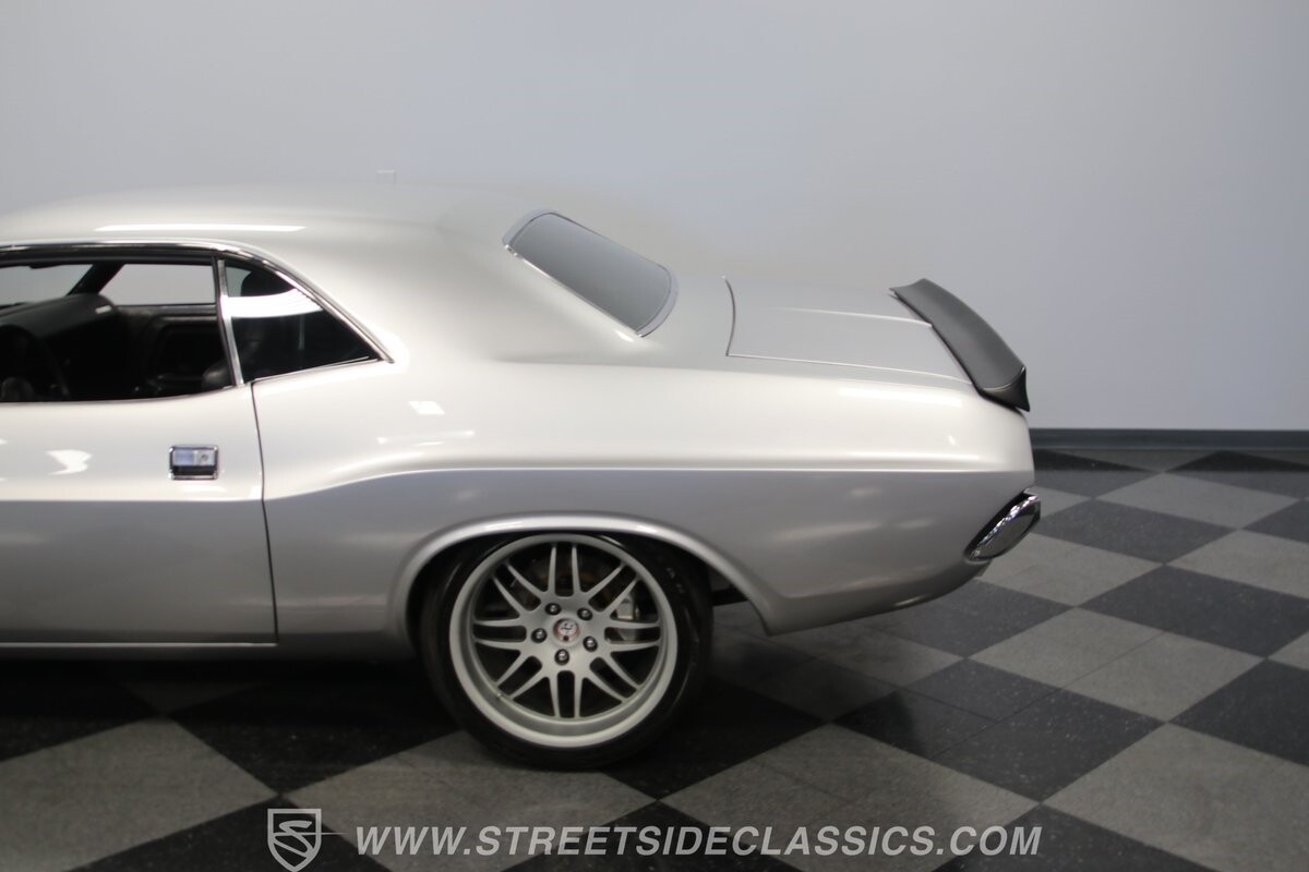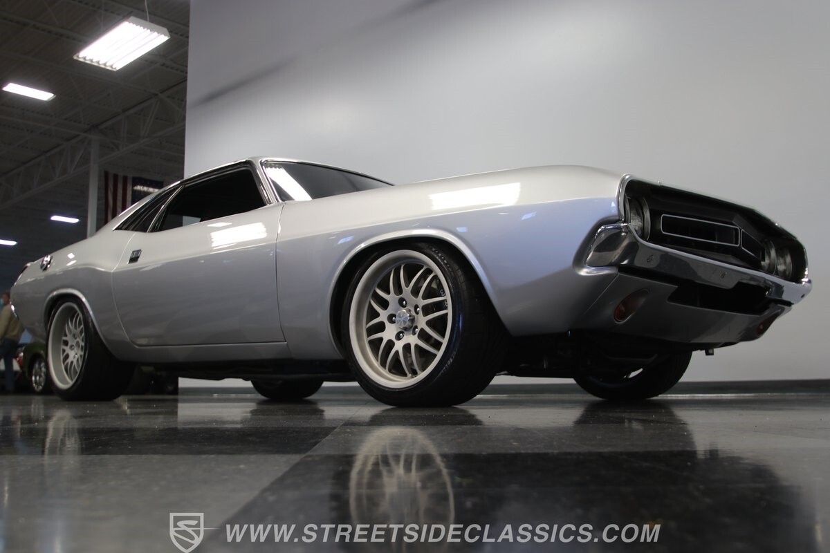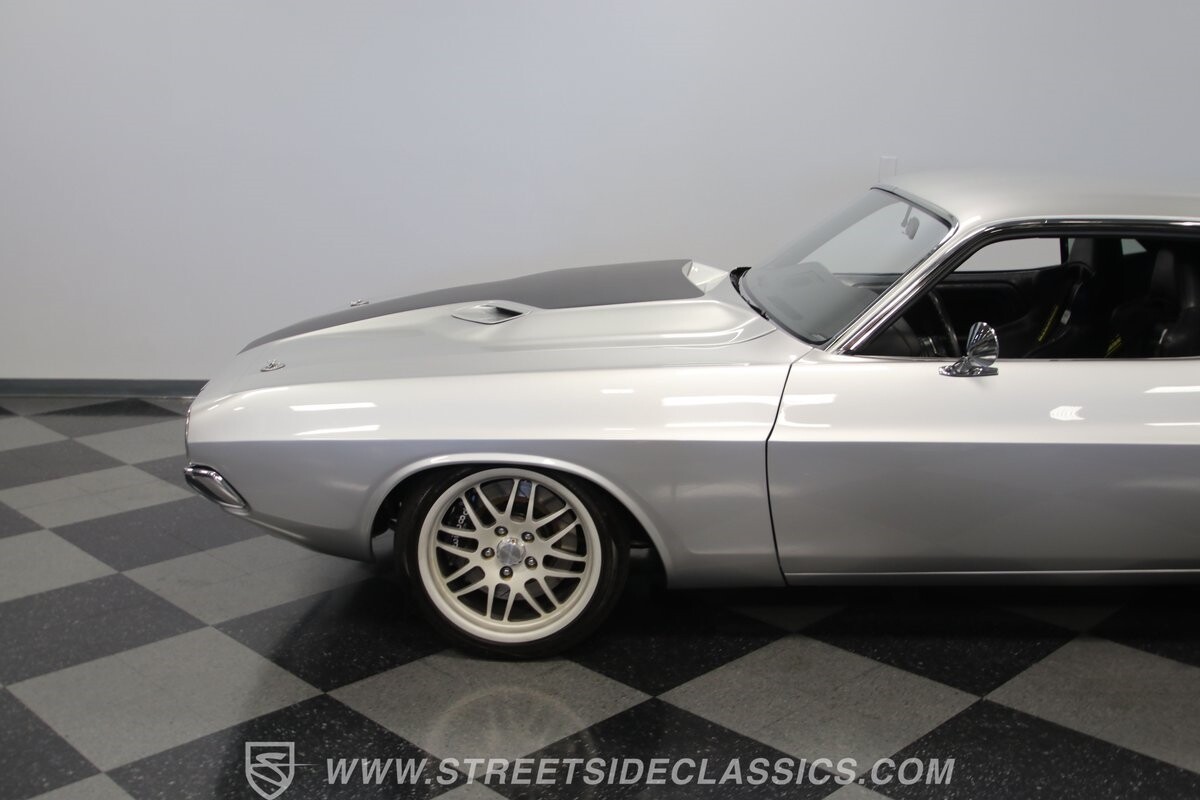 The story we're told is that this has only about 1k miles on it since it's full restoration. Just looking down the bright, shiny flanks of this Challenger, you can see that the money was spent wisely. Panel fit and body gaps show an attention to quality, which makes for the best canvas around. So the silver paint looks like it was applied over truly precious metal. The shine gives extra definition to the full-length body crease, and so it gives this coupe a true look that's equal parts fast and class. It's nicely detailed with the black hood stripe coordinating with the rear spoiler. And Mopar fans will pick up on subtle details, like how this one has the front end of the '71 car so that the chrome bumper hugs the form better. Other upgrades are more obvious and hint at the big upgrades in power. So those modern alloys allow you to fit modern sport tires, and the larger power bulge in the hood let's everyone know there's a beast within.