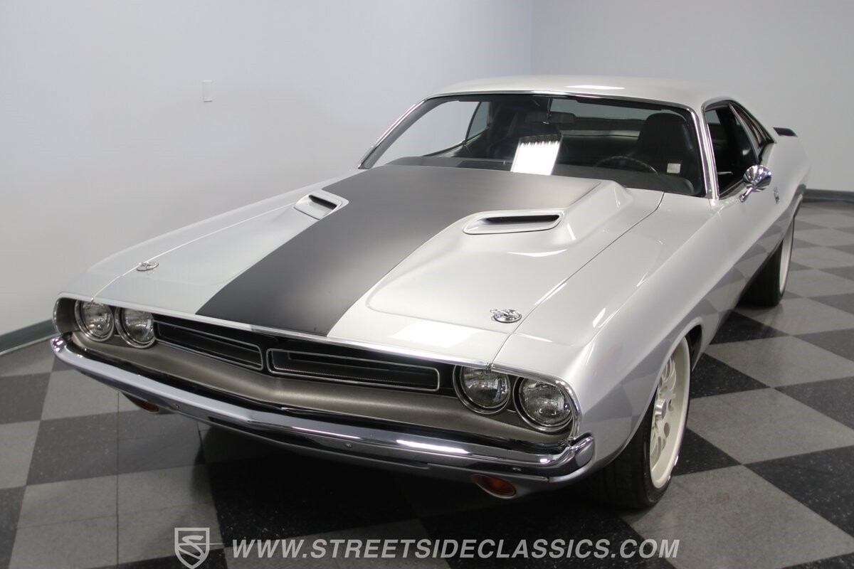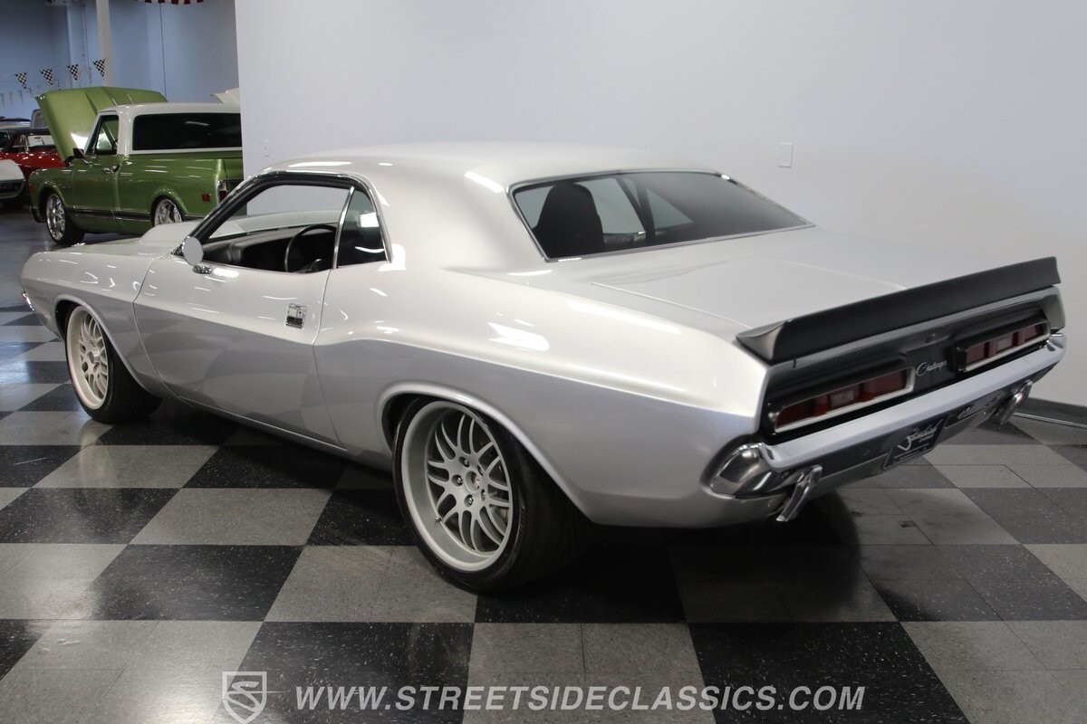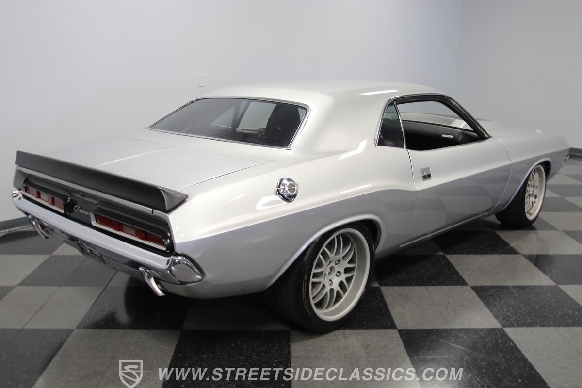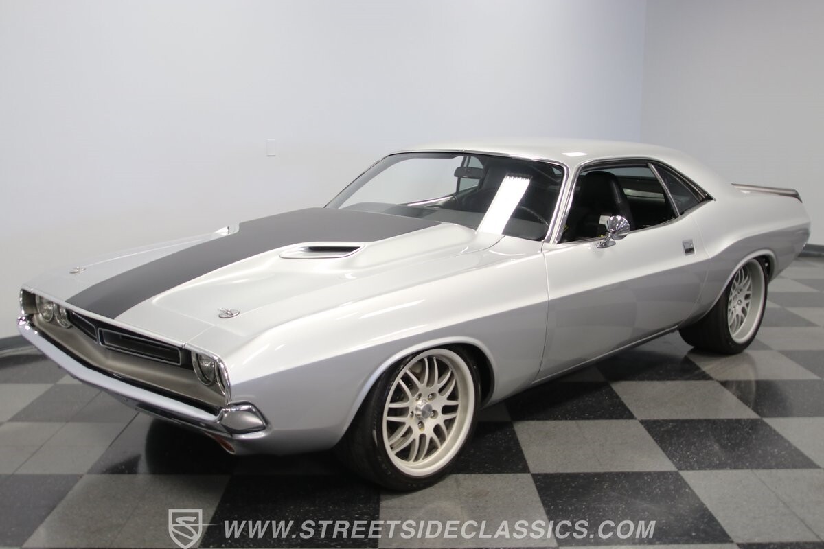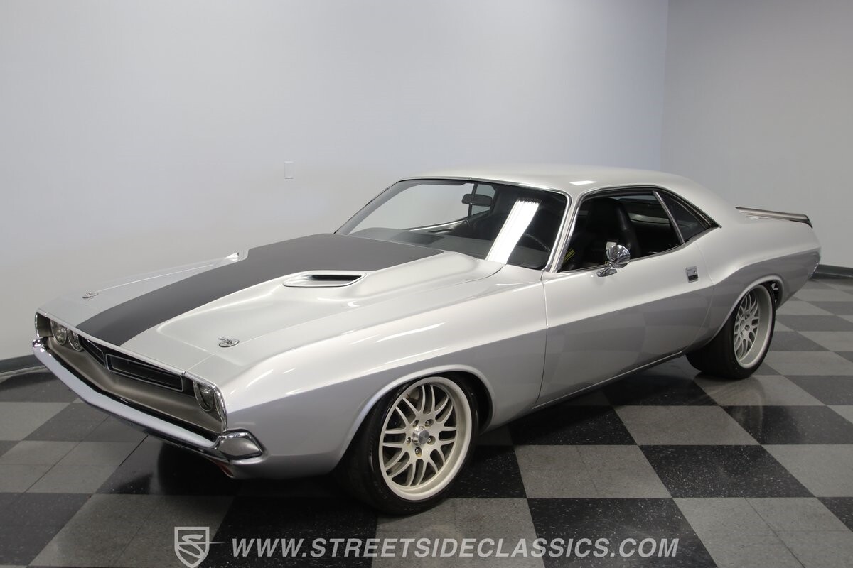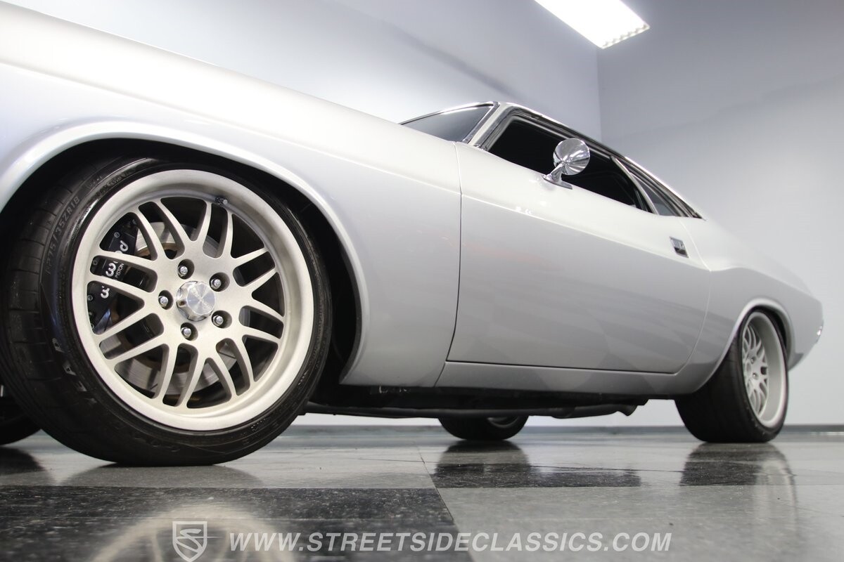 The story we're told is that this has only about 1k miles on it since it's full restoration. Just looking down the bright, shiny flanks of this Challenger, you can see that the money was spent wisely. Panel fit and body gaps show an attention to quality, which makes for the best canvas around. So the silver paint looks like it was applied over truly precious metal. The shine gives extra definition to the full-length body crease, and so it gives this coupe a true look that's equal parts fast and class. It's nicely detailed with the black hood stripe coordinating with the rear spoiler. And Mopar fans will pick up on subtle details, like how this one has the front end of the '71 car so that the chrome bumper hugs the form better. Other upgrades are more obvious and hint at the big upgrades in power. So those modern alloys allow you to fit modern sport tires, and the larger power bulge in the hood let's everyone know there's a beast within.