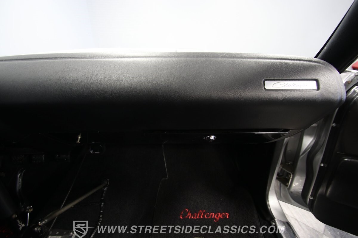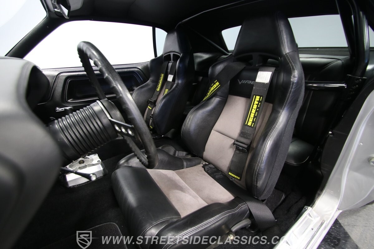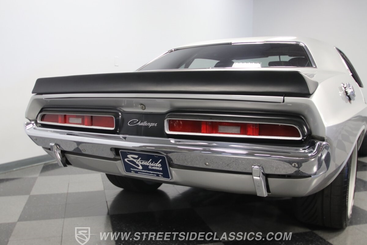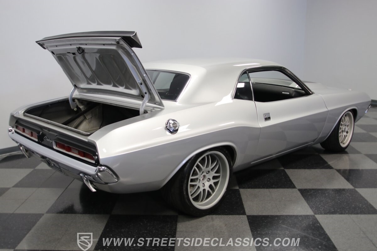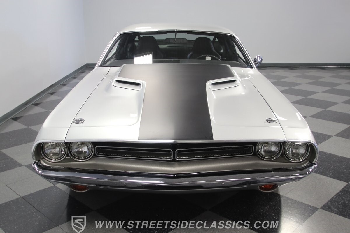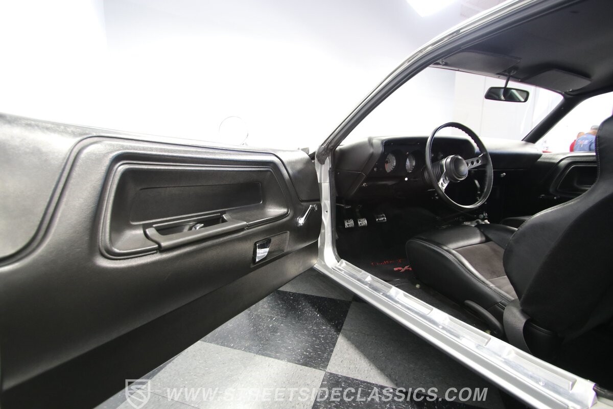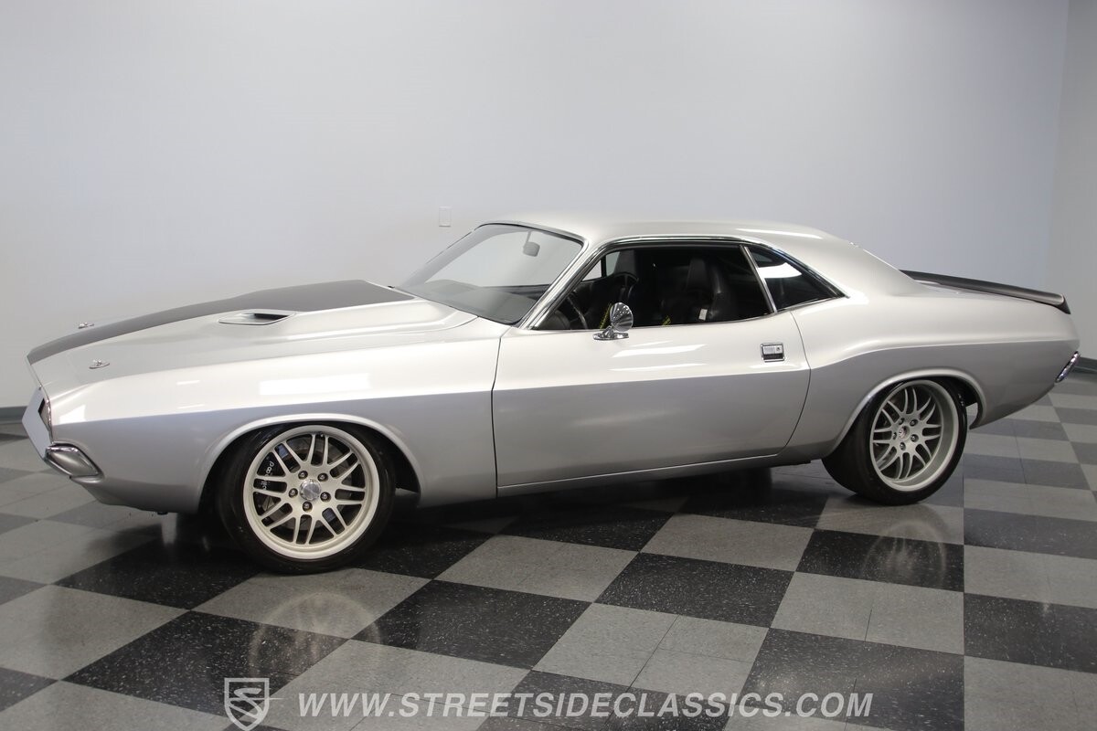 The story we're told is that this has only about 1k miles on it since it's full restoration. Just looking down the bright, shiny flanks of this Challenger, you can see that the money was spent wisely. Panel fit and body gaps show an attention to quality, which makes for the best canvas around. So the silver paint looks like it was applied over truly precious metal. The shine gives extra definition to the full-length body crease, and so it gives this coupe a true look that's equal parts fast and class. It's nicely detailed with the black hood stripe coordinating with the rear spoiler. And Mopar fans will pick up on subtle details, like how this one has the front end of the '71 car so that the chrome bumper hugs the form better. Other upgrades are more obvious and hint at the big upgrades in power. So those modern alloys allow you to fit modern sport tires, and the larger power bulge in the hood let's everyone know there's a beast within.