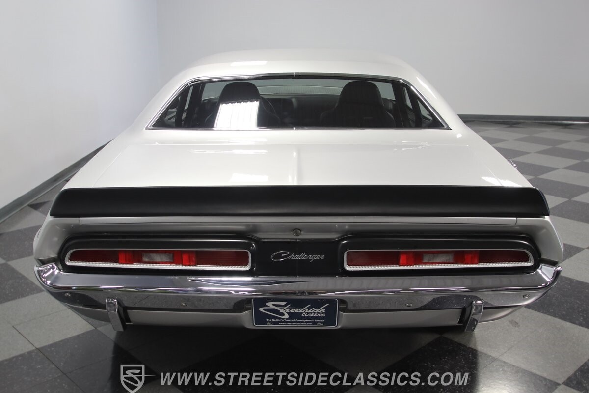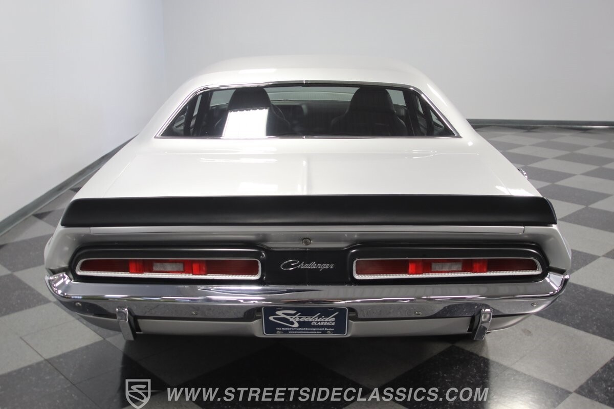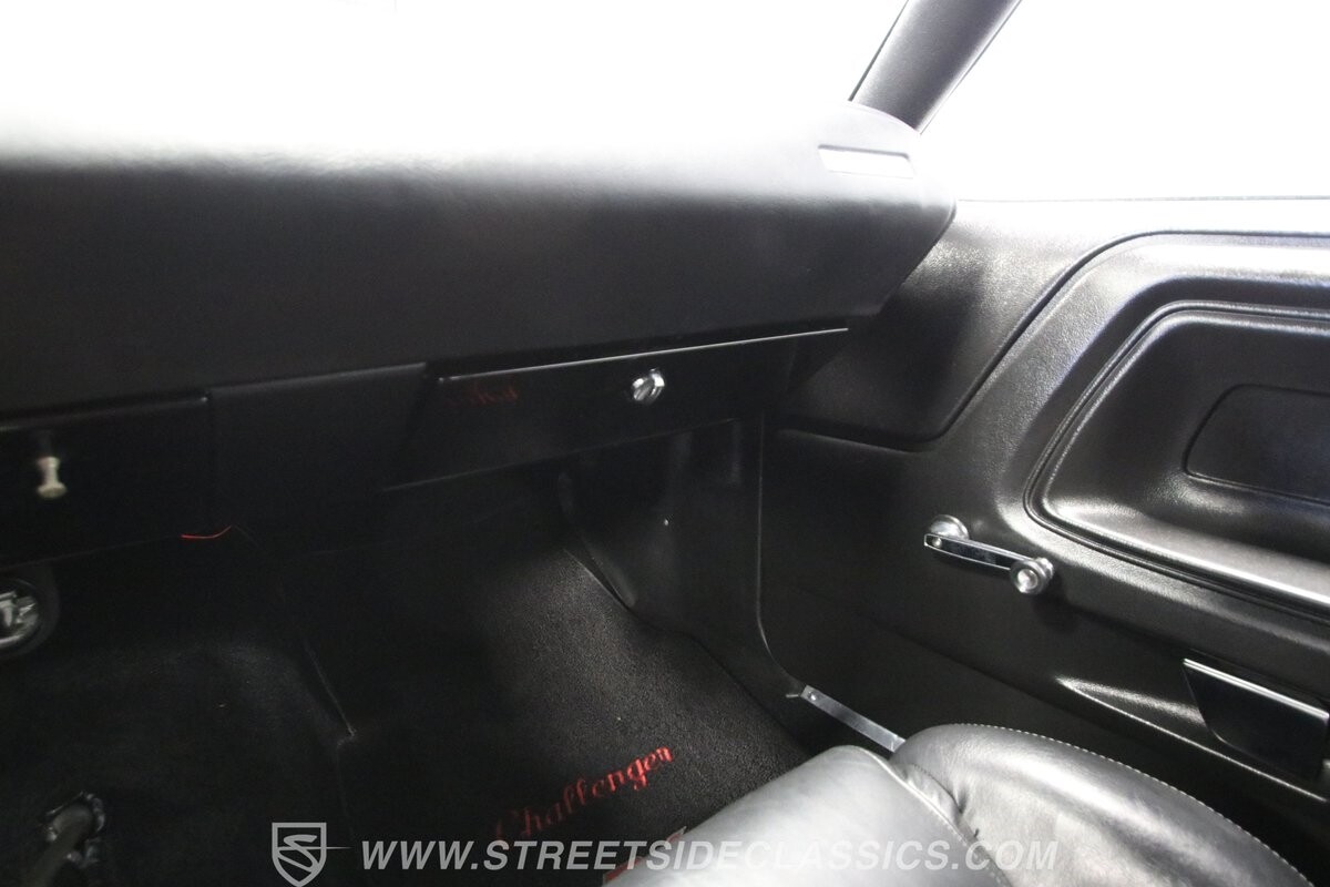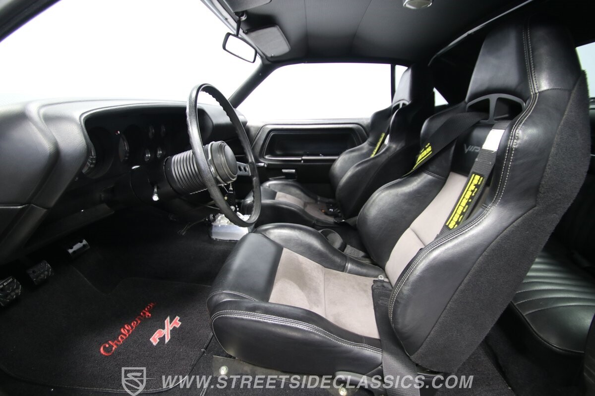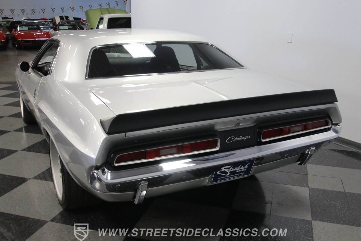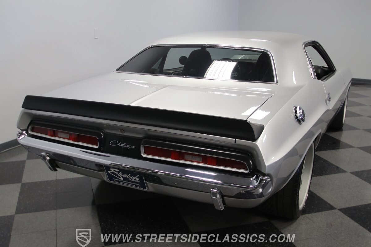 The story we're told is that this has only about 1k miles on it since it's full restoration. Just looking down the bright, shiny flanks of this Challenger, you can see that the money was spent wisely. Panel fit and body gaps show an attention to quality, which makes for the best canvas around. So the silver paint looks like it was applied over truly precious metal. The shine gives extra definition to the full-length body crease, and so it gives this coupe a true look that's equal parts fast and class. It's nicely detailed with the black hood stripe coordinating with the rear spoiler. And Mopar fans will pick up on subtle details, like how this one has the front end of the '71 car so that the chrome bumper hugs the form better. Other upgrades are more obvious and hint at the big upgrades in power. So those modern alloys allow you to fit modern sport tires, and the larger power bulge in the hood let's everyone know there's a beast within.