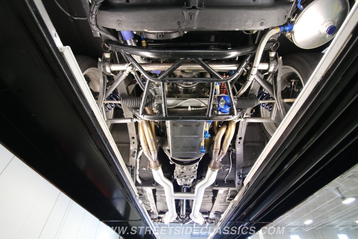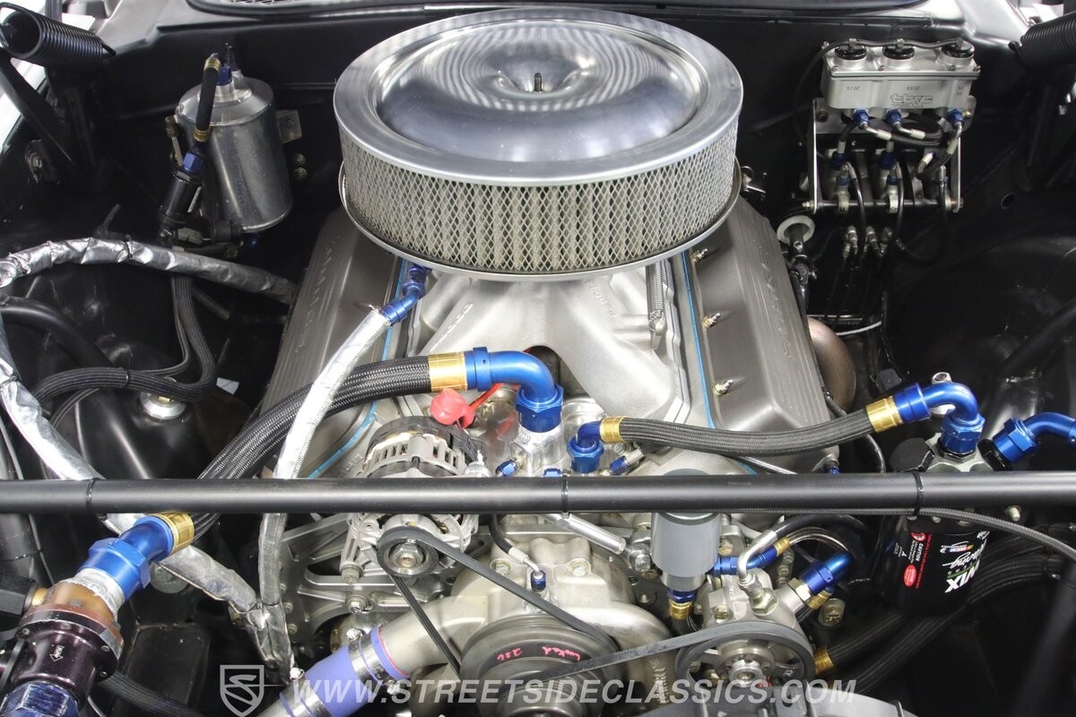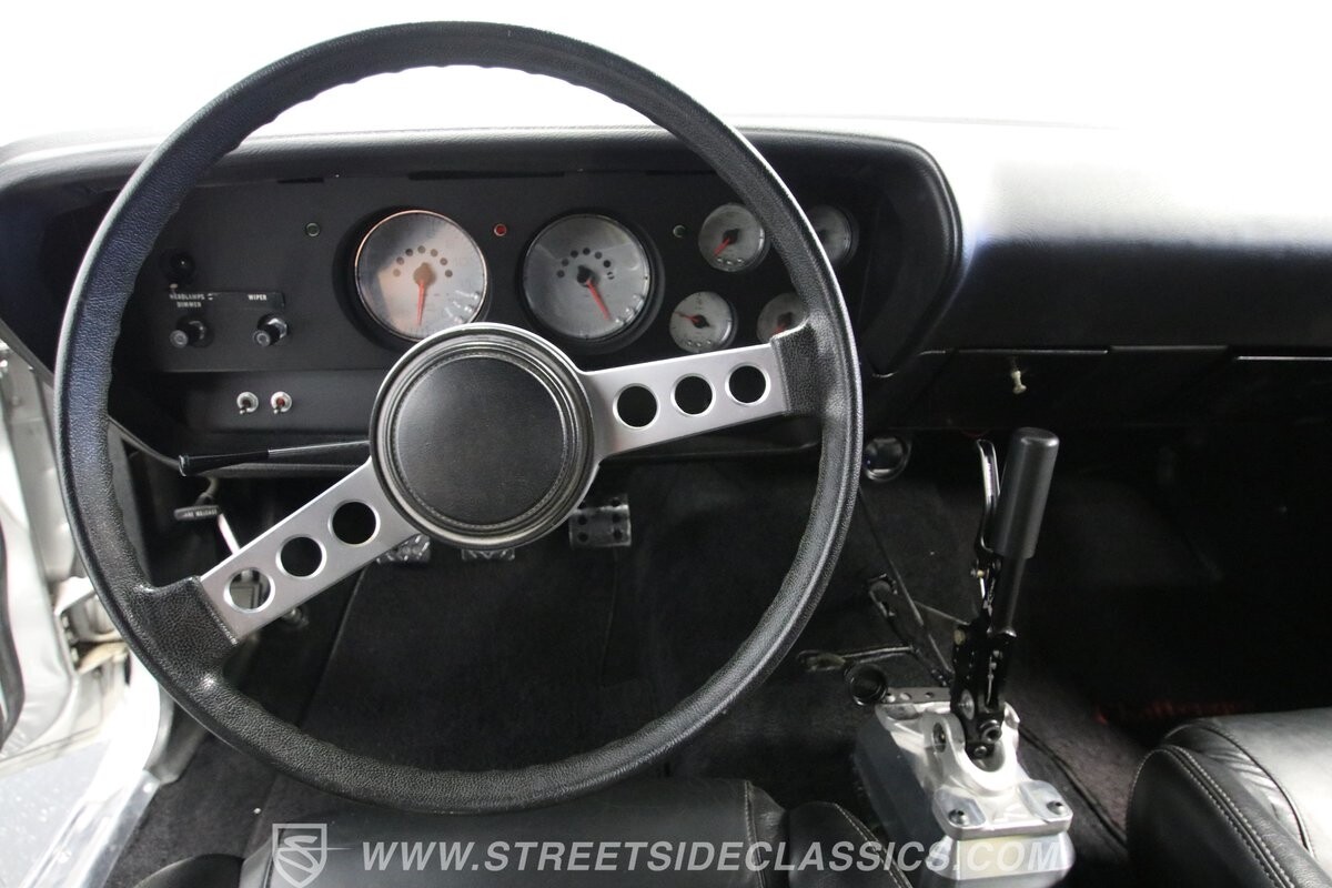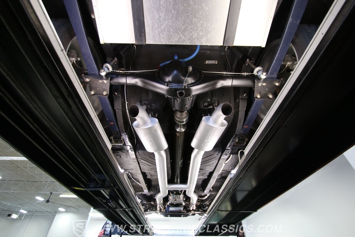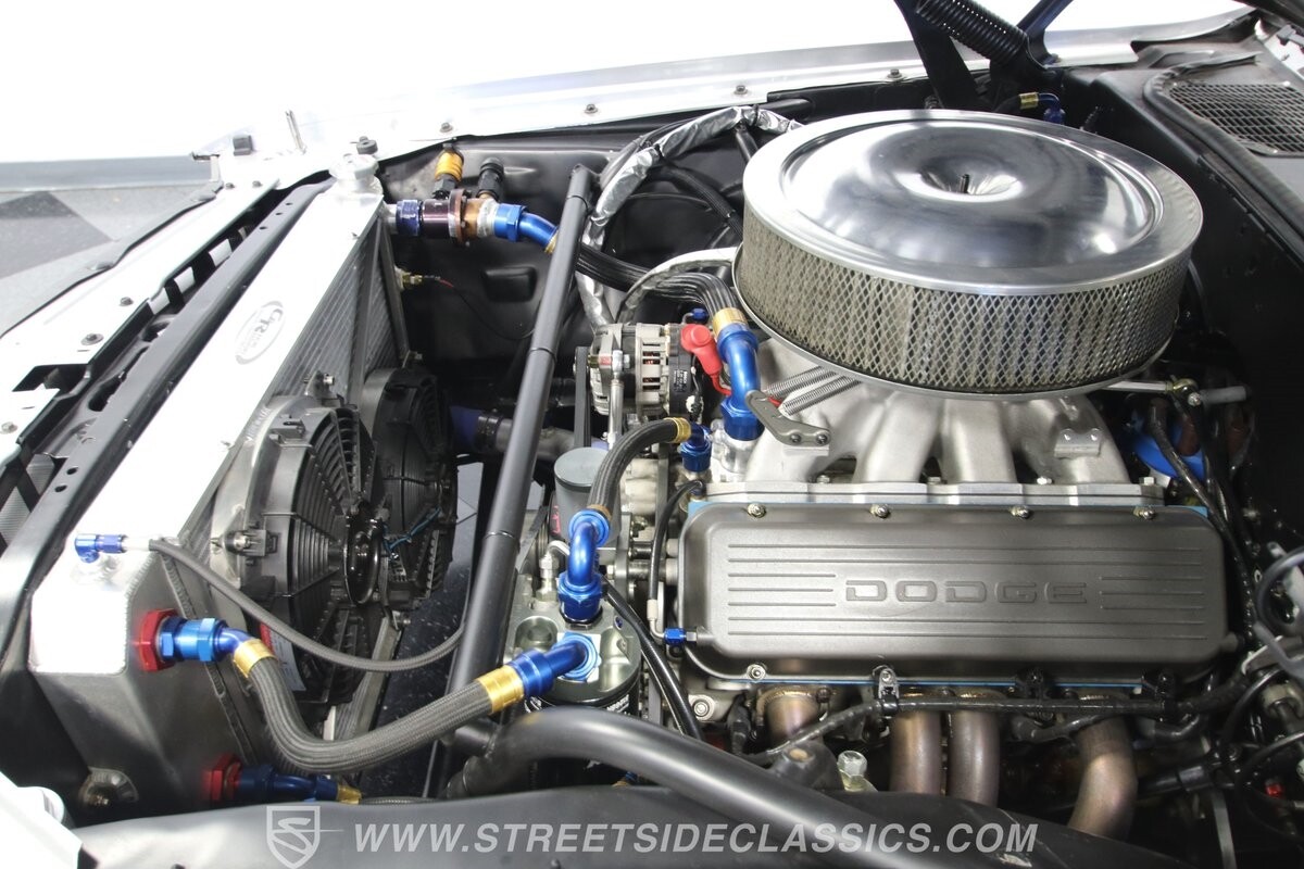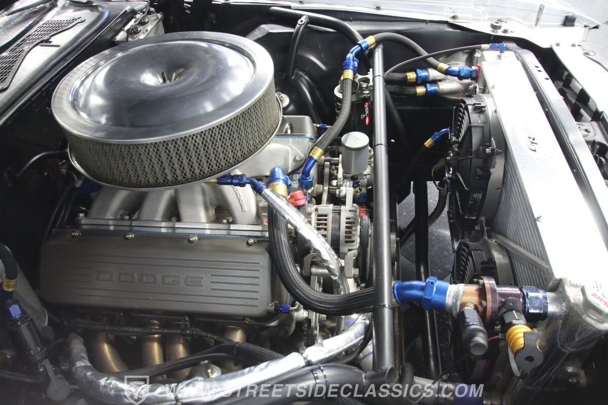 With so few miles on the build, even the clean and mean presentation of the motor really showcases the freshness. This is a legendary 440 cubic-inch V8, and this one was built by the masters at Ernie Elliott, Inc. Oh yes, this one has a true NASCAR pedigree, and the build even utilizes an R5 aluminum racing block. It also has a Holley 850 CFM four-barrel carburetor, high-rise intake, steel braided lines, AN fittings, dual Crane ignition boxes, dry sump oil system, and a C&R racing radiator. Long tube headers add even more power before feeding into an H-pipe dual exhaust with Borla mufflers. The XTRAC sequential six-speed gearbox is a true race-ready piece, and even includes a Tilton five-disc carbon clutch and Quick Time bellhousing. This feeds a Driveshaft Shop carbon fiber driveshaft on its way to the Speedway Engineering floating Ford 9-inch 5.00 rear with TruTrac differential. As you look at the undercarriage photos, you're going to see a serious investment in the suspension with a reinforced tubular front end, thick Schroeder sway bar, and Hyperco rear composite rear leaf springs. Add in power steering, modern ZR-rated tires, and four-wheel disc brakes, and you know this restomod knows how to bring its power to the streets.
