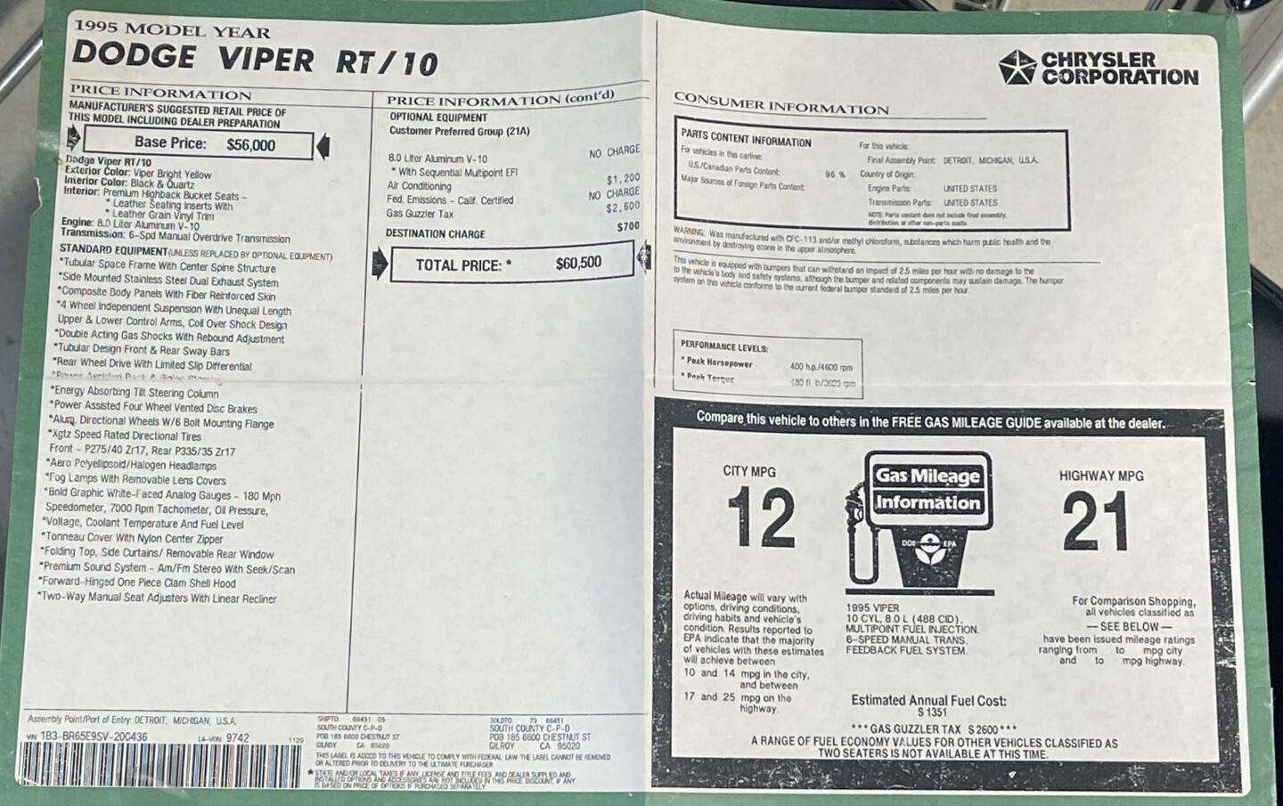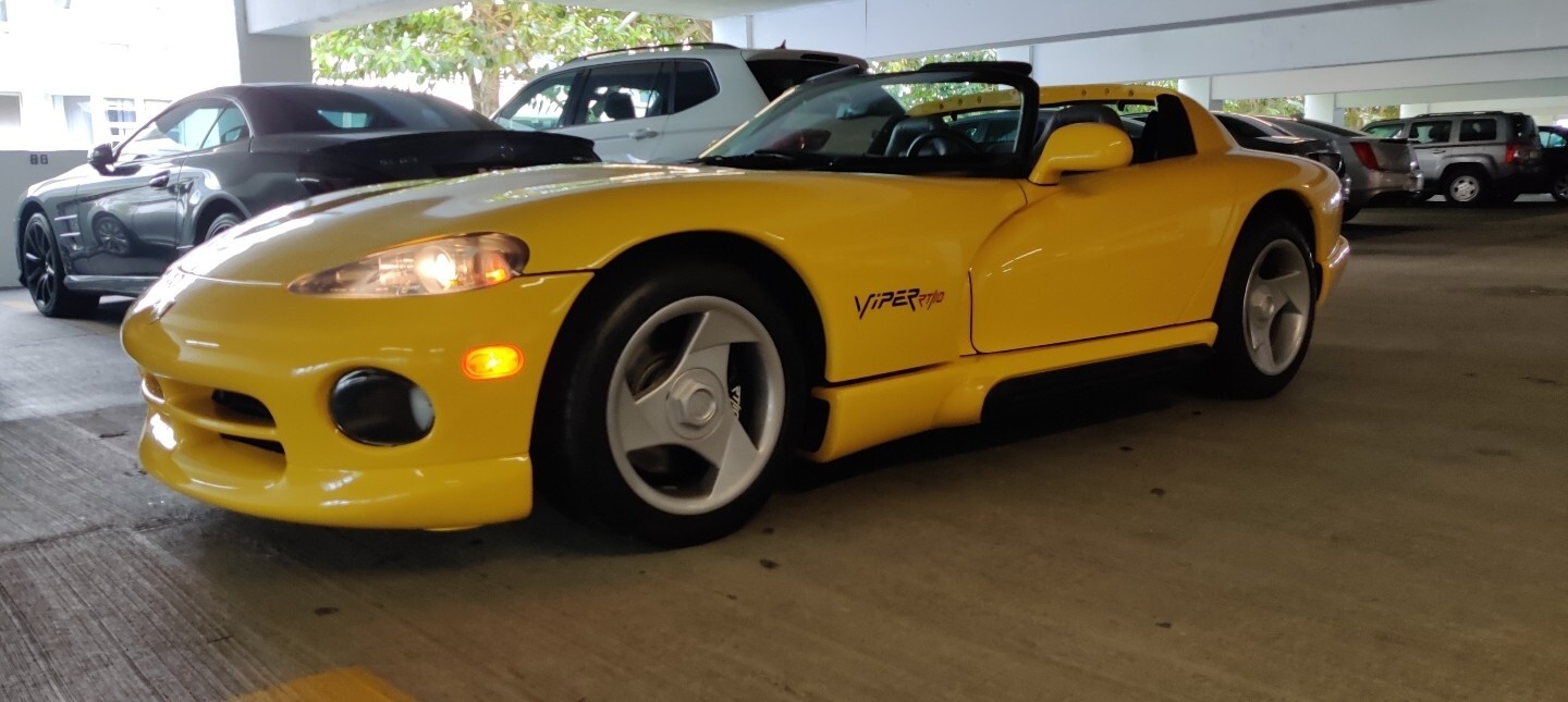 1995 Dodge Viper RT/10 with low miles. Yellow exterior and light gray interior. The car is very clean in and out. Everything works as it should. Clean Carfax and paper car title on hand ready to sell to a new owner. I had bought this beauty from Marino Motorsports at West Palm Beach about two years ago and have barely driven it. This car came with the AC option that a lot of Gen 1 Vipers didn't have. Comes with, both, hard top and also soft top. This beauty will make a nice addition to any car enthusiast. The only imperfections are two spots on the hood (left and mid center) where the paint has dried-out and pilled-off. The car is available for inspection. Feel free to reach out and I'll gladly make myself available. I accept wire transfers and Bank Cashier's checks.