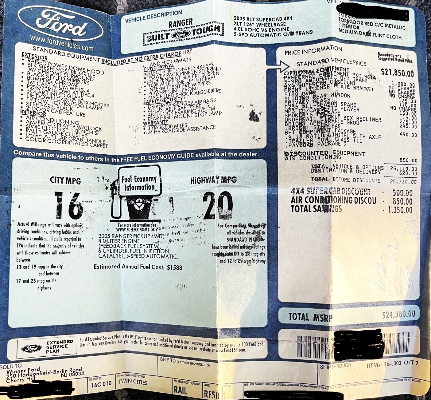 2005 Ford Ranger XLT,supercab,4WD,V6,automatic transmission. A very low mileage truck that was cherished by one family since it was brand new. The truck runs and drives very nicely.The A/C is cold and everything works like it should.The tires are like new.All original except for a modern touch screen pioneer stereo/cd player.The truck recently had an oil change and 4 brand new shocks were installed.Valid NJ inspection sticker that is good until next year.The body and paint of this truck are in amazing condition.The interior is excellent except for a tiny flaw on the driver seat and some minor wear. The front bumper has some peeling chrome in two areas.The clearcoat on the aluminum wheels has a few peeling areas.See the original window sticker for equipment and options.I aquired this truck recently making me the 3rd titled owner.The 50k orig miles are true and documented by the vehicle history.No dash warning lights and no leaks.It is a 20 year old used truck that will be sold as is.Clean NJ Title.